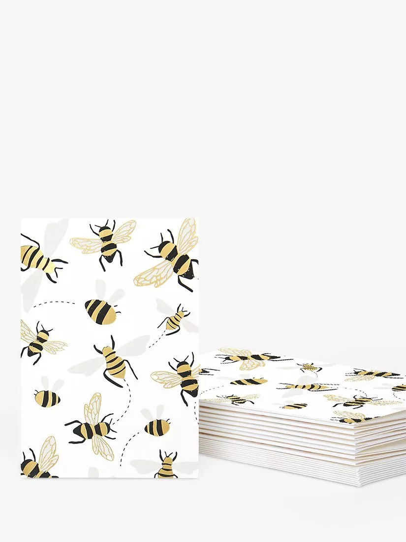 A set of 10 cards and envelopes in a sweet, lux foil bee design. Each notecard is blank inside. This card has been printed on board using a low chlorine pulp and can be recycled.