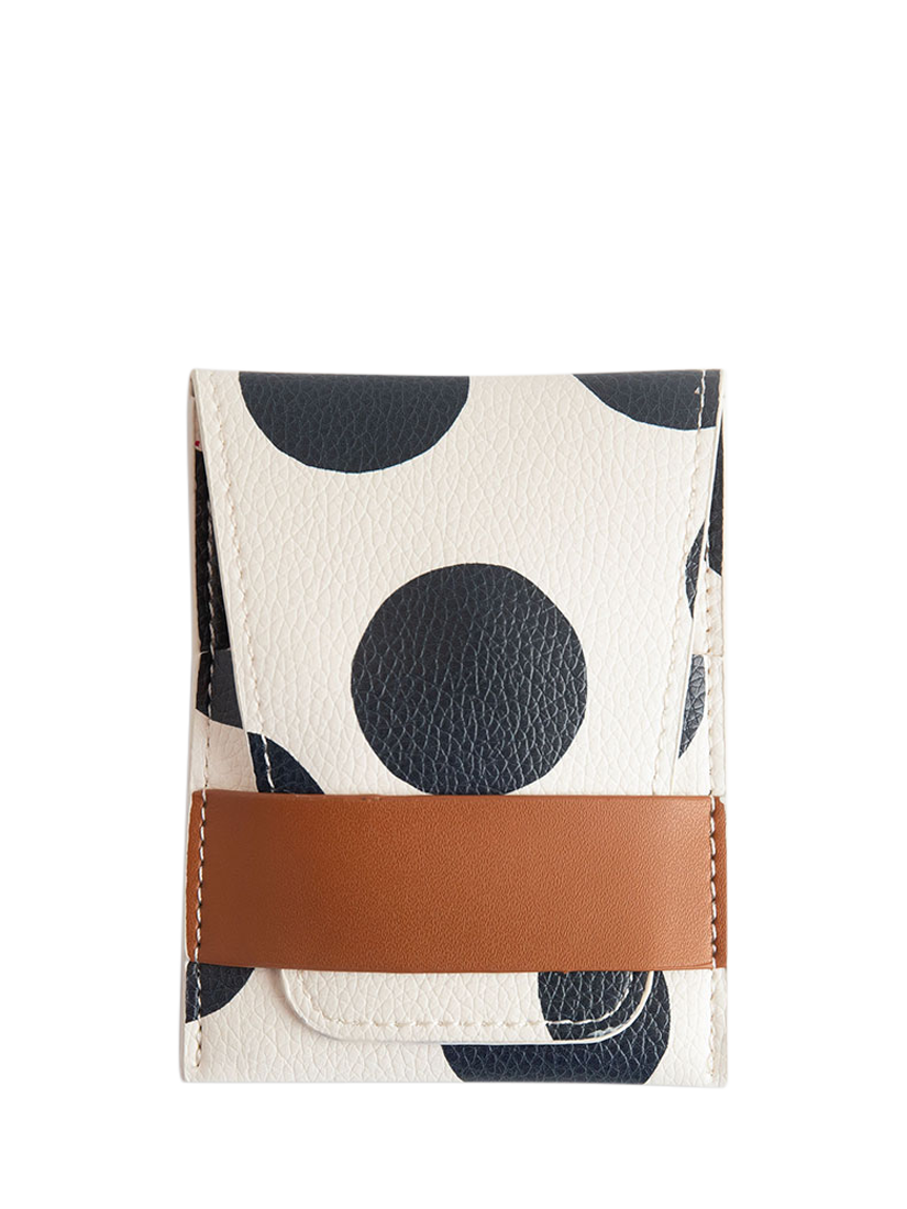 Handy manicure set including nail clippers, precision scissors, a glass nail file, and a versatile cuticle tool. Designed to deliver impeccable grooming results, this set combines style and functionality in a scattered dot case.