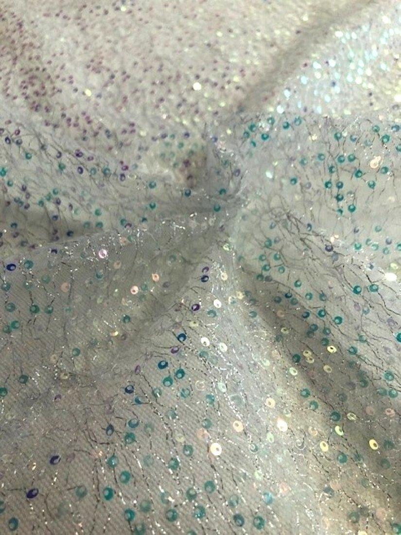 Turquoise and purple iridescent sequins on stretch tulle with silver threaded detail.