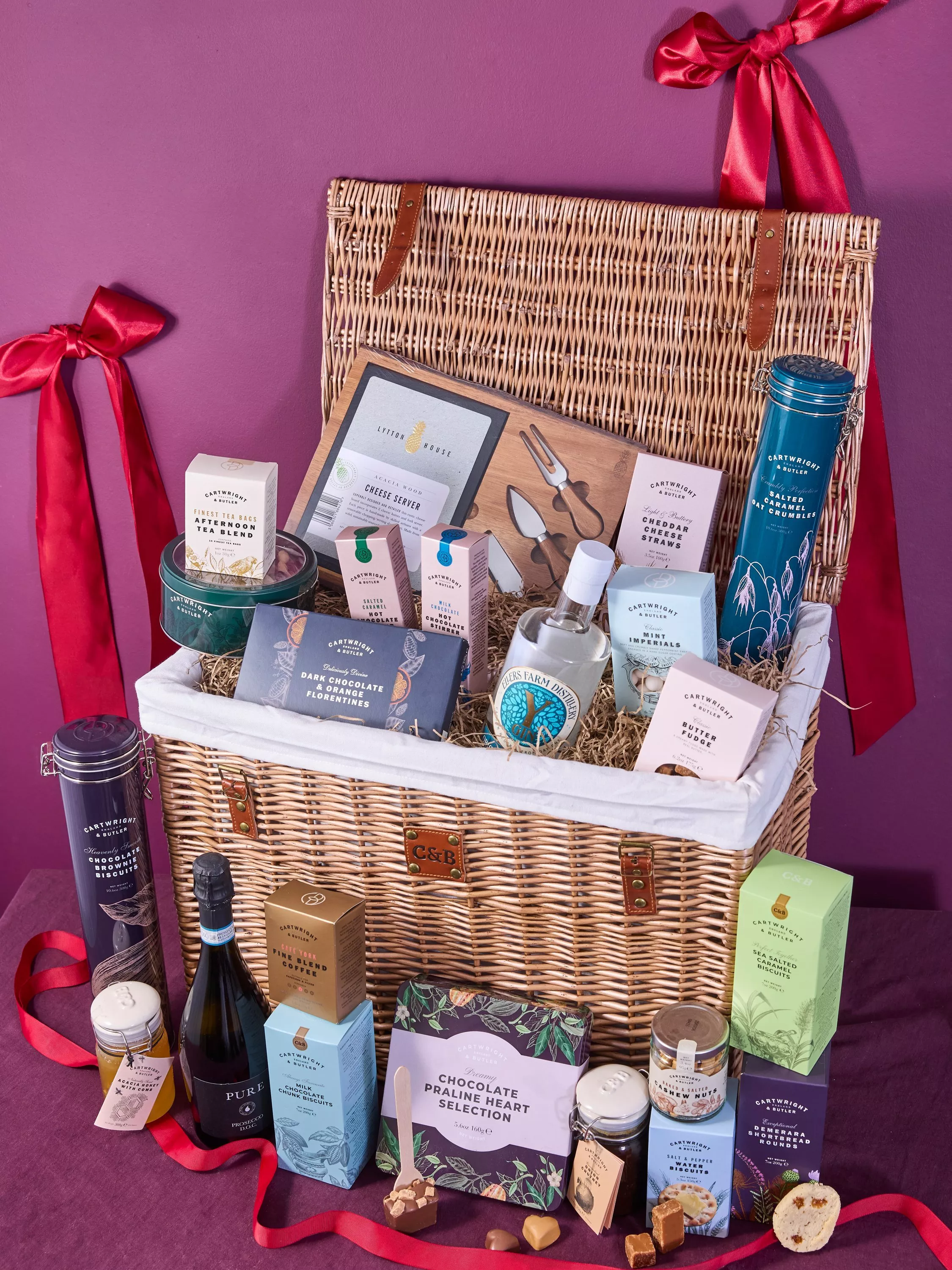 The Luxury Grand Harrogate Hamper contains a feast fit for a family, or a group of friends. Bursting with Cartwright & Butler's finest luxury treats, snacks and spirits, presented in a beautiful steamed natural wicker basket this exquisite hamper is perfectly made for sharing. Containing fine treats such as luxurious praline heart chocolates, crumbly salted caramel biscuits, rich and decadent brownie biscuits, Ellers Farm Gin, fine chocolate Florentines, bubbly Pure prosecco... and the list goes on!