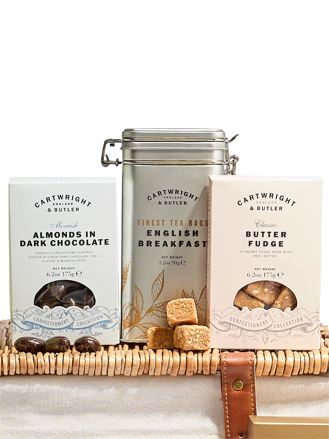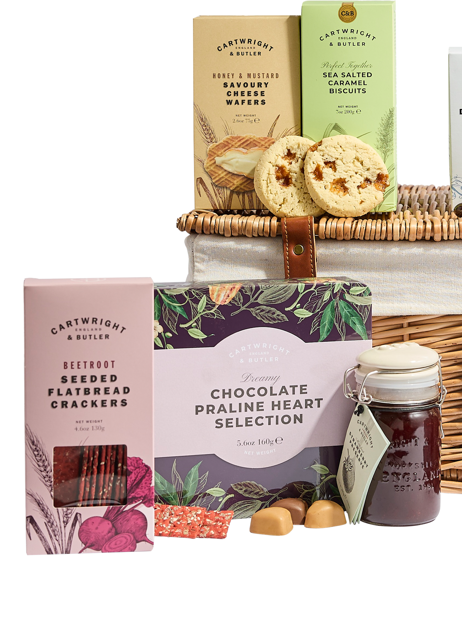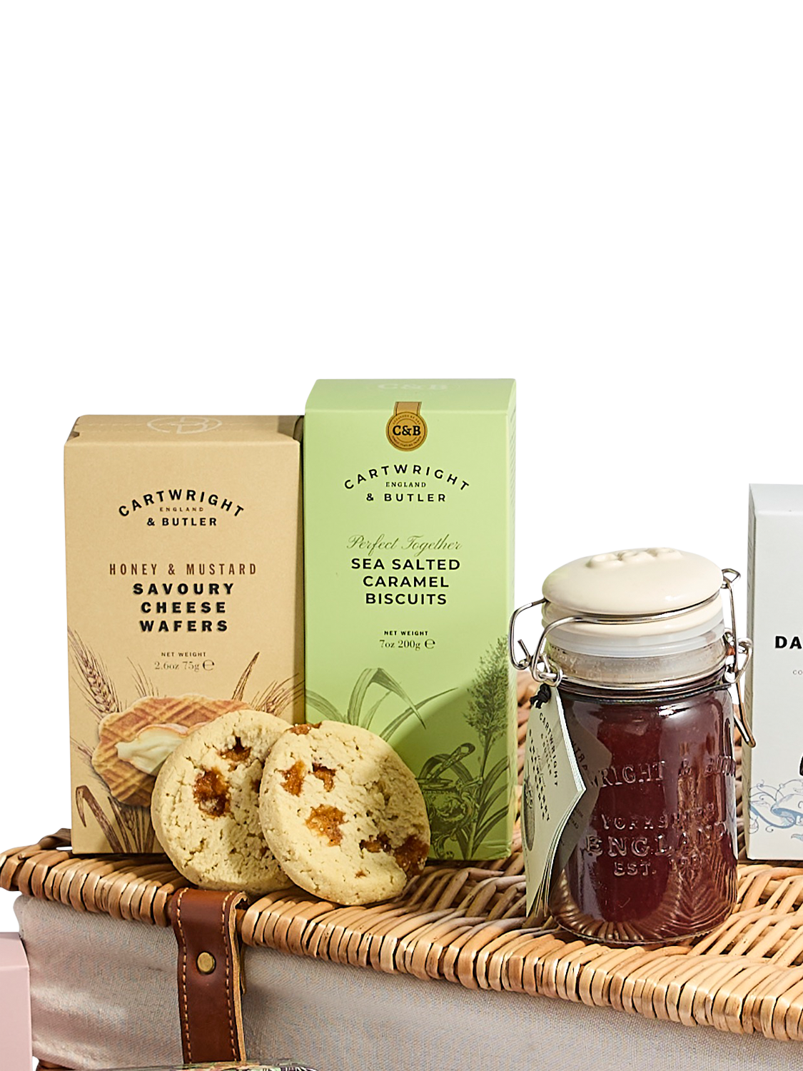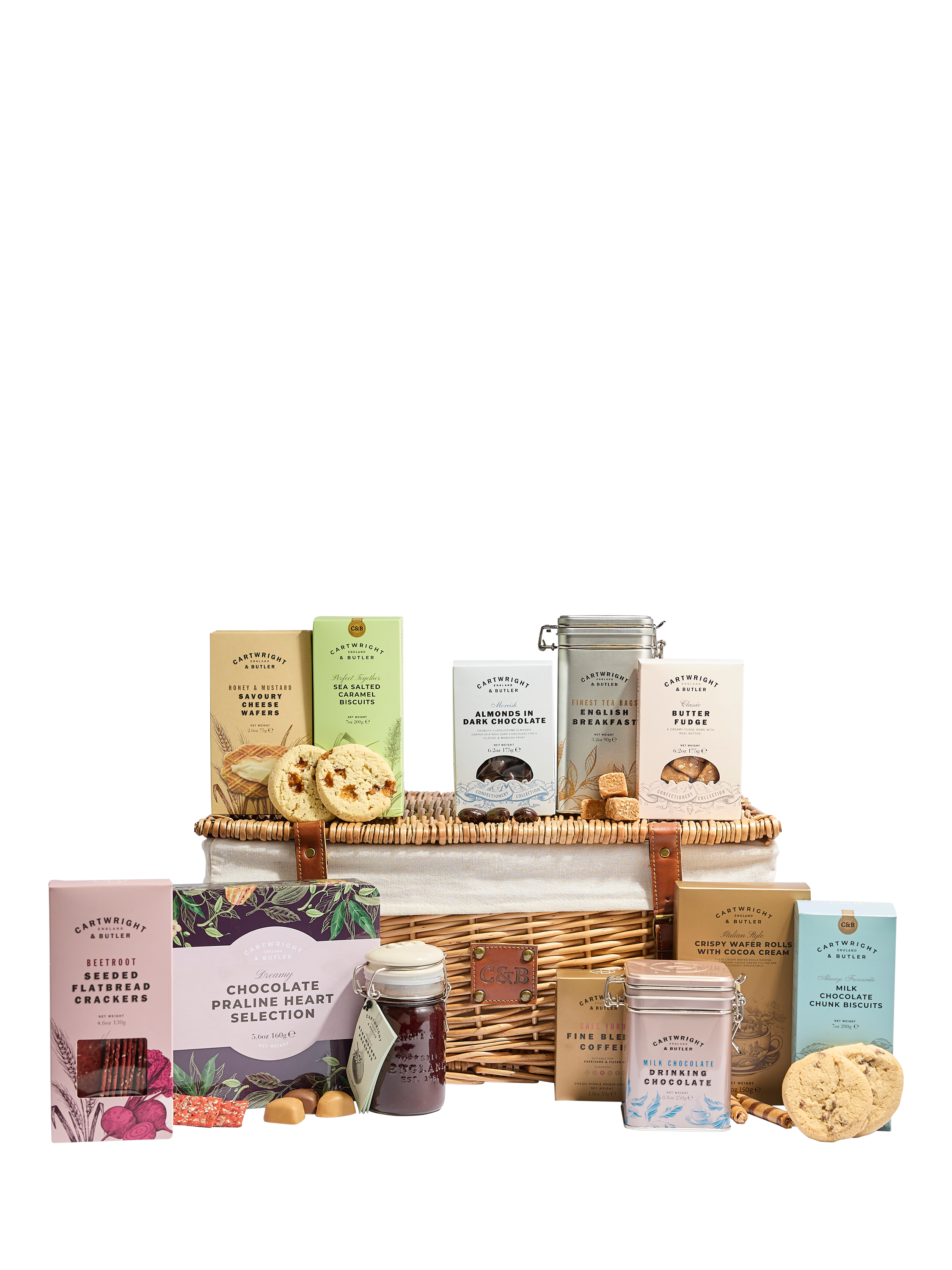 The Ultimate Night In hamper is a delightful selection of Cartwright & Butler's finest treats, presented in a beautiful wicker basket.