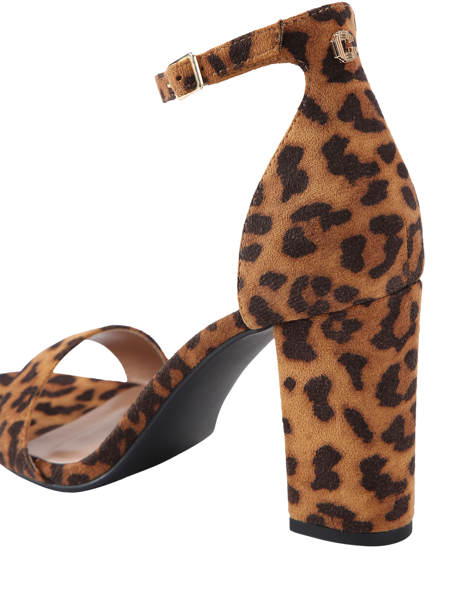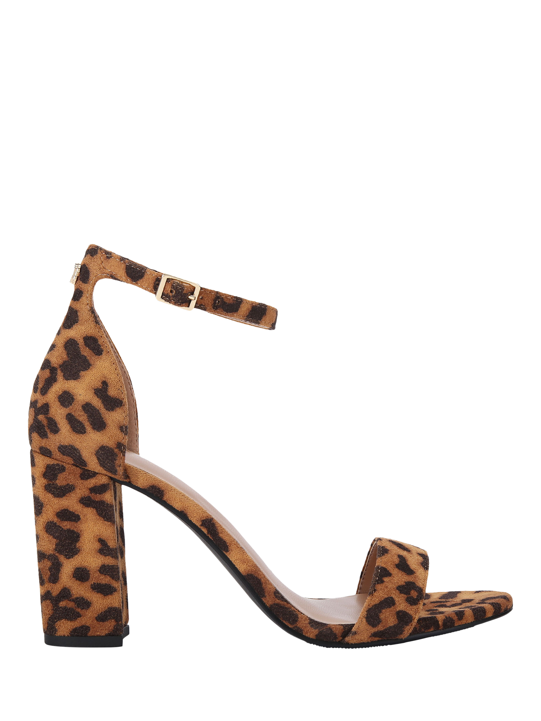 A pair of leopard print heeled Carvela sandals. The supportive block heel and adjustable strap deliver lasting comfort, while the open almond toe keeps you feeling cool and confident.