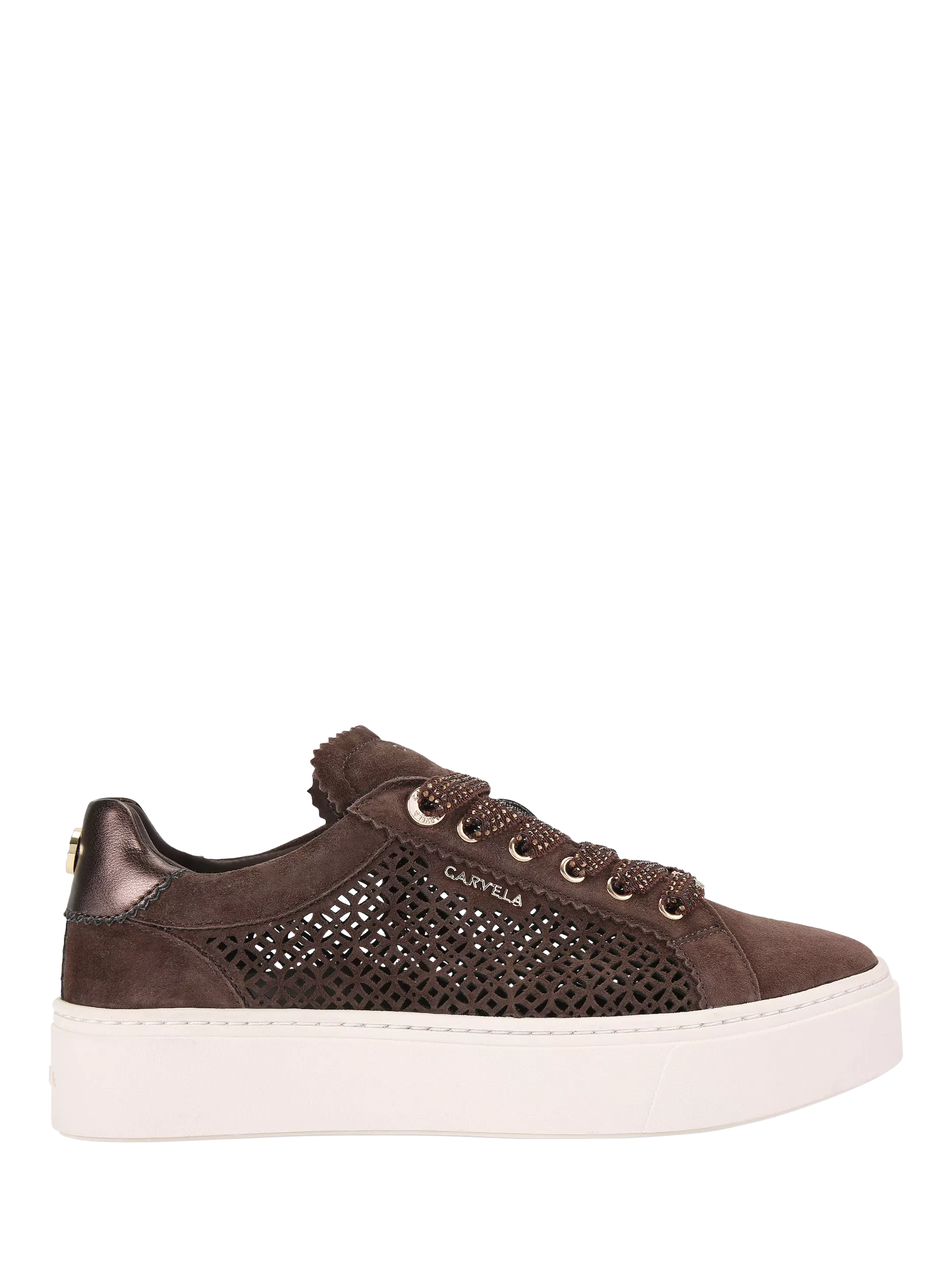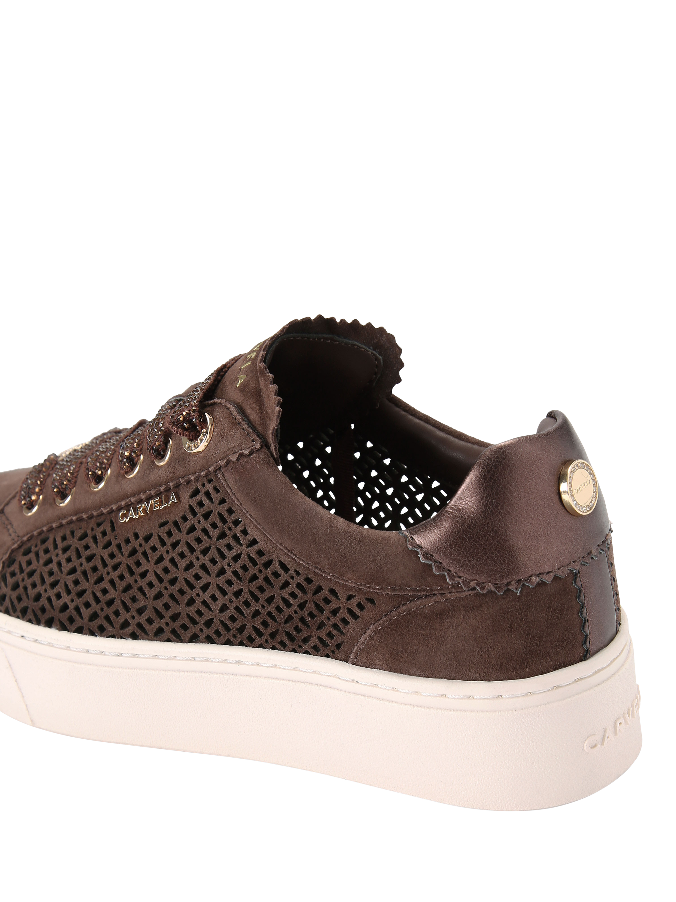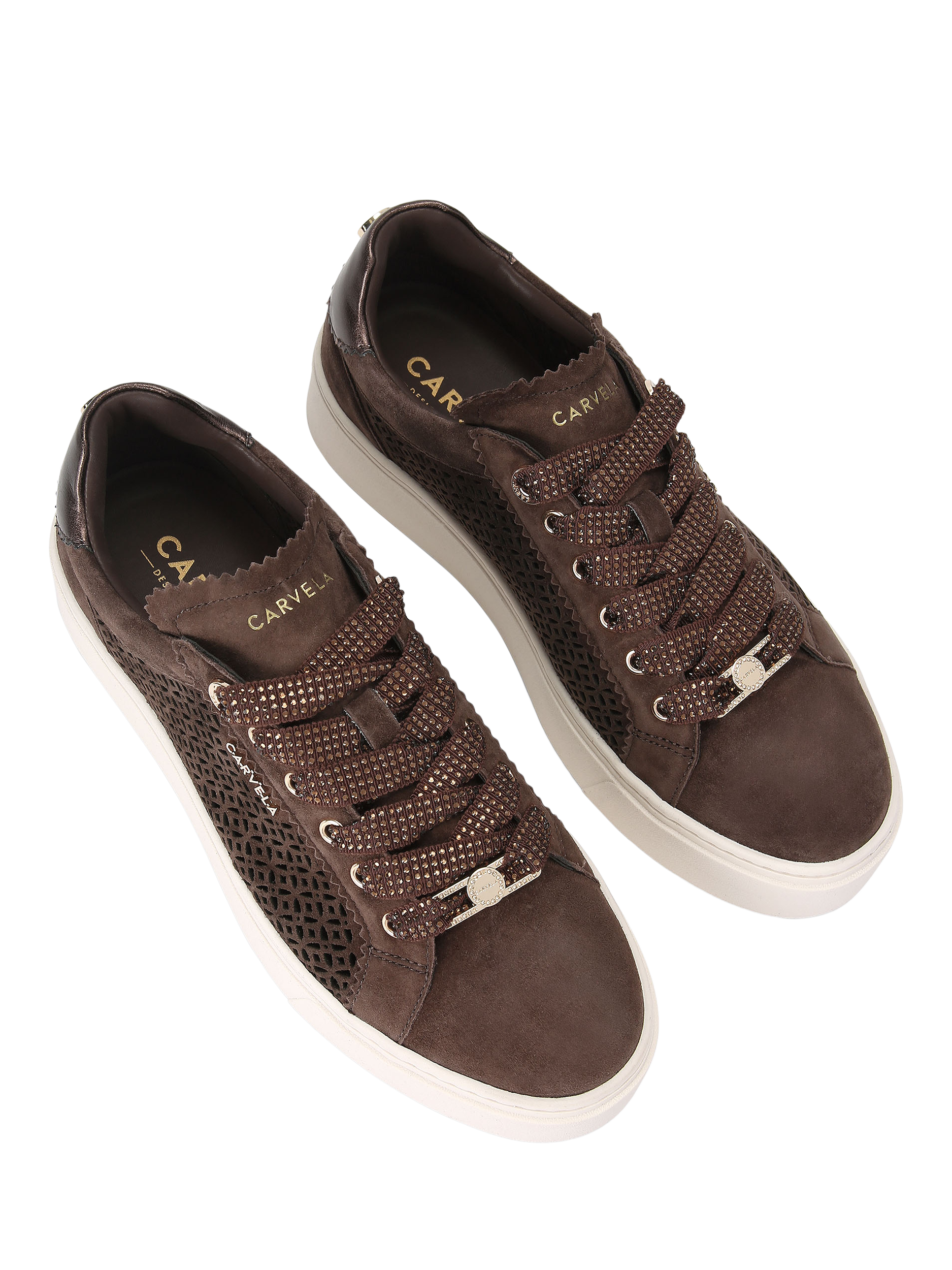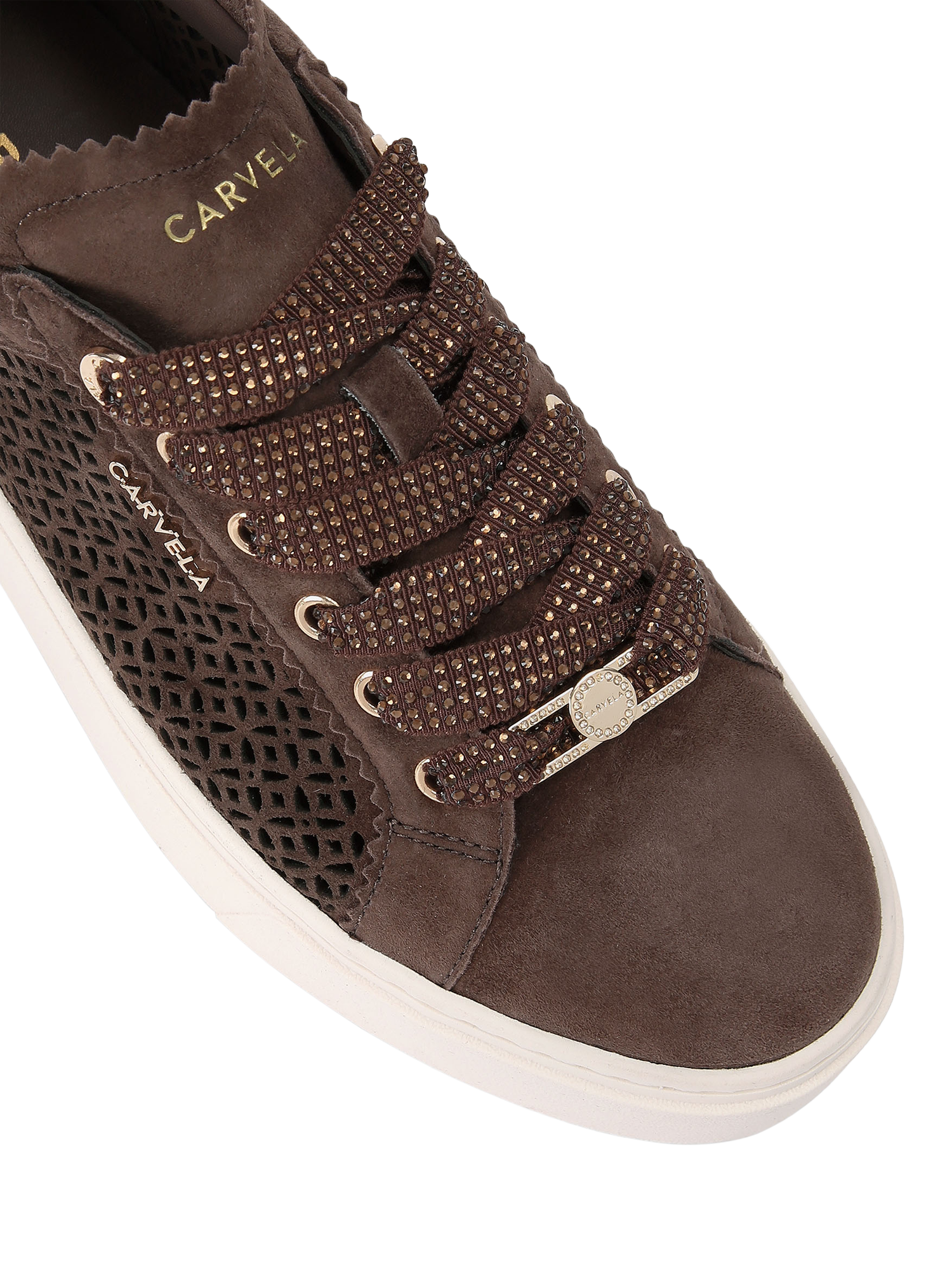 This pair of Caprese Laser Trainers features a microsuede upper with cut-out sides. The front is laced up with crystal embellishment and gold-tone branding details.