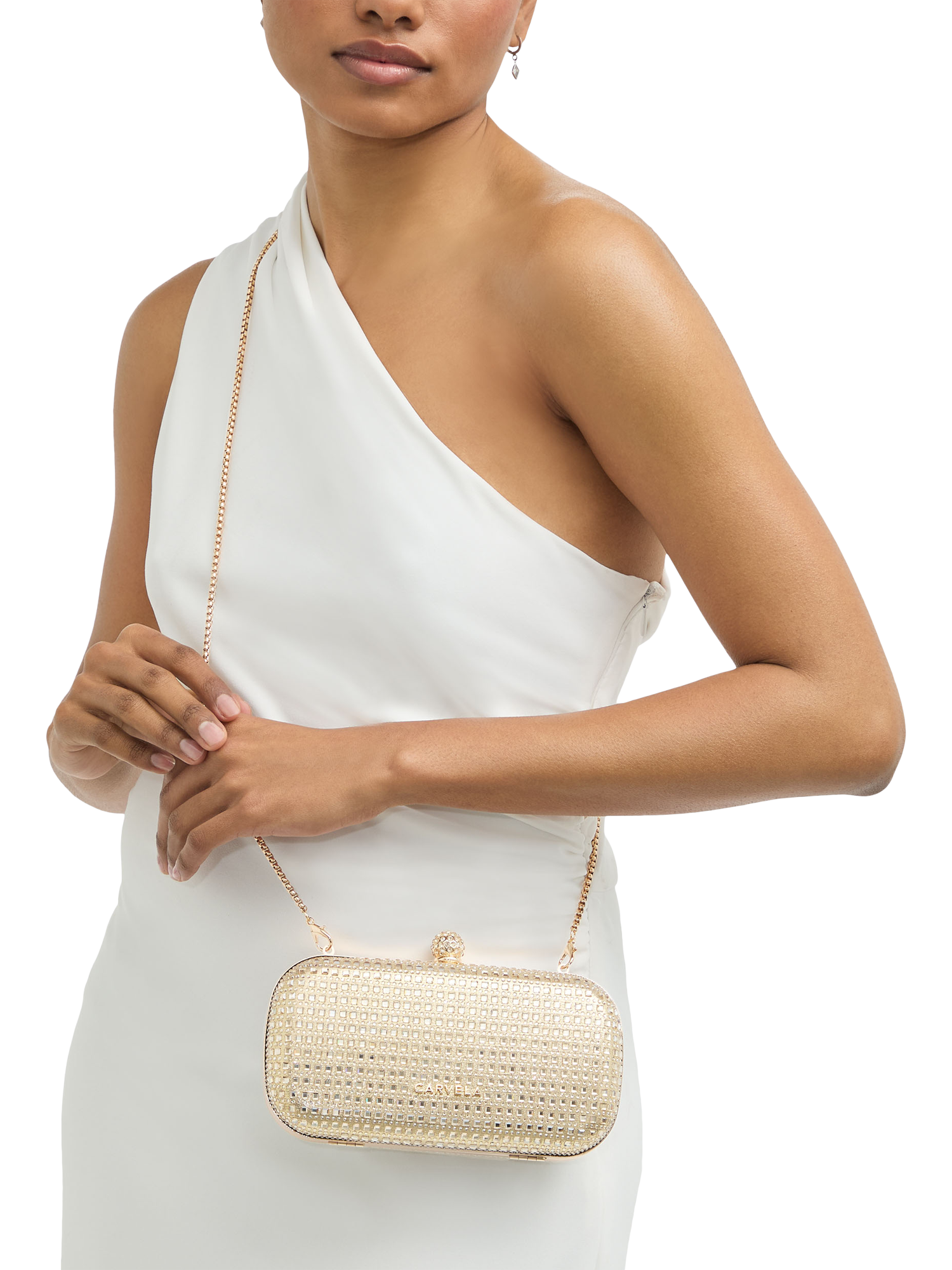 The Cecilia hard clutch bag is available in a variety of finishes. Complete with a chain strap for easy hands-free convenience and a crystal on the clasp. Ideal for all your going-out essentials.