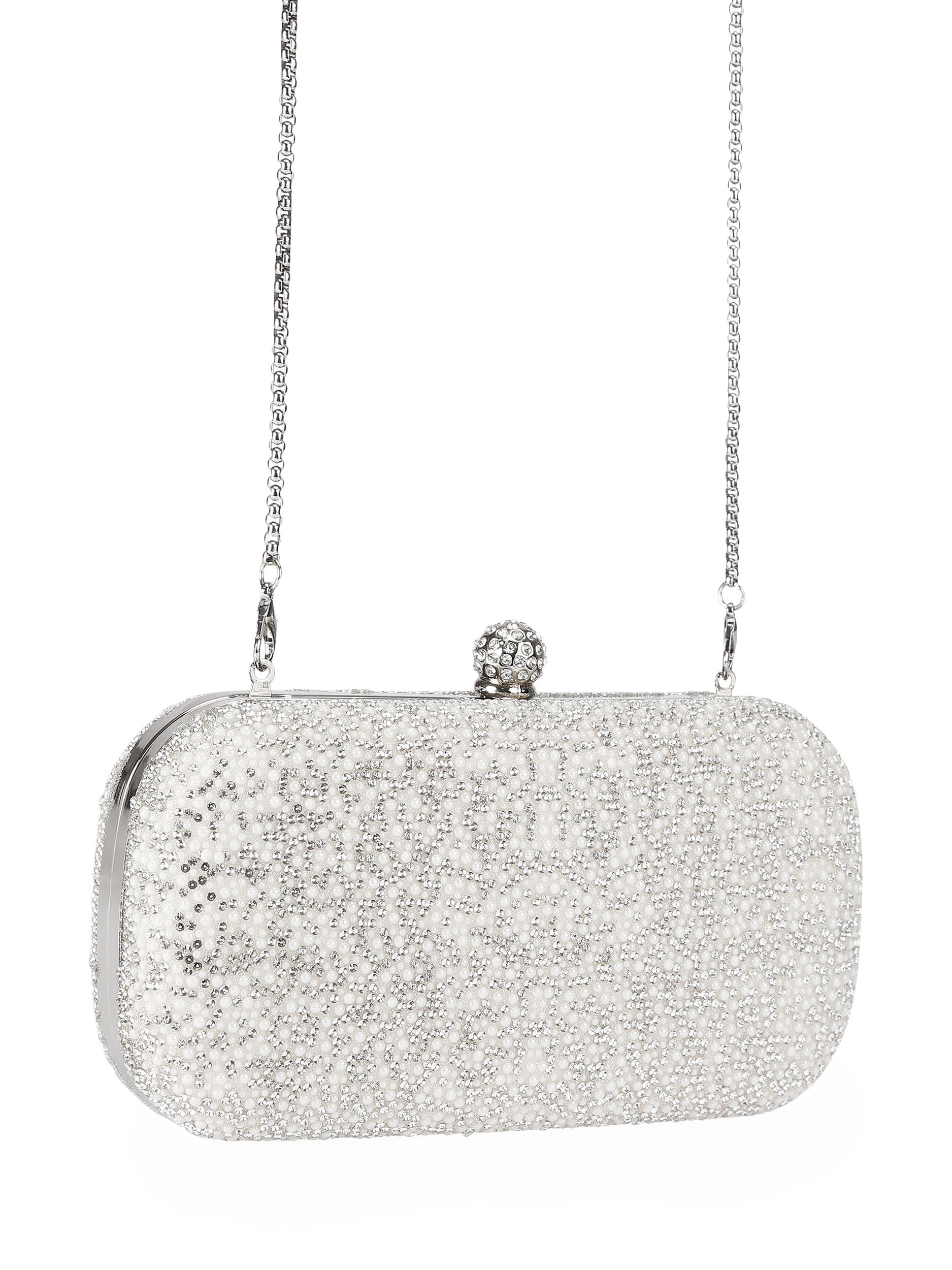 The Cecilia hard clutch bag is available in a variety of finishes. Complete with a chain strap for easy hands-free convenience and a crystal on the clasp. Ideal for all your going-out essentials.