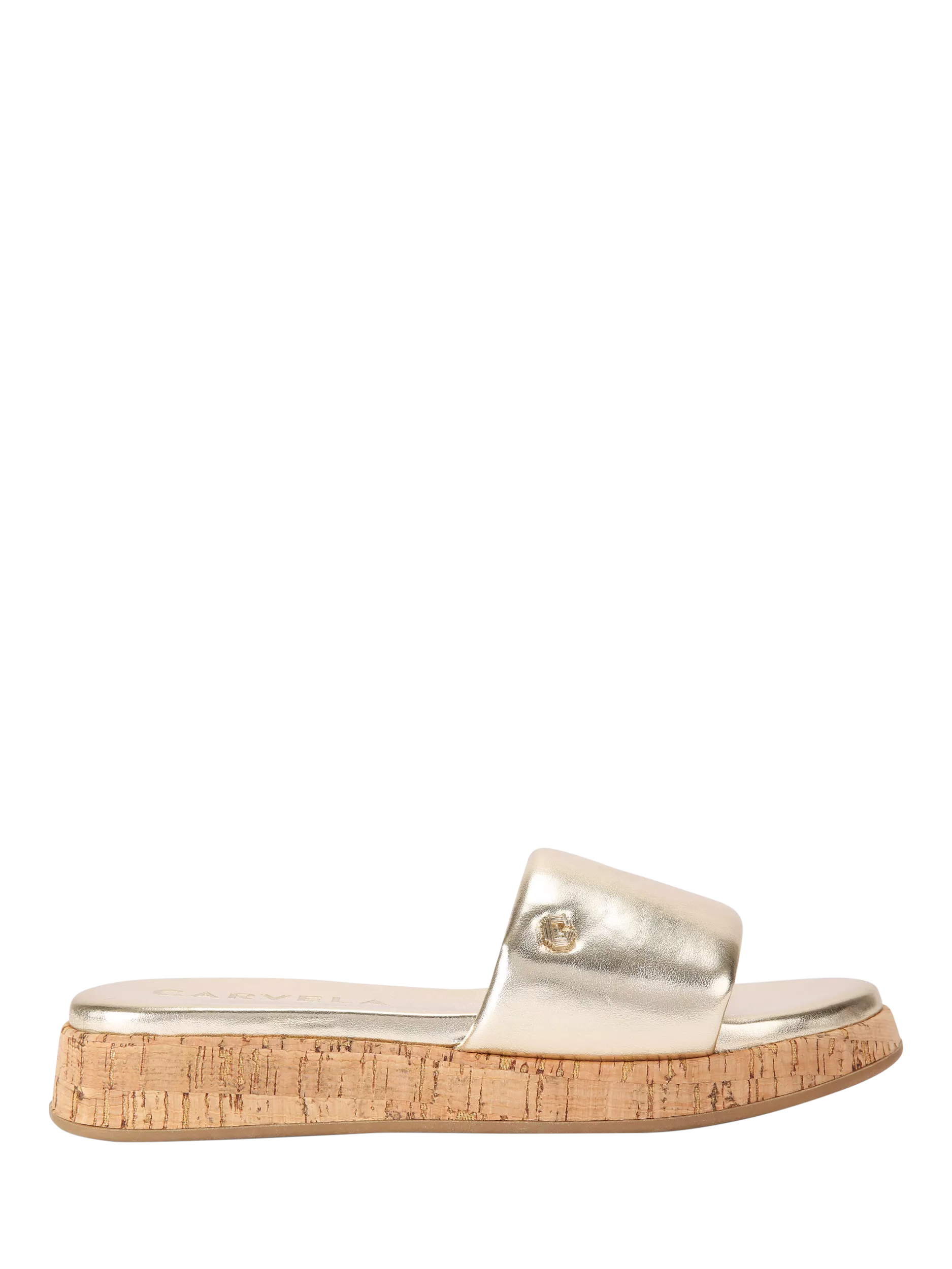The Cloud Mule features a gold upper with a plush pillow feel. There is a small, Icon C stud on the outer side and the sole features a cork effect.