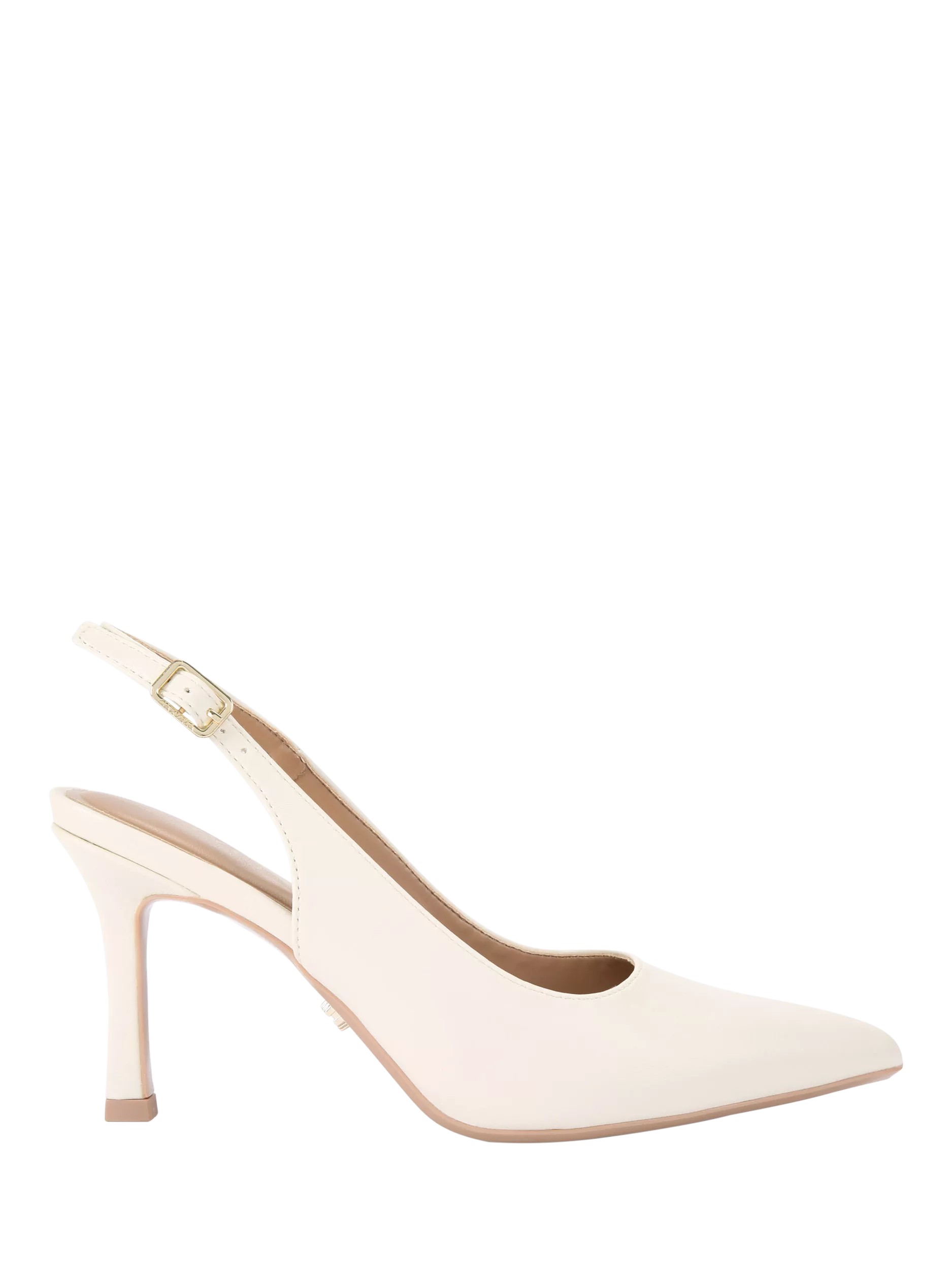 A pair of sleek slingback court shoes, featuring a high flared heel and a pointed closed toe. The wide fit ensures comfort all evening, while the buckle fastening offers a secure, customisable feel.