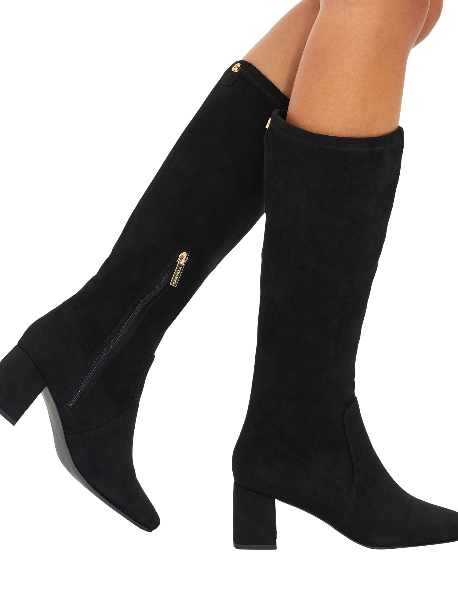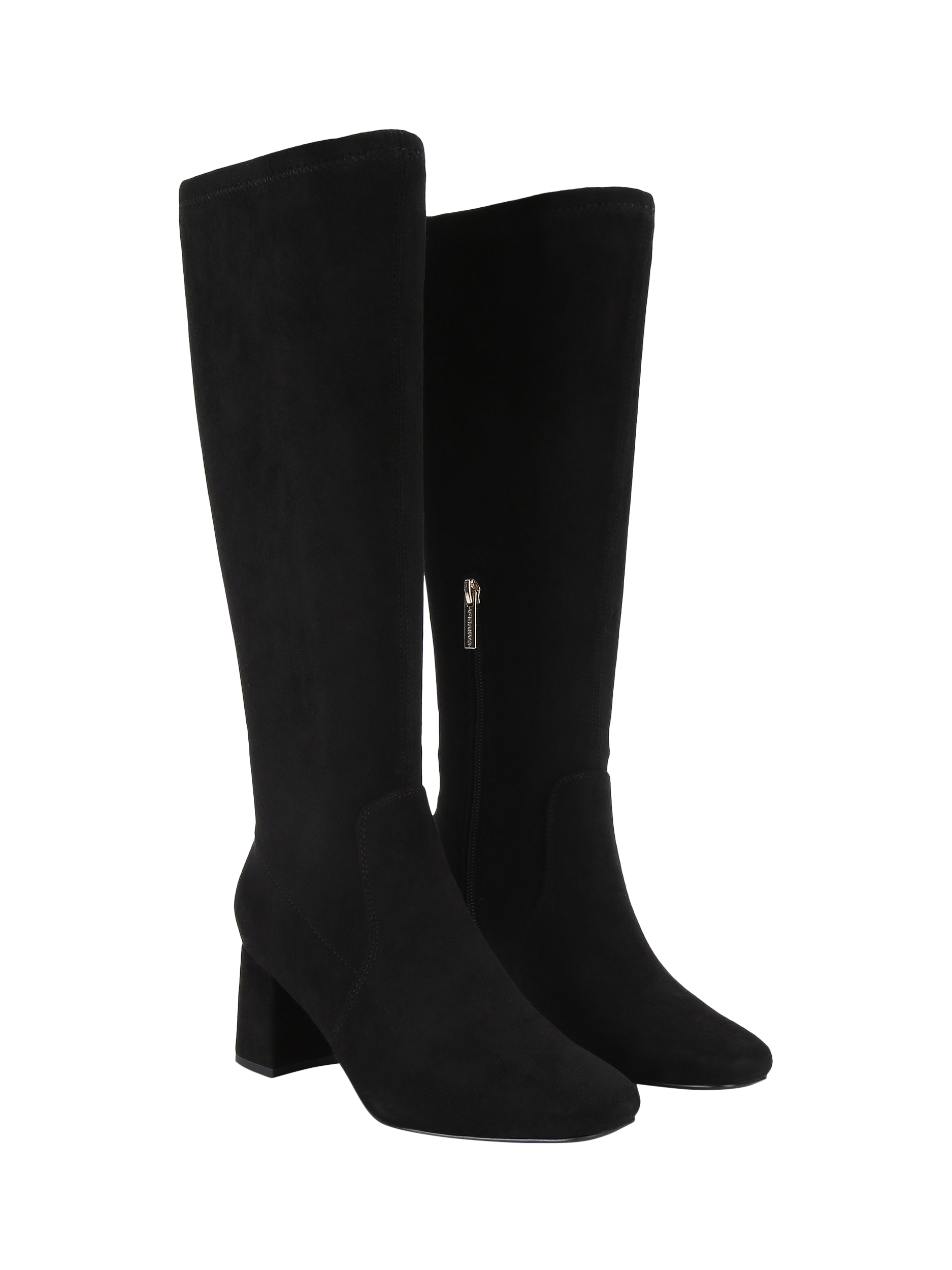 This Corsano boot is a knee-high style with a microsuede upper and a soft shaft. The toe is softly squared, and the heel is in a block style.