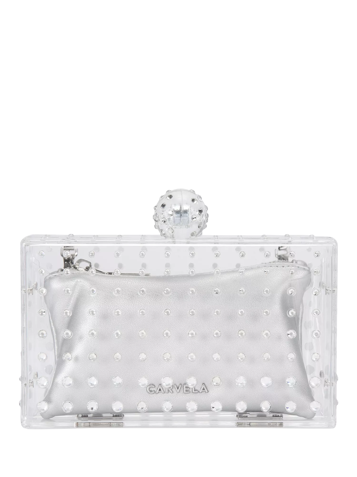 An embellished clutch from Carvela. Perfectly simple and keeping all your evening essentials close, the practical clasp keeps everything secure, making your evening effortless.