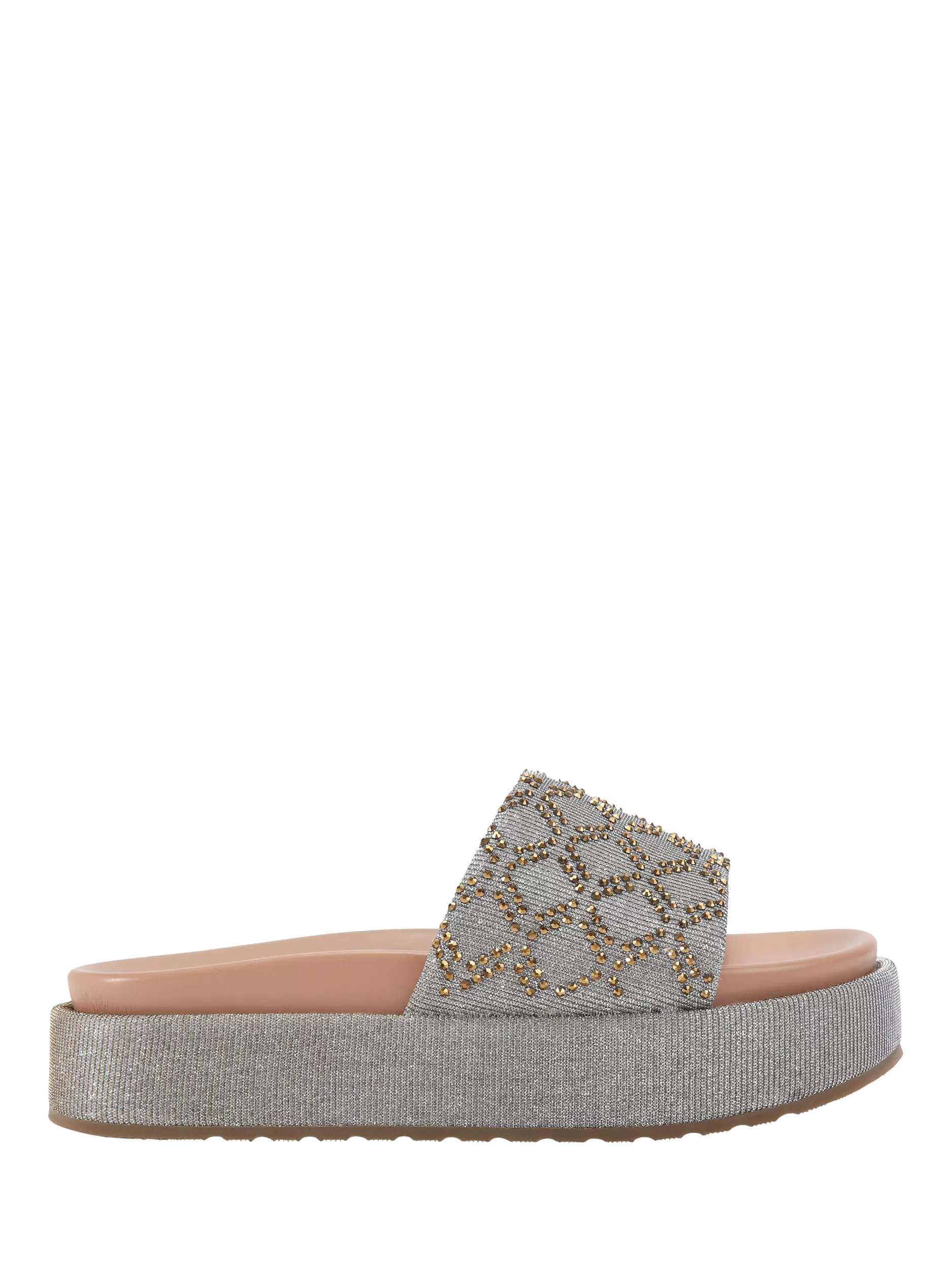 From Carvela, these Estella flatform sliders are presented with a metallic fabric upper embellished with bronze crystals across the wide strap.