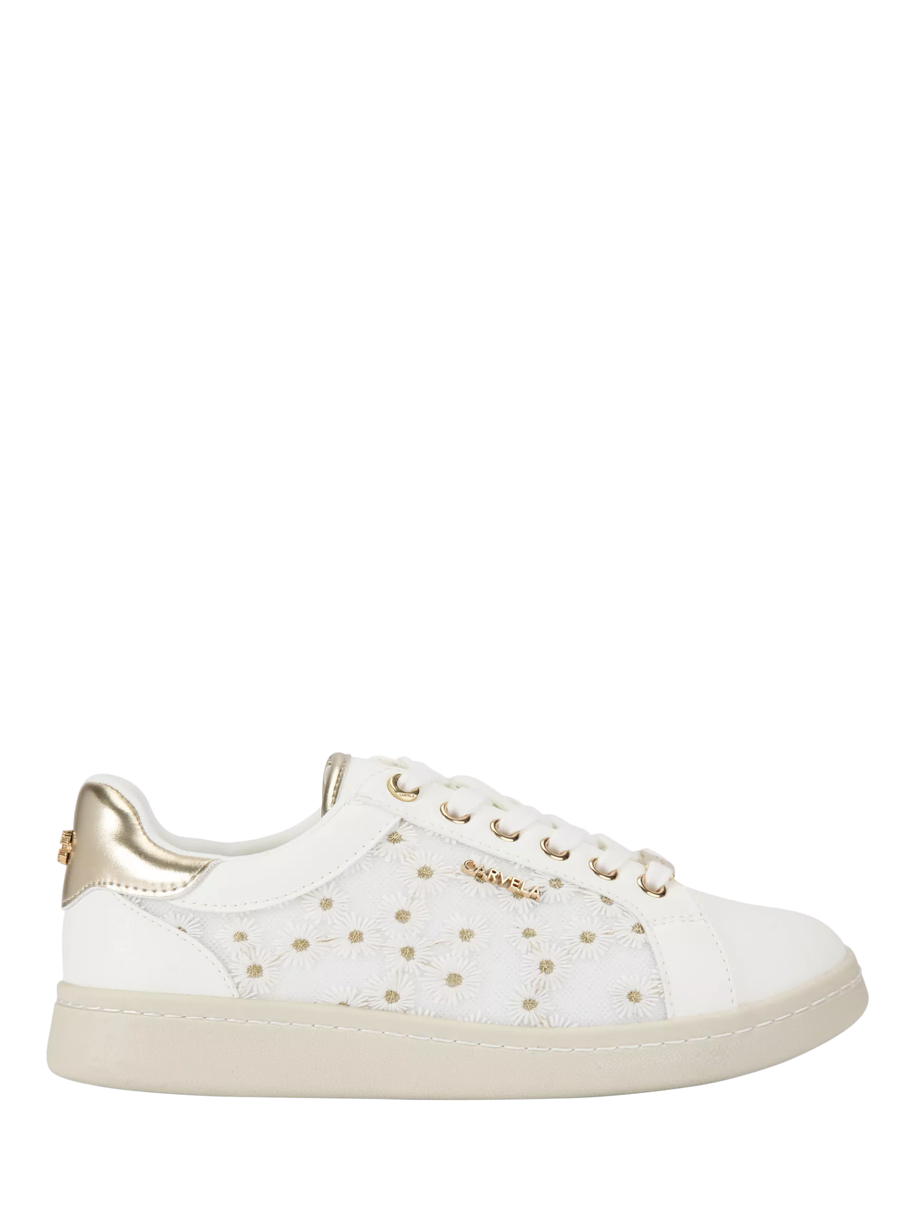 From Carvela, this Friora trainer is crafted from a white upper with mesh panels at the side embellished with small white daisies. The front is laced up with gold eyelets.
