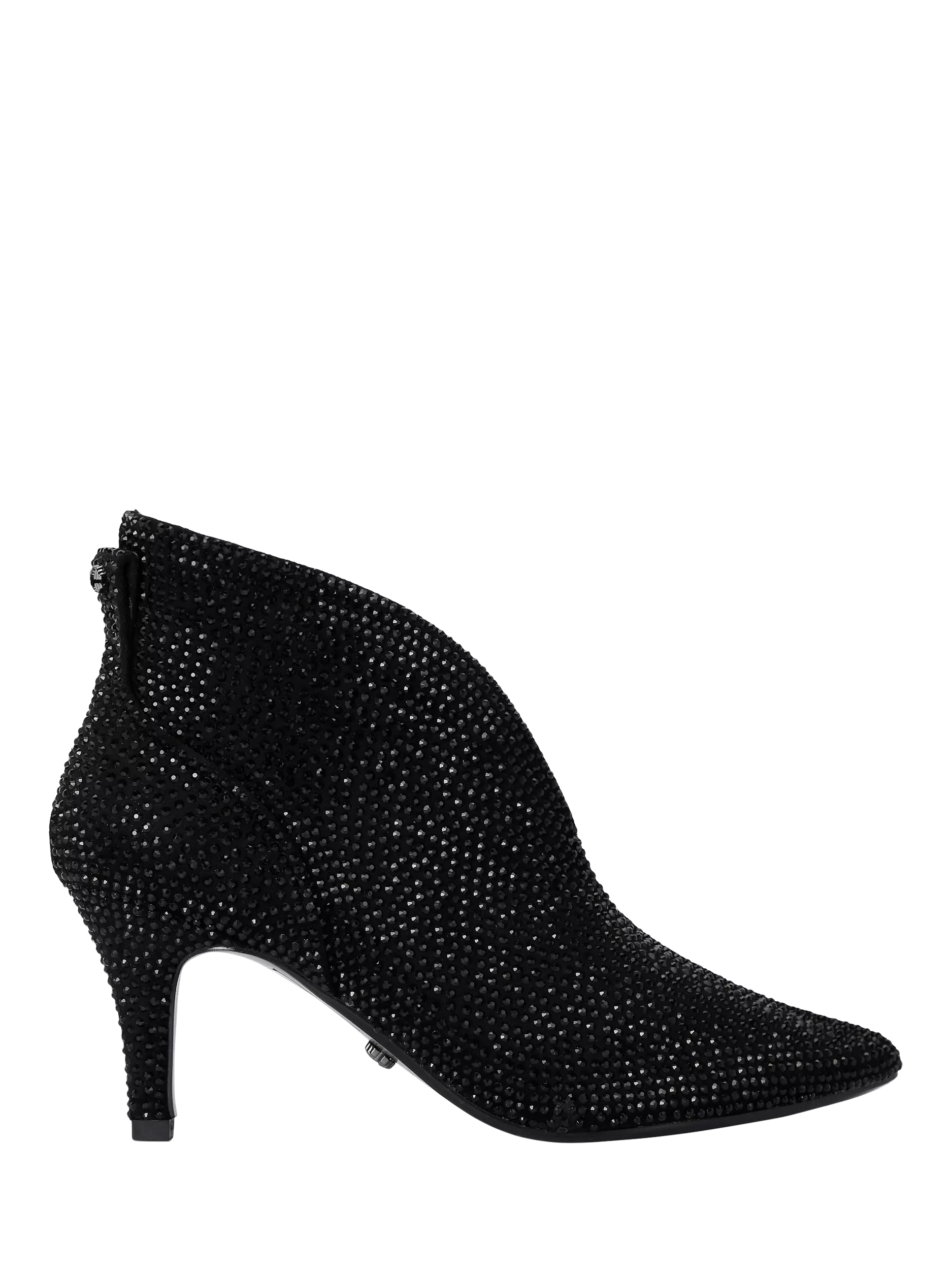 The Flute Boot from Carvela has a black microsuede upper with all-over black crystal embellishment. There is a small tab at the back of the ankle with a micro Icon C stud.