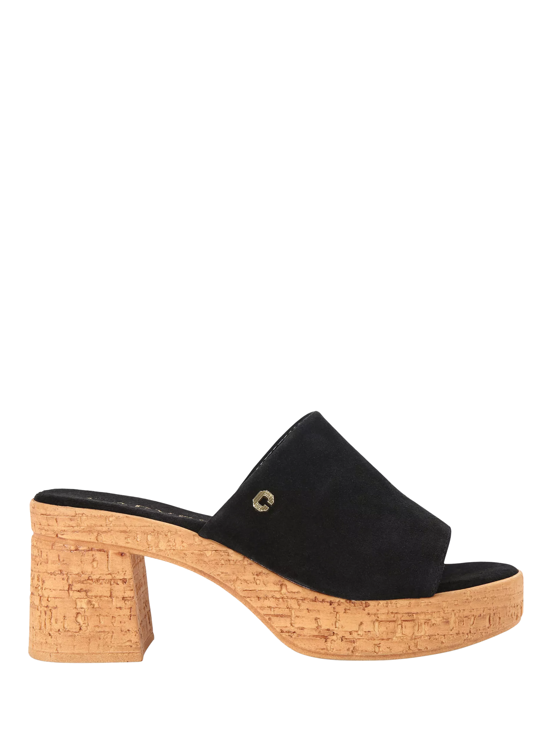 This Genova sandal is crafted from suede with a small gold Icon C stud on the outer side of the shoe. The sole cork effect with a platform on the front and completed with a block heel.