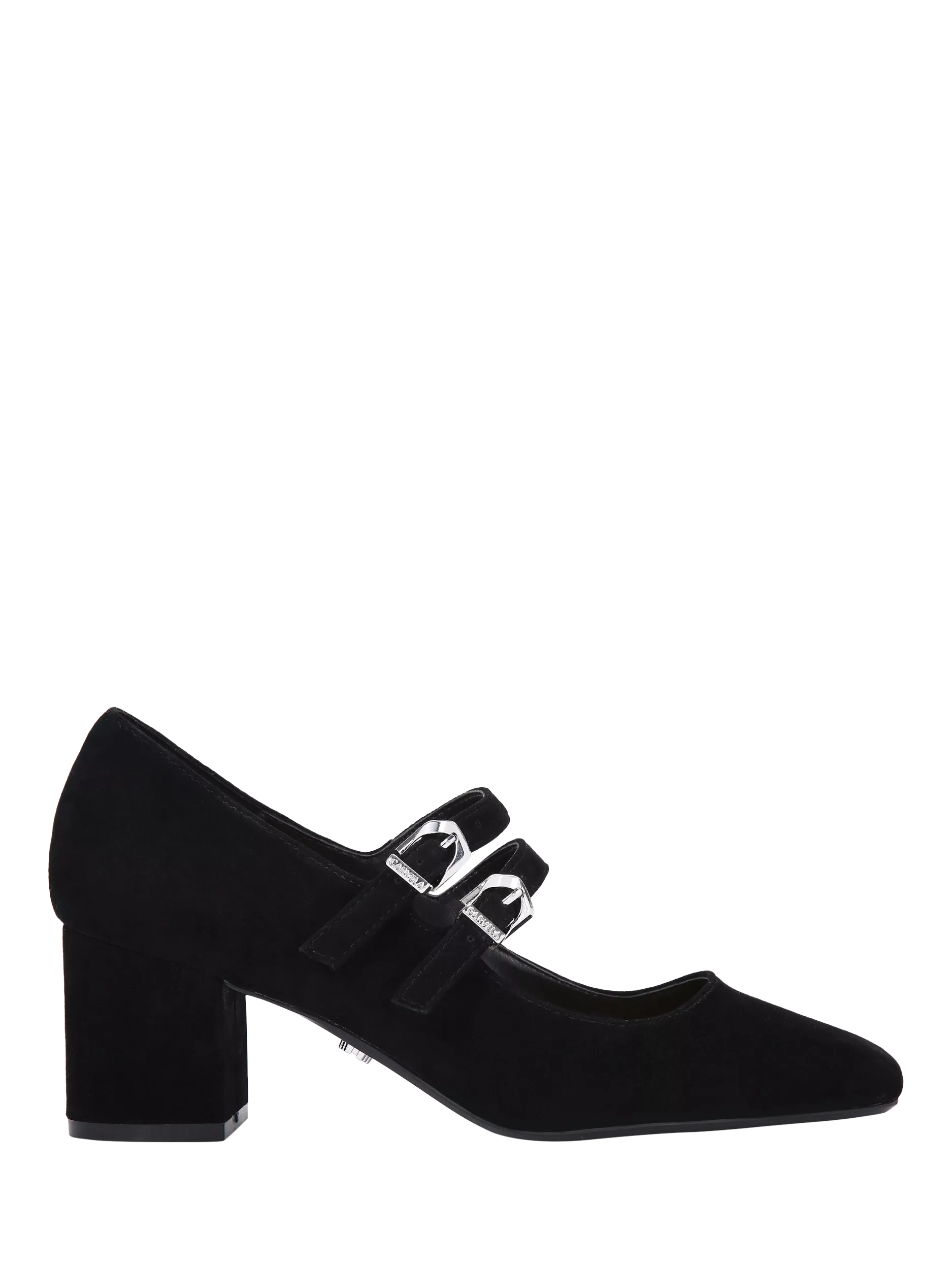 The Harper is a Mary Jane-style shoe with a block heel. The upper is in black suede with two straps across the foot, fastened with silver branded buckles.