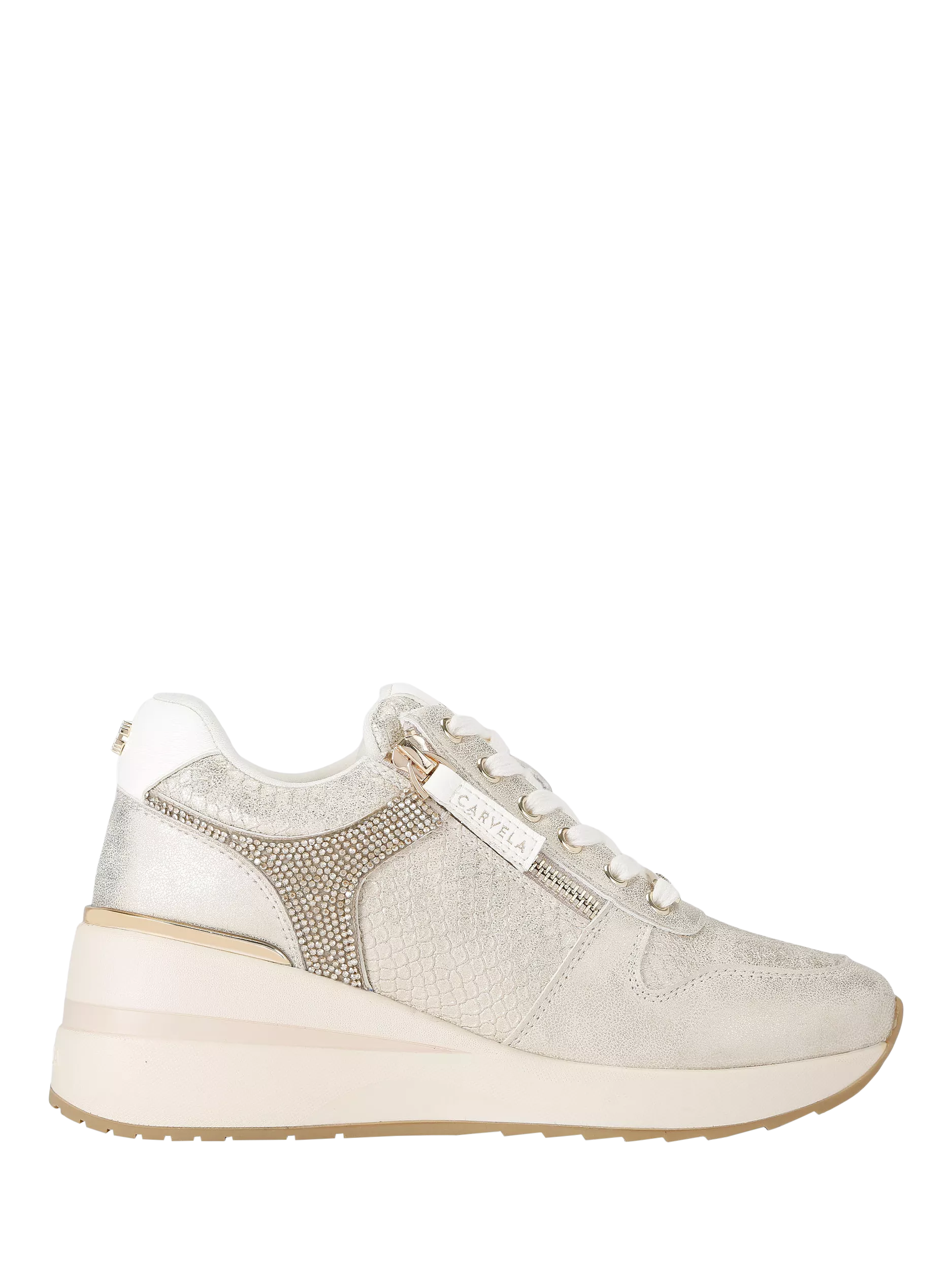 Lending a contemporary finish to your off-duty edit, this pair of chunky trainers by Carvela is rendered in a long-lasting uppers with crystal-embellished side panelling. Sitting on a wedge heel with a side zip, they are rounded off with a simple closed toe.