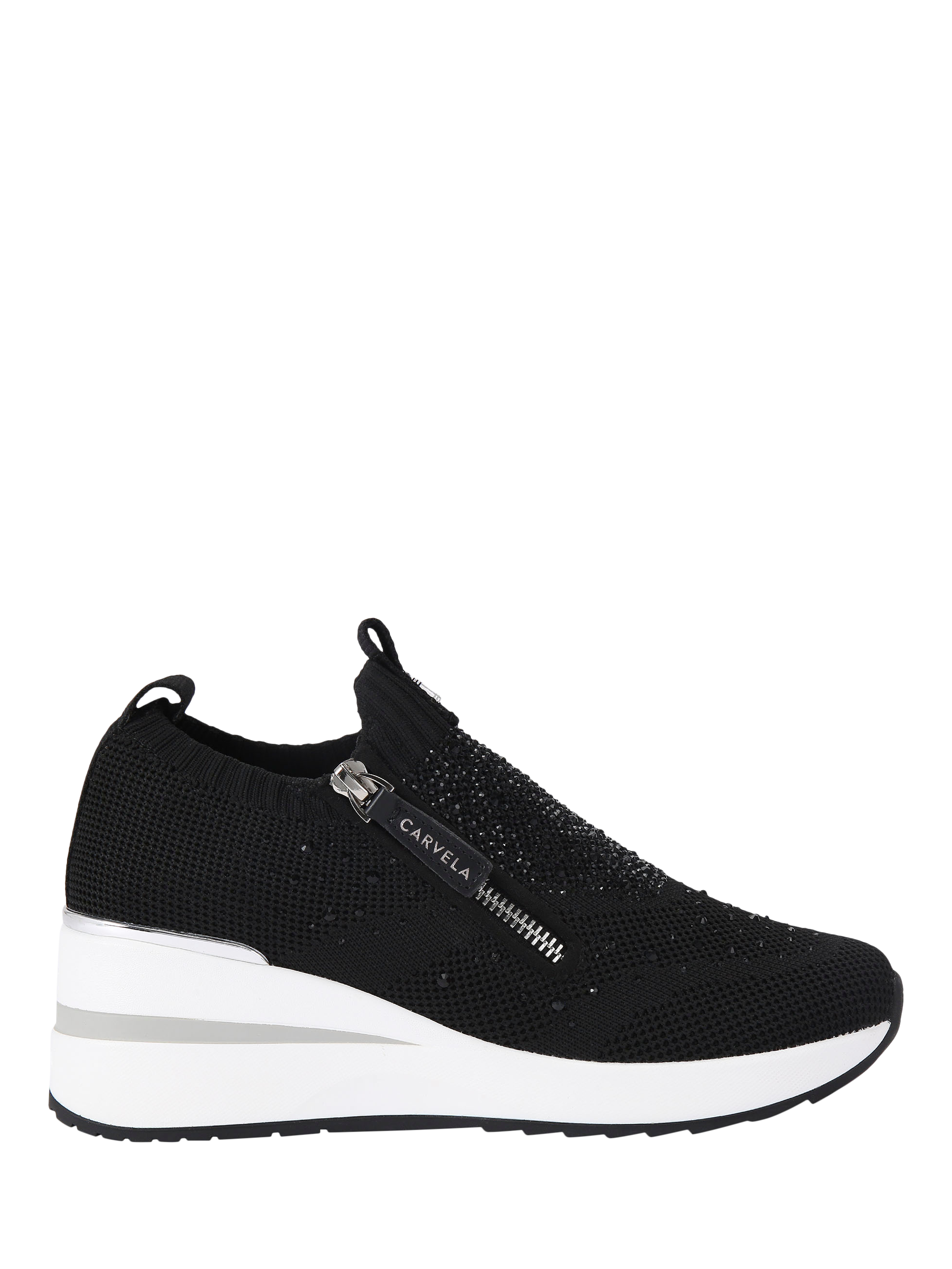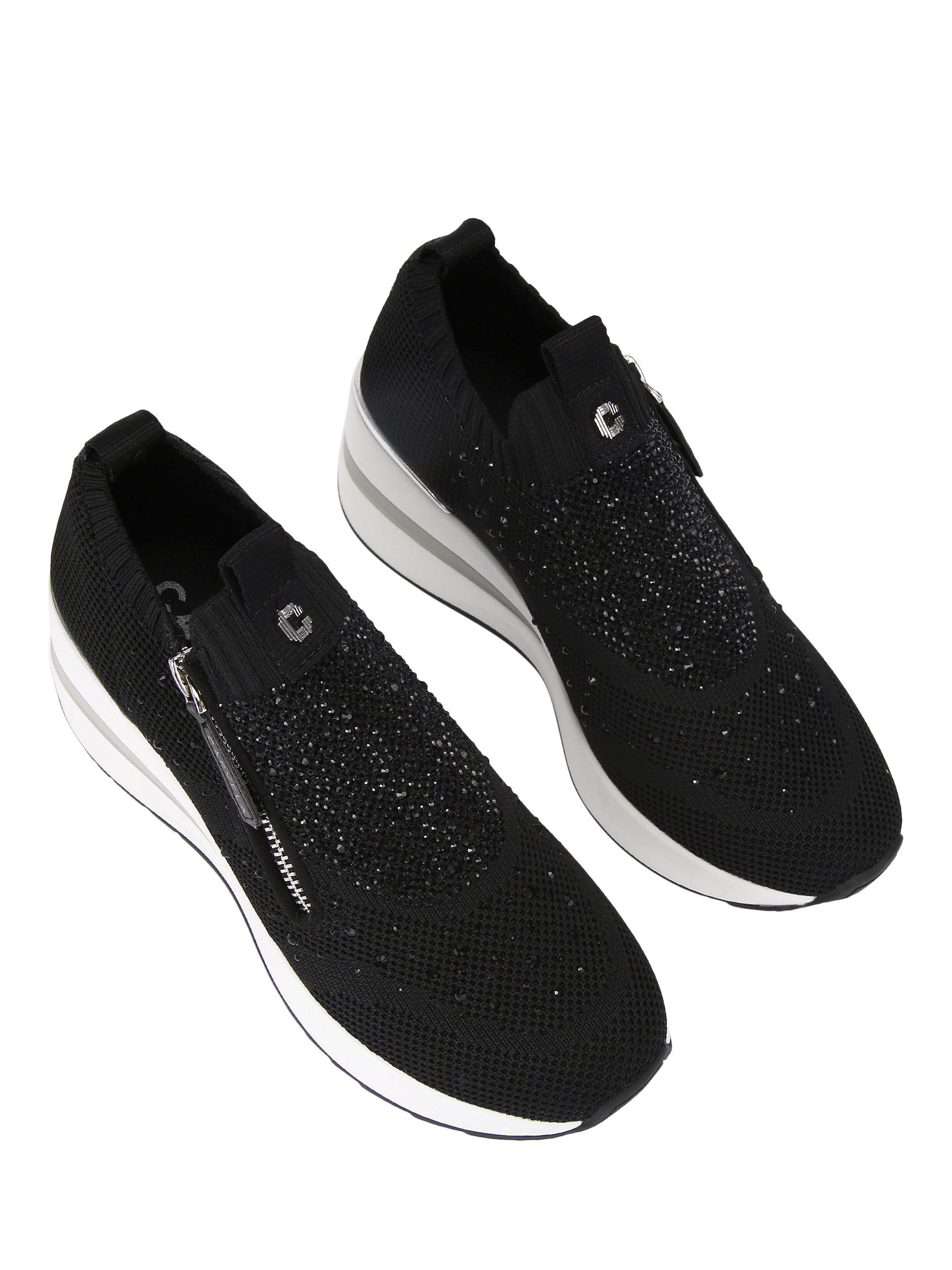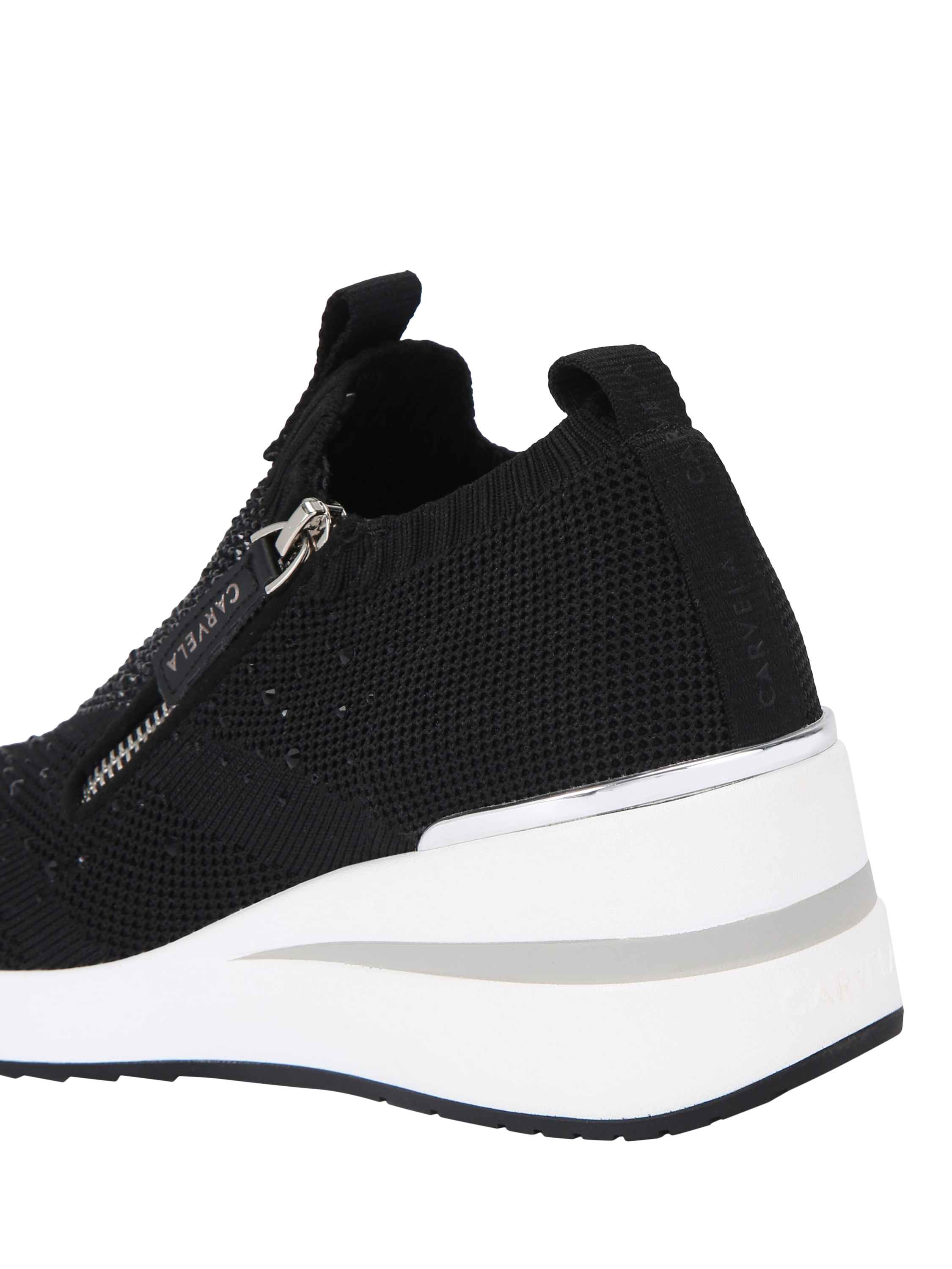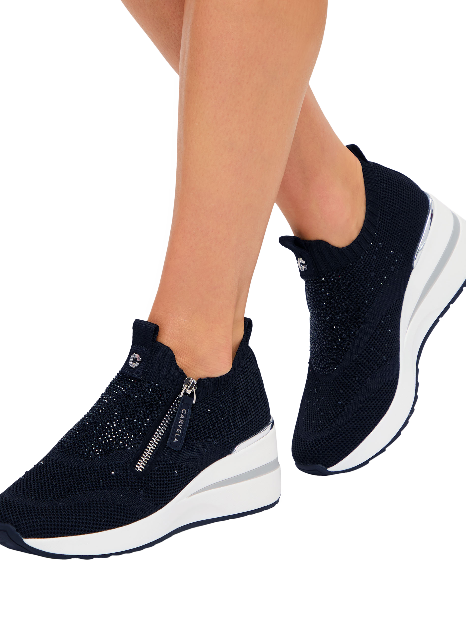 These High Rise Zip Knit trainers from Carvela feature a knitted upper with crystal embellishment. There is a zip on the front side of the shoe alongside a silver panel at the back of the heel.