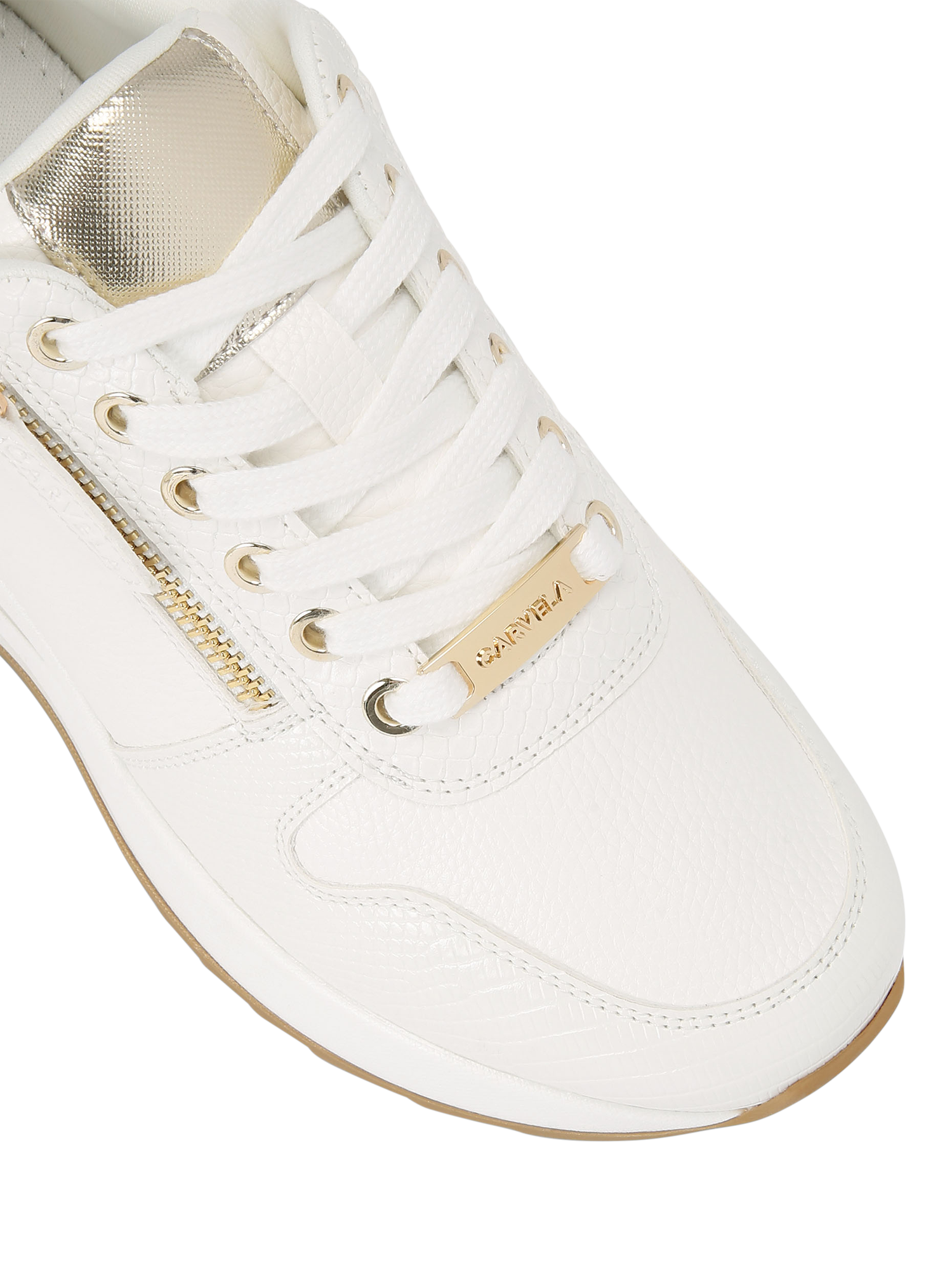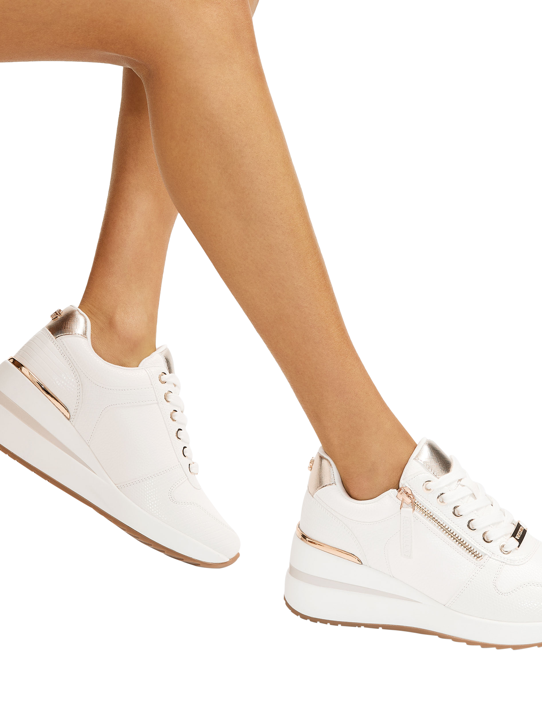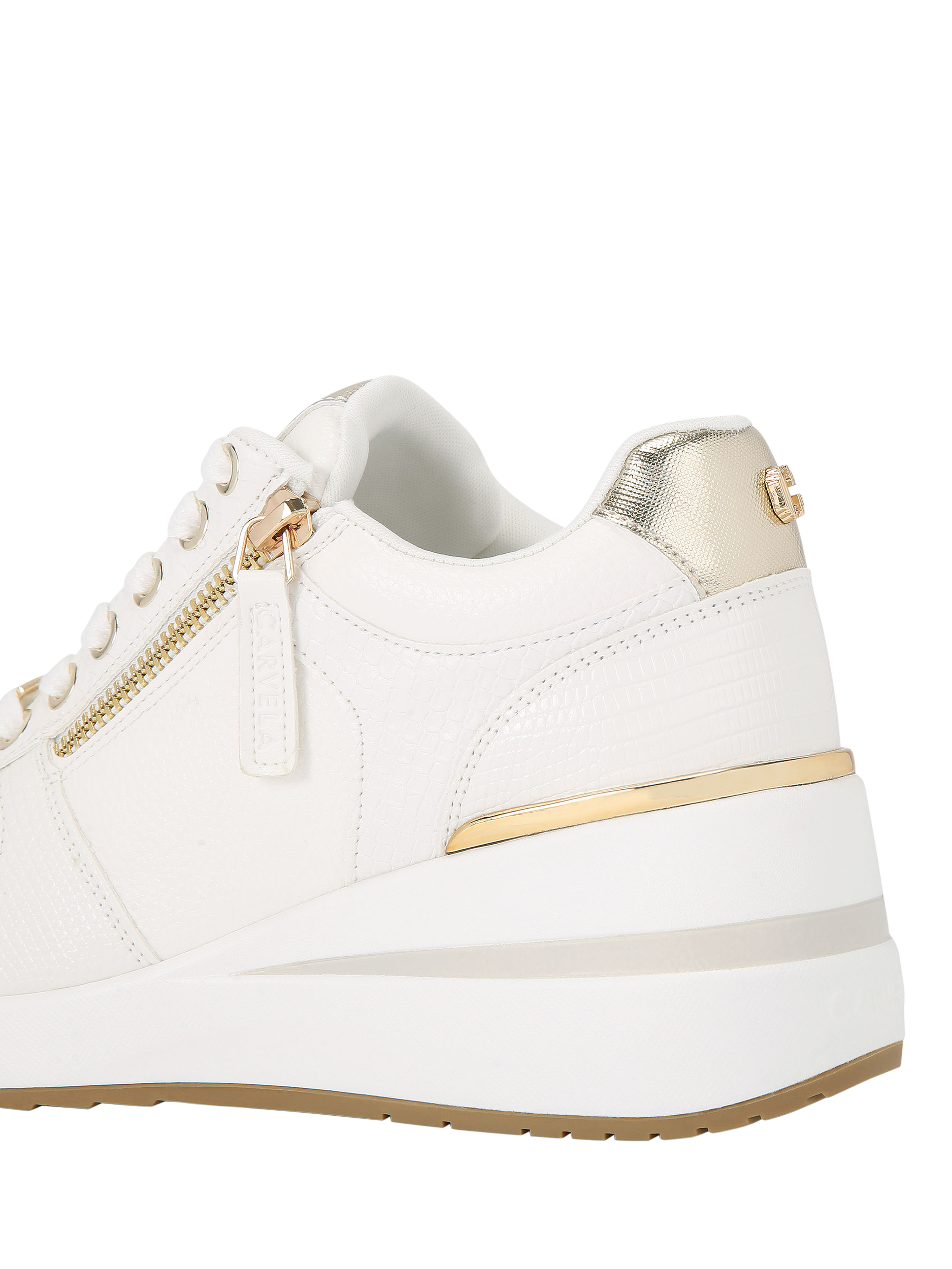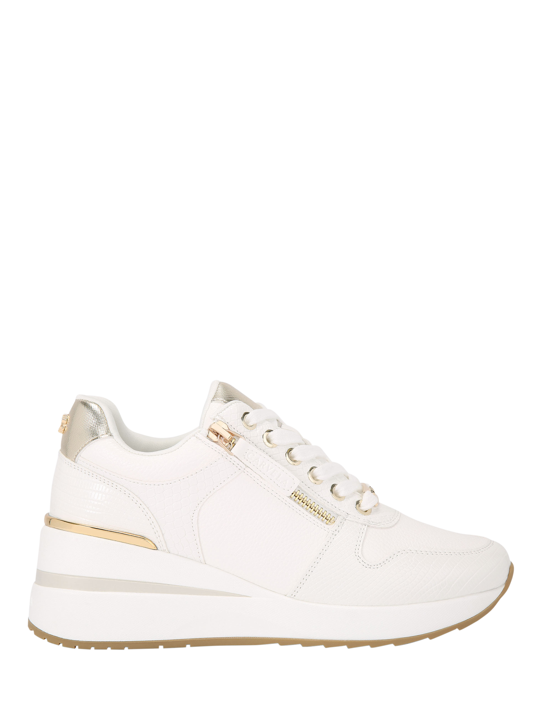 A contemporary design that pairs with almost anything, this pair of chunky trainers by Carvela is made with zip detailed uppers with metallic accents. Sitting on a wearable wedge heel, they are finished with a closed toe and a lace-up front.