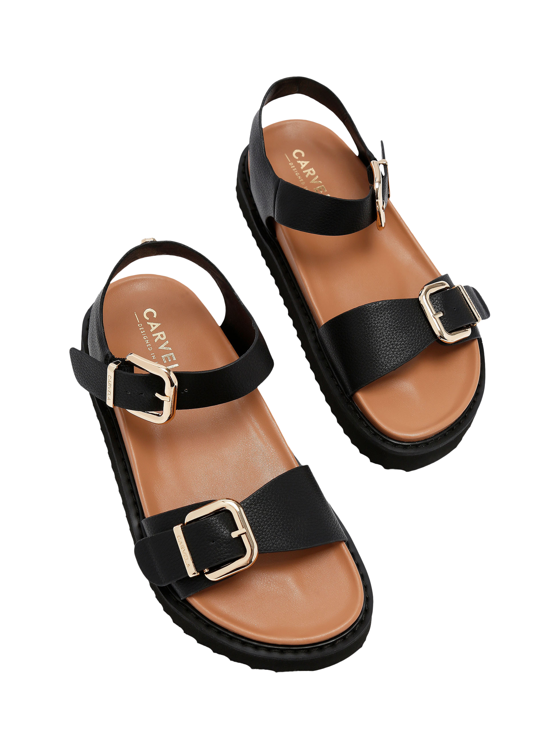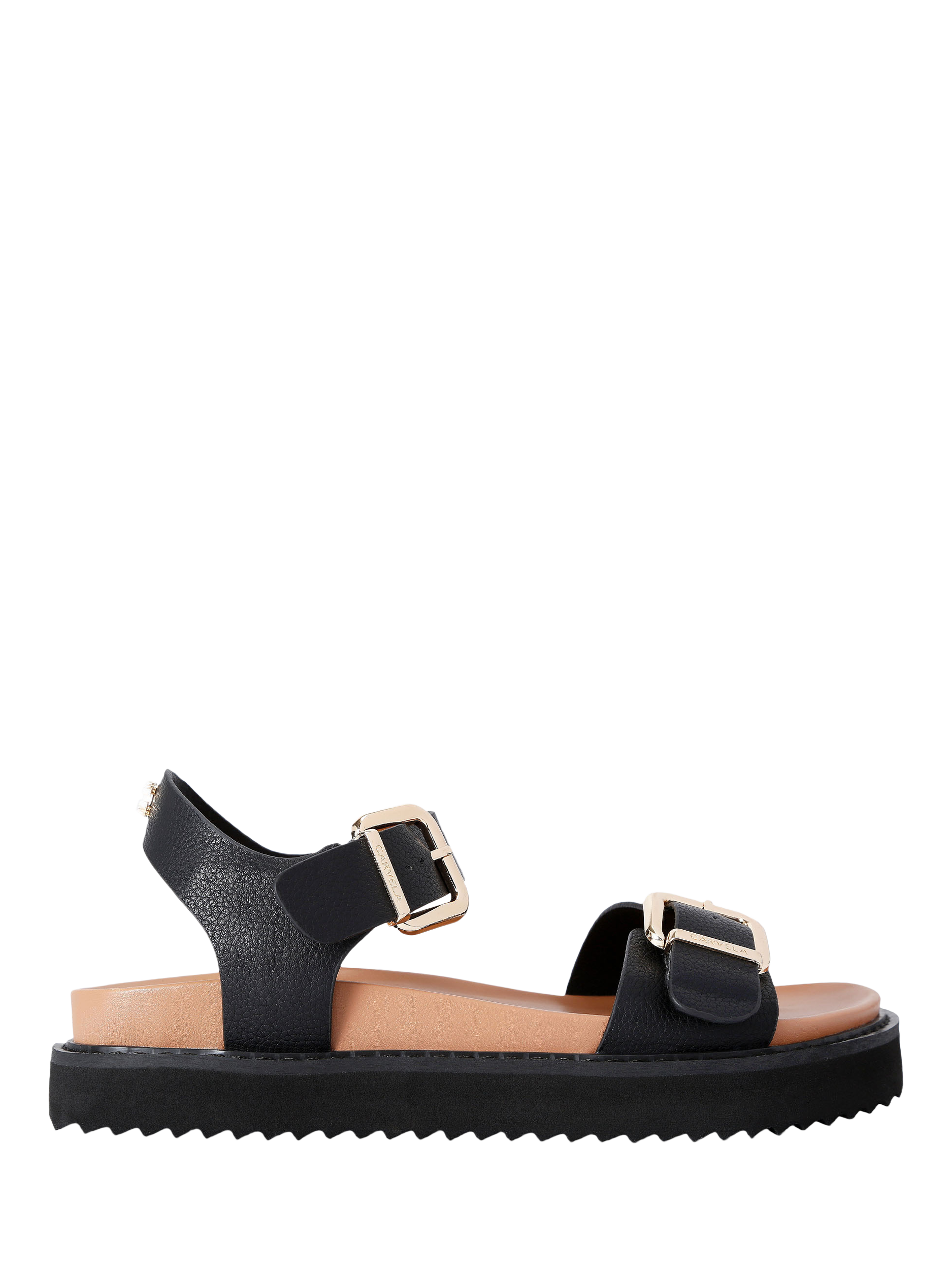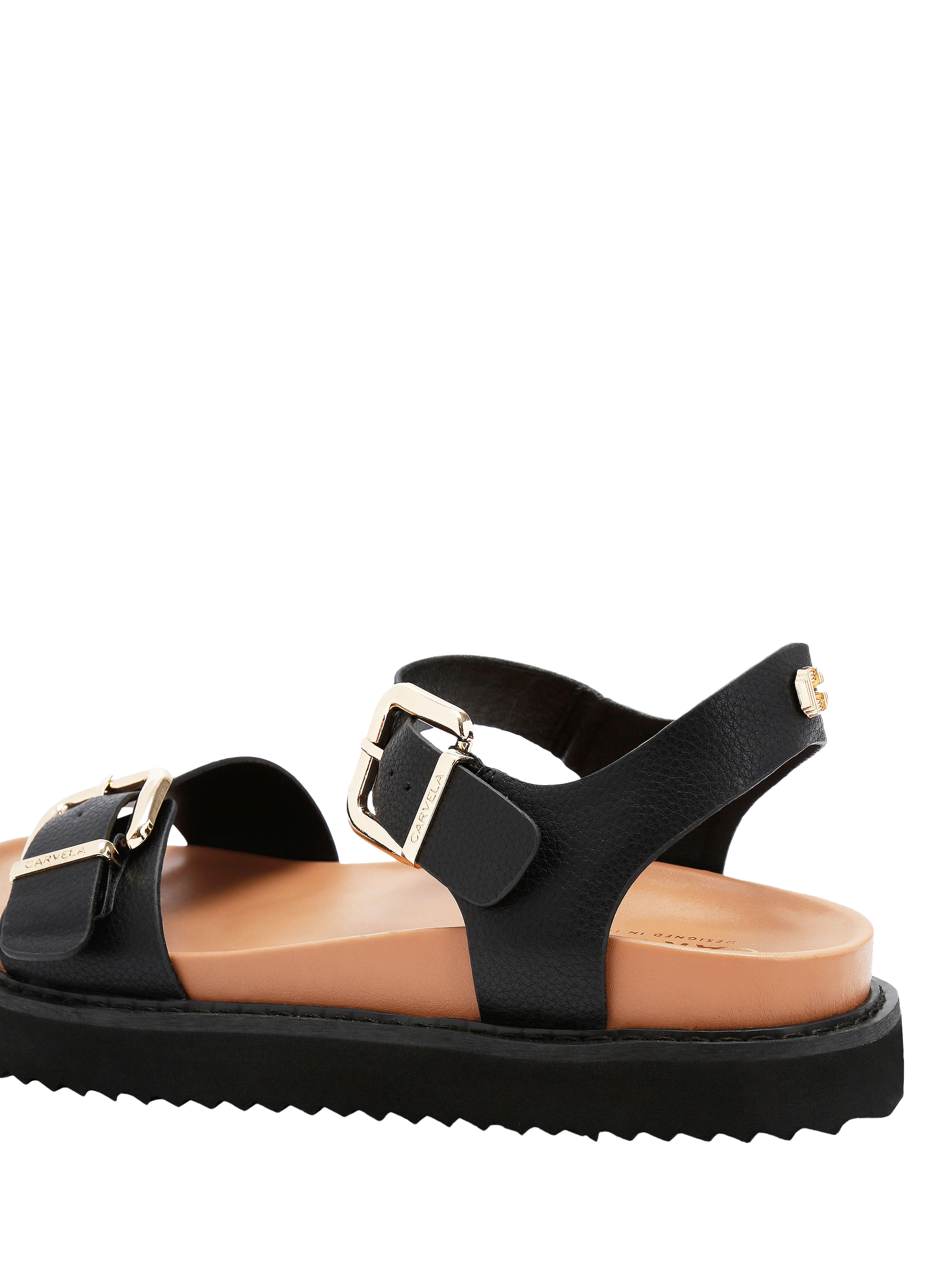 Carvela’s strappy sandals, featuring an open round toe and adjustable buckle straps for comfort. Sleek and practical, they are a staple for summer.