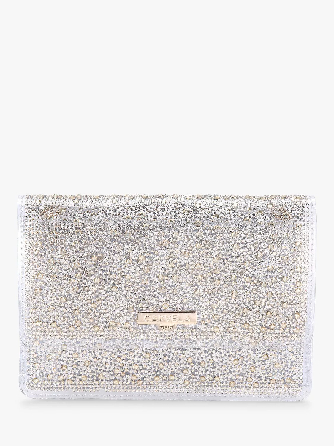 Featuring a transparent exterior with complete crystal embellishment in an ombre design, it fastens with a magnetic snap closure and is completed with a gold branded plate on the front flap.