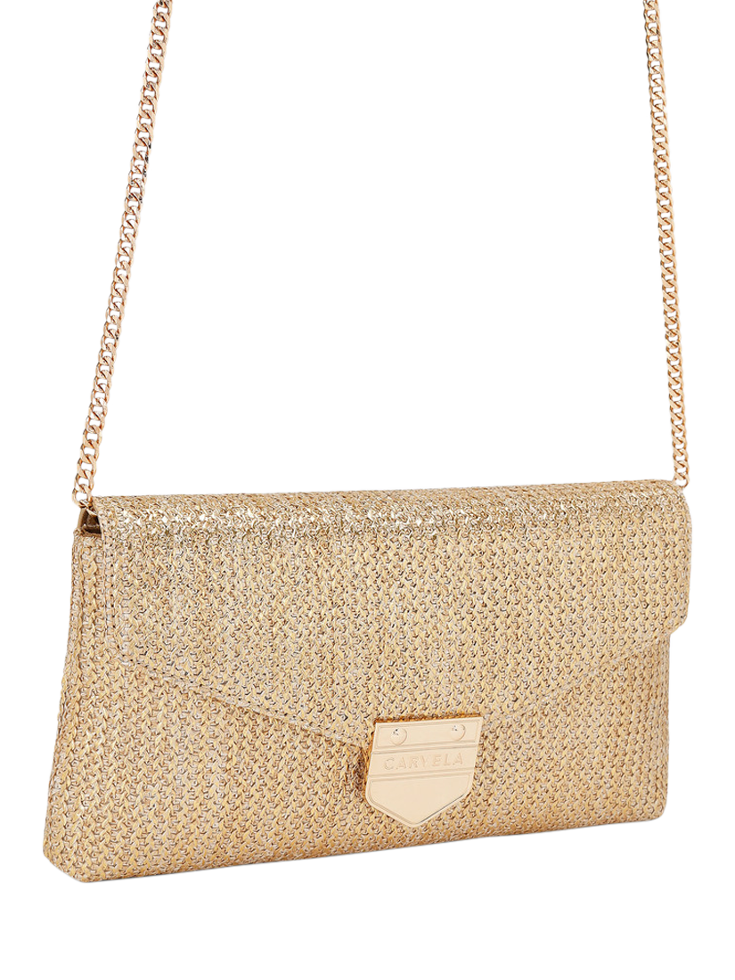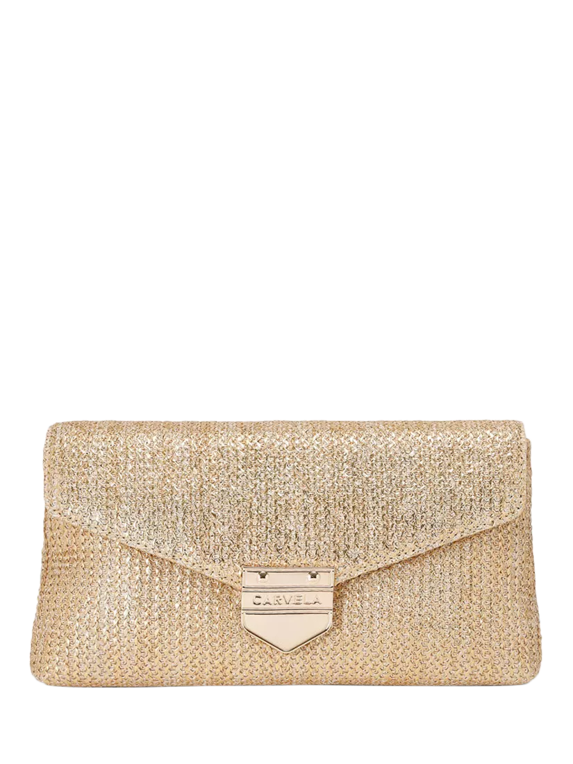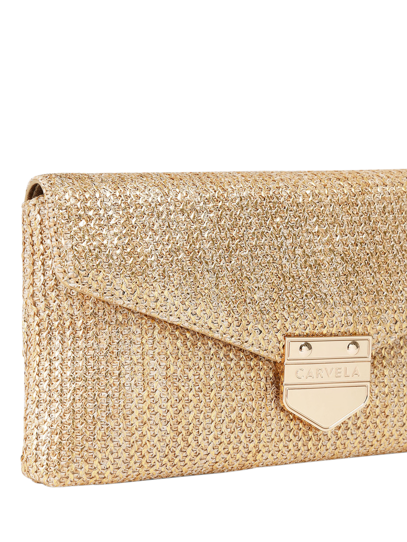 This envelope clutch by Carvela adapts to your night, whether you hold it close or wear it crossbody. Made in a metallic woven finish with a gold hardware detail.