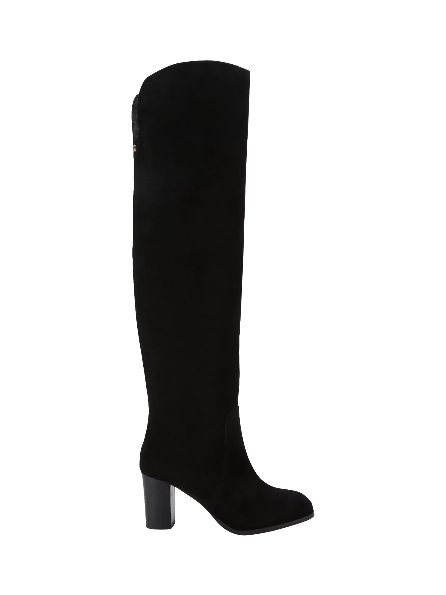 A pair of Carvela over-the-knee boots, crafted from smooth suede. The mid block heel gives you steady height, the almond-shaped closed toe keeps things sharp, and a side zip ensures an effortless fit.