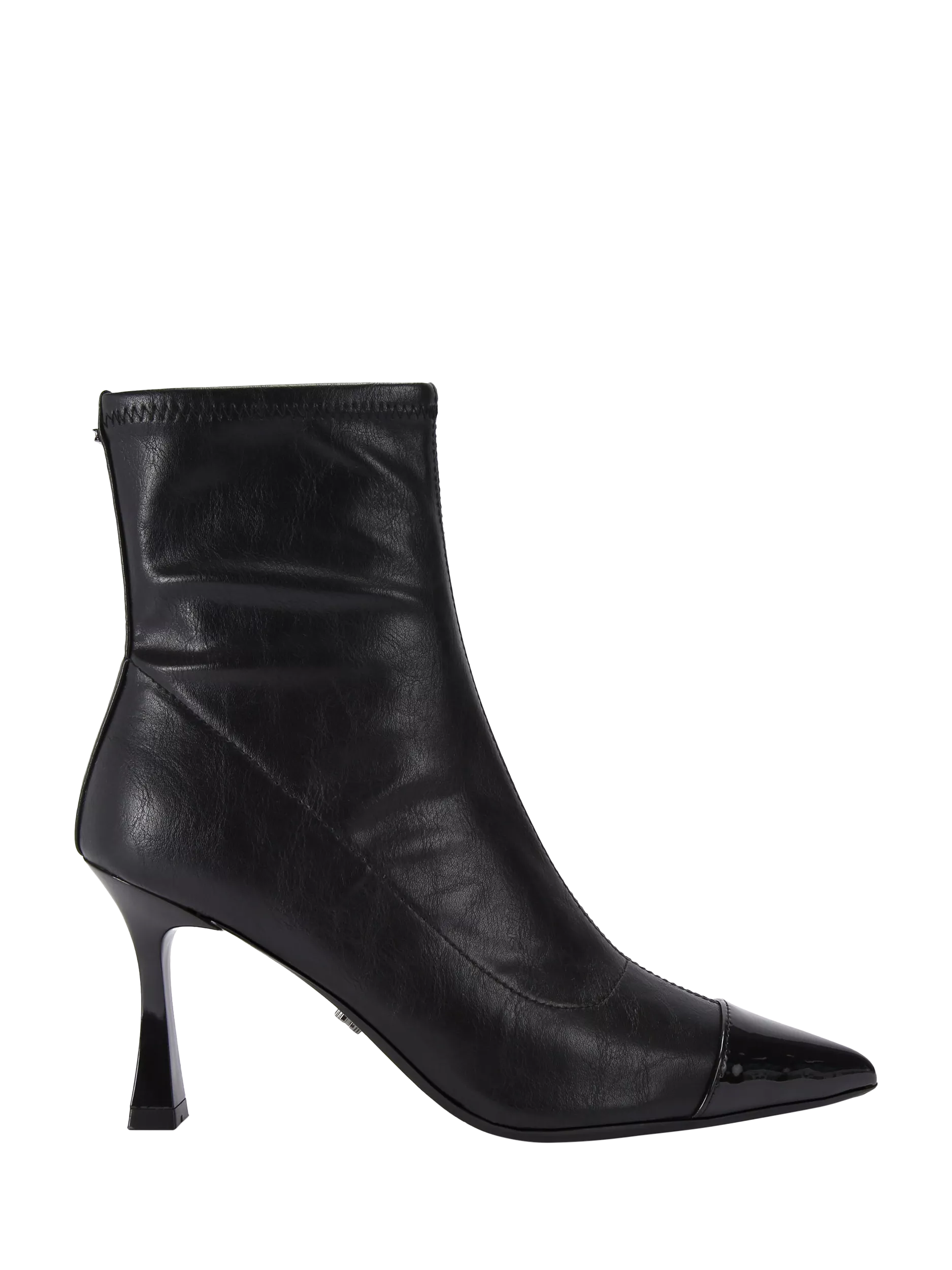 This Midnight Ankle boot from Carvela features a pointed toe with a patent black cap. The heel is in a curved flare design.