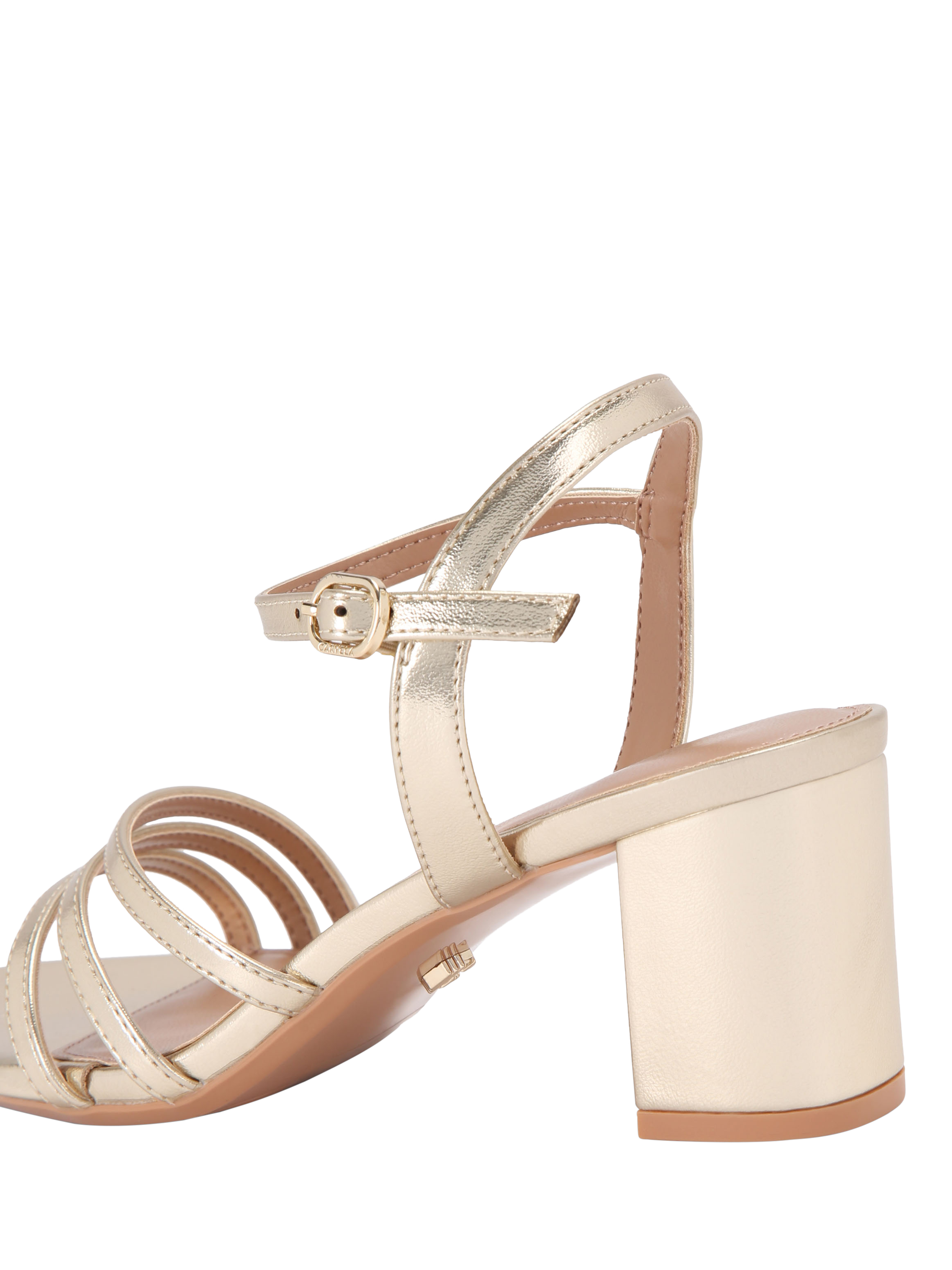 Carvela heeled sandals with a low block heel, comfortable leather lining and open squared toe, designed for comfort on busy days and long evenings. The ankle buckle fastening adds ease while making dressing up or down.