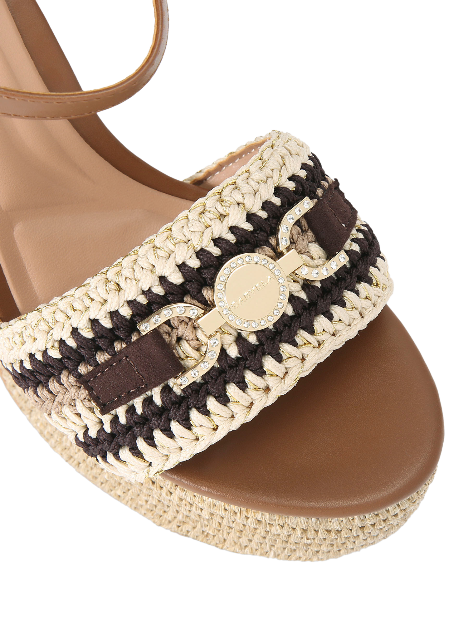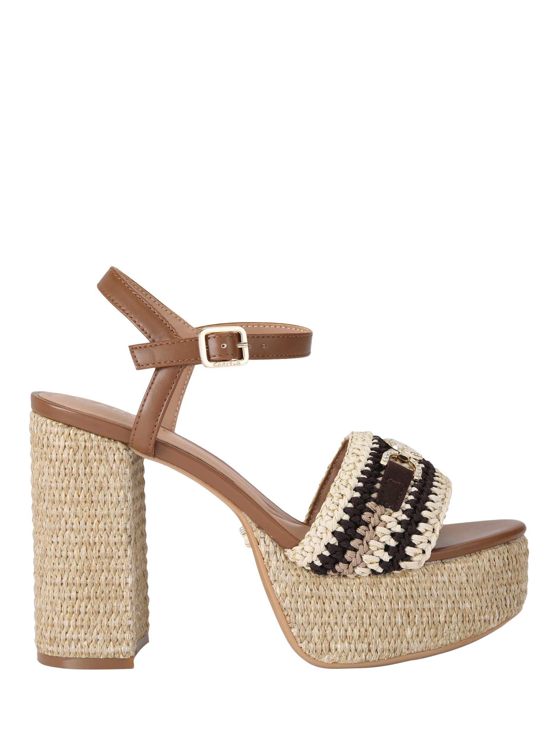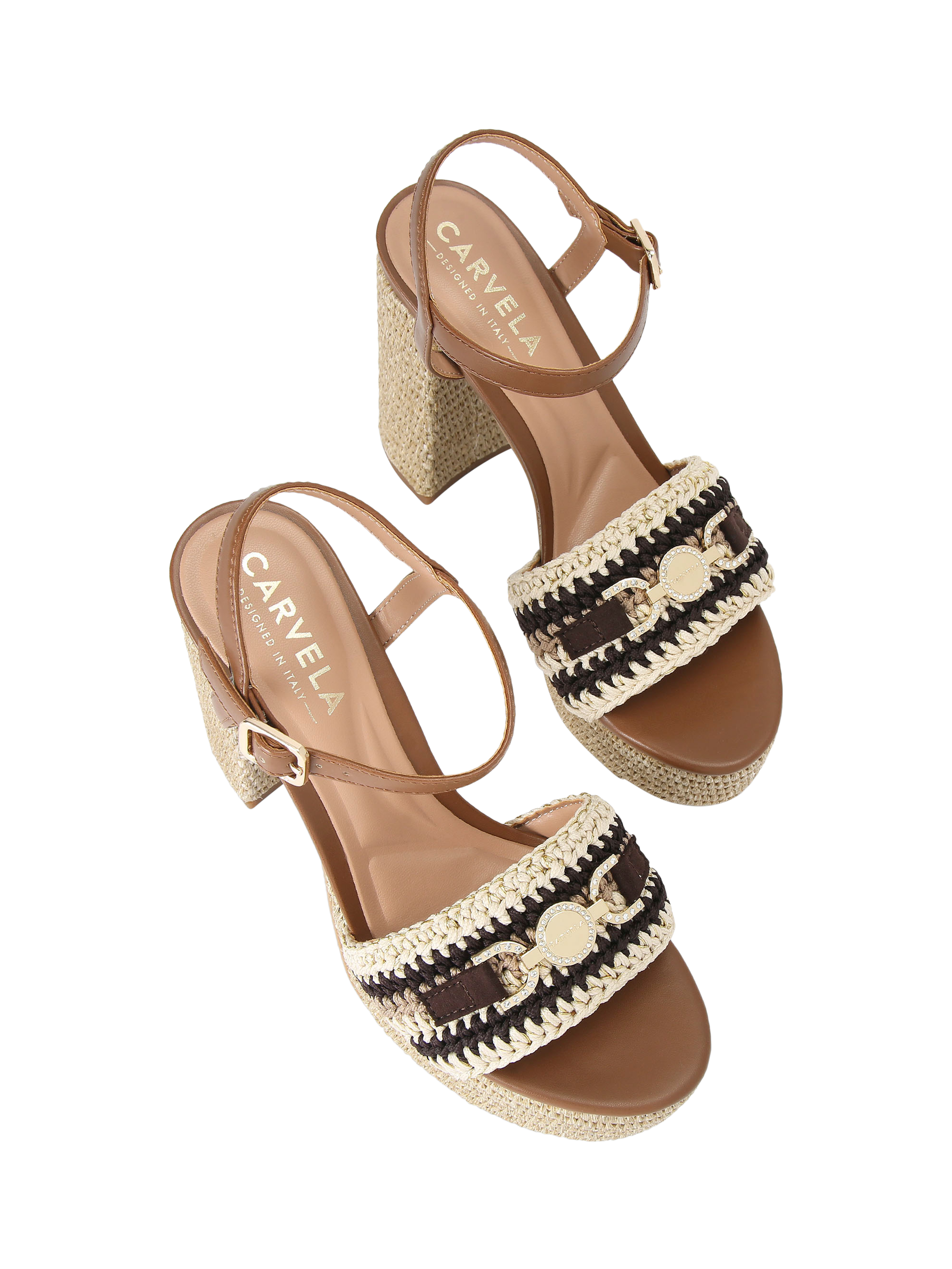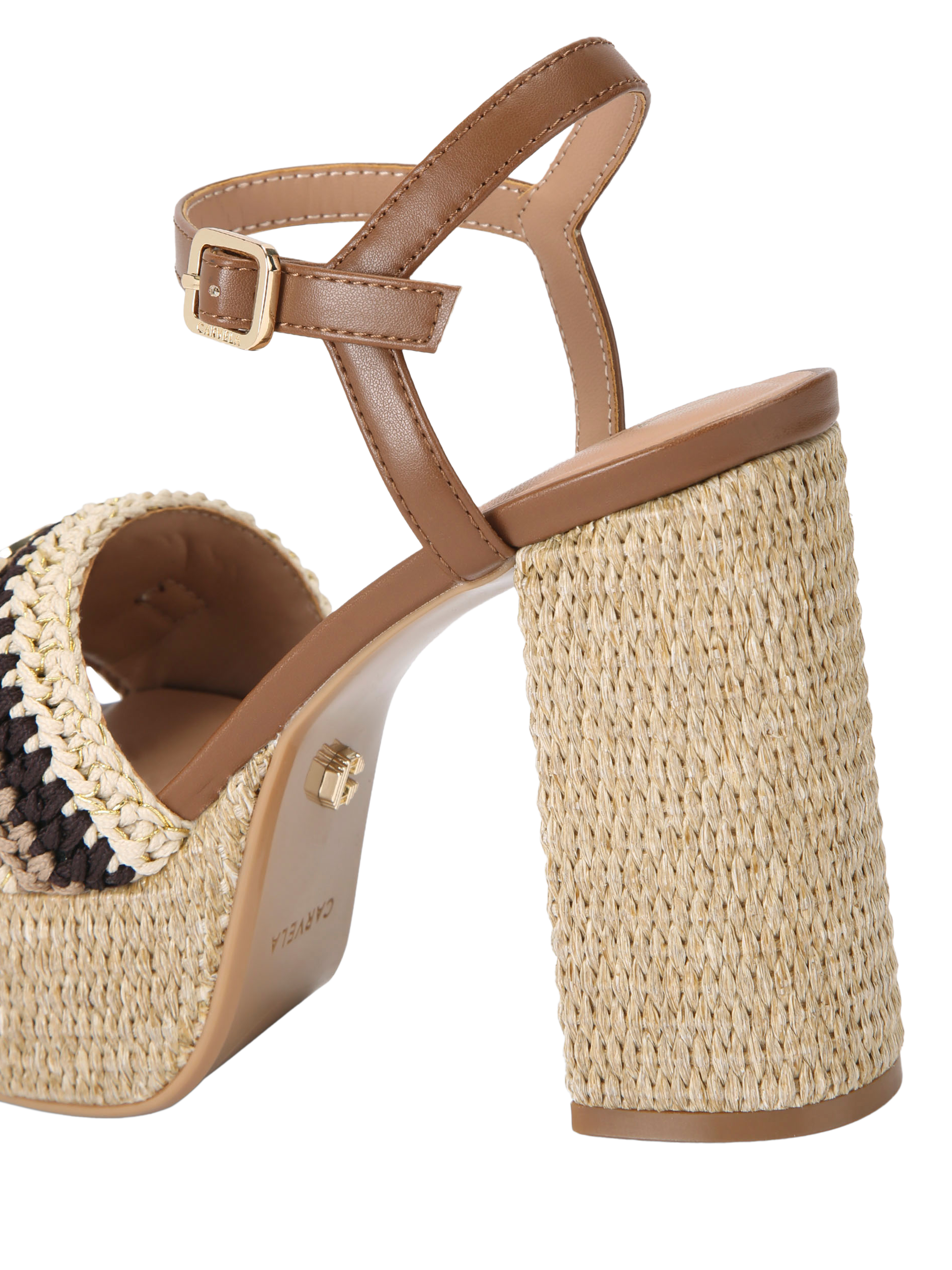This Nola sandal arrives with a fabric braided toe strap, which is accented with a gold-tone horsebit toe chain. The platform and heel are in a beige raffia style.