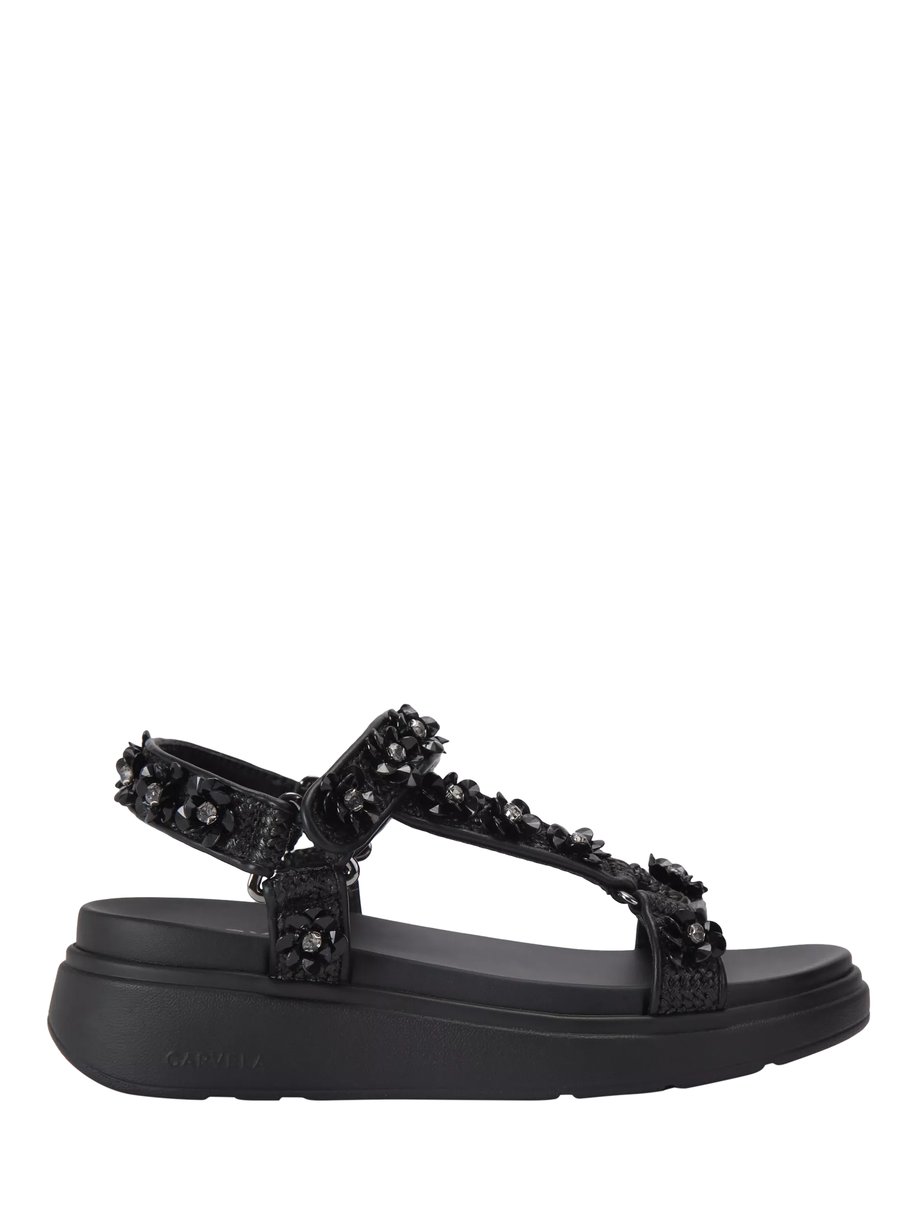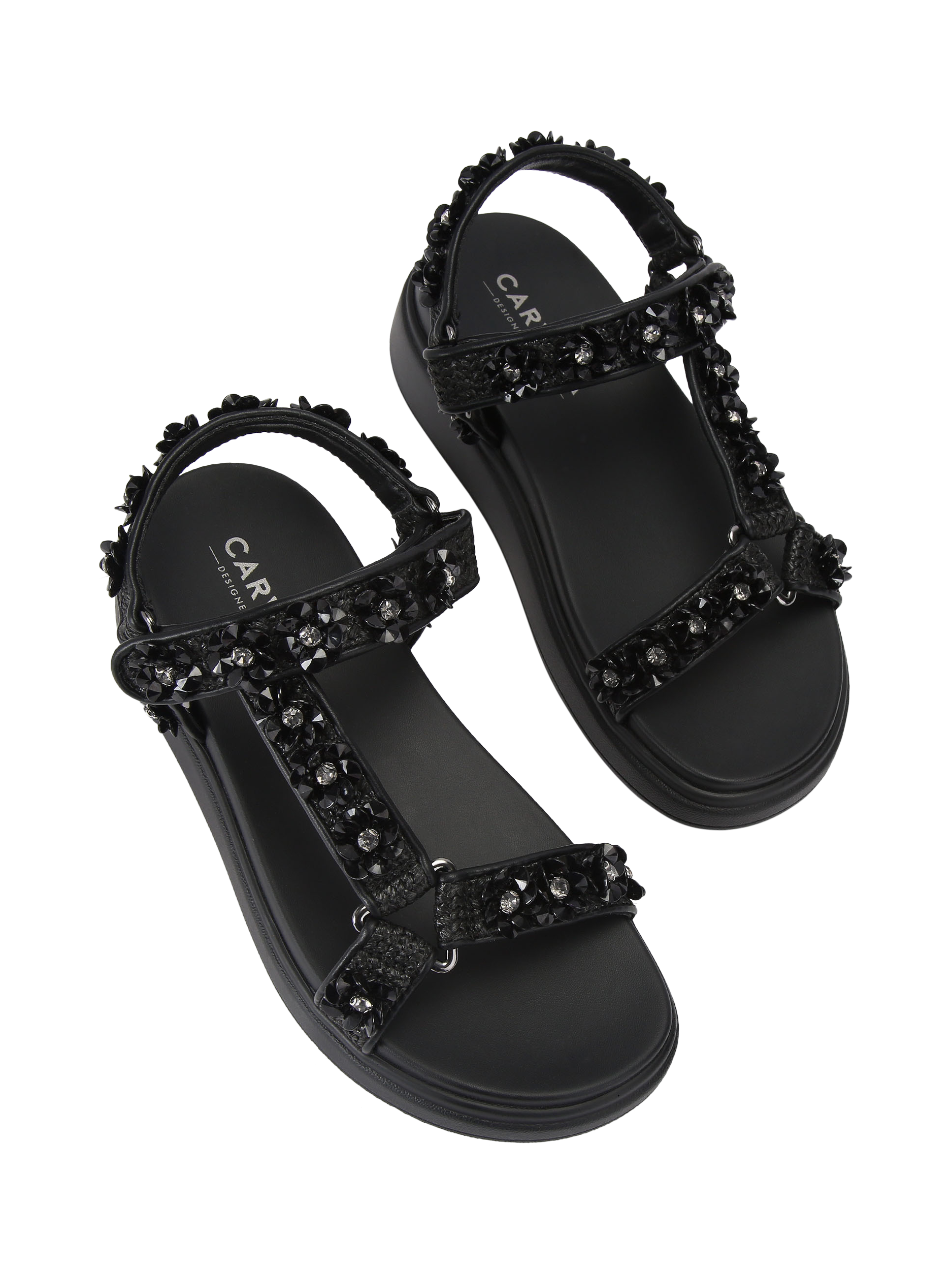 A pair of footbed sandals from Carvela. The open toe and round shape let you move freely, while heavily embellished straps add a sparkly twist. Flatform soles keep you comfortable, wherever your plans take you.