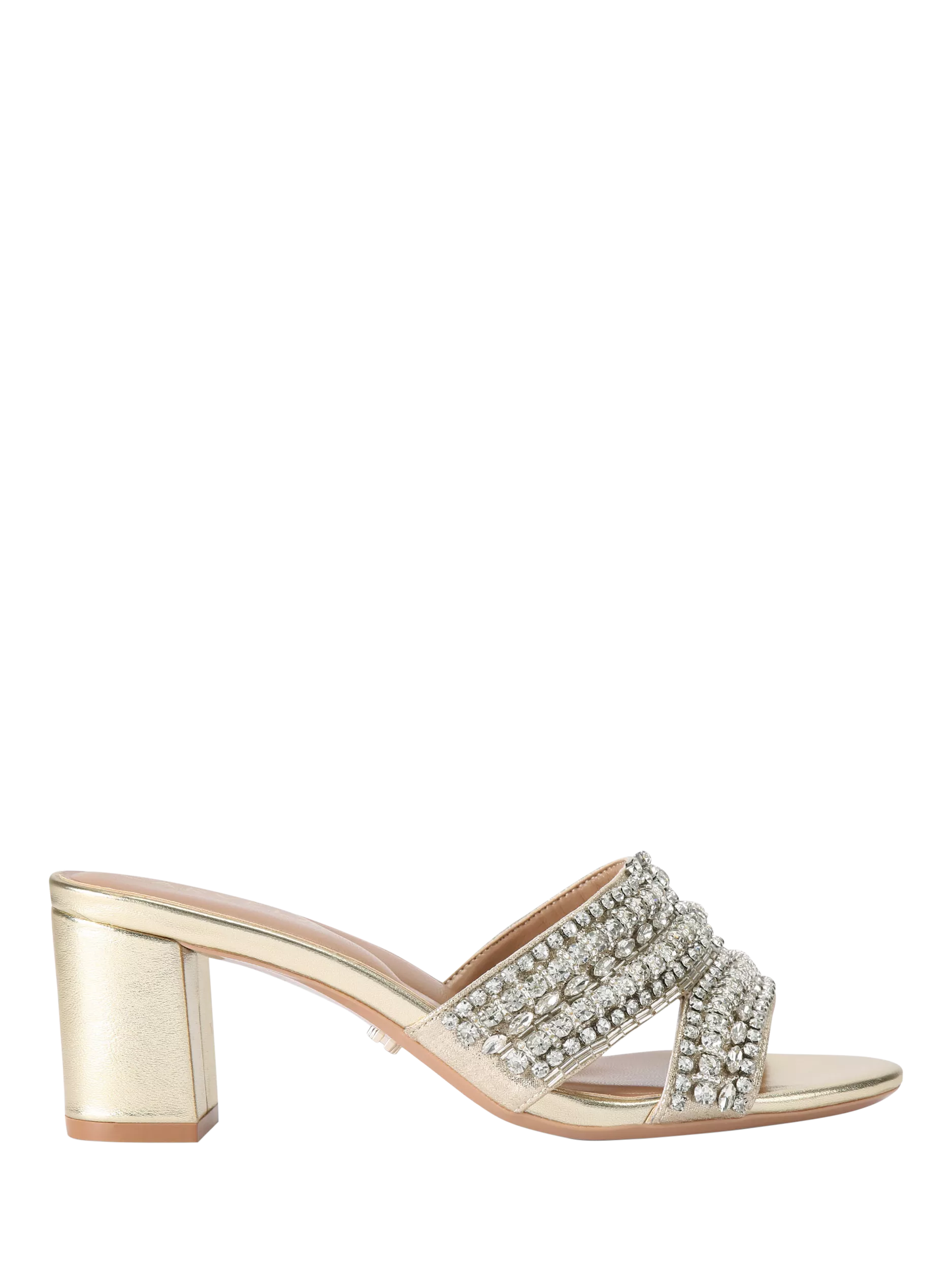 This Pageant Block heel sandal from Carvela is crafted in metallic gold with a statement strap across the foot. The strap is embellished with large silver crystals.