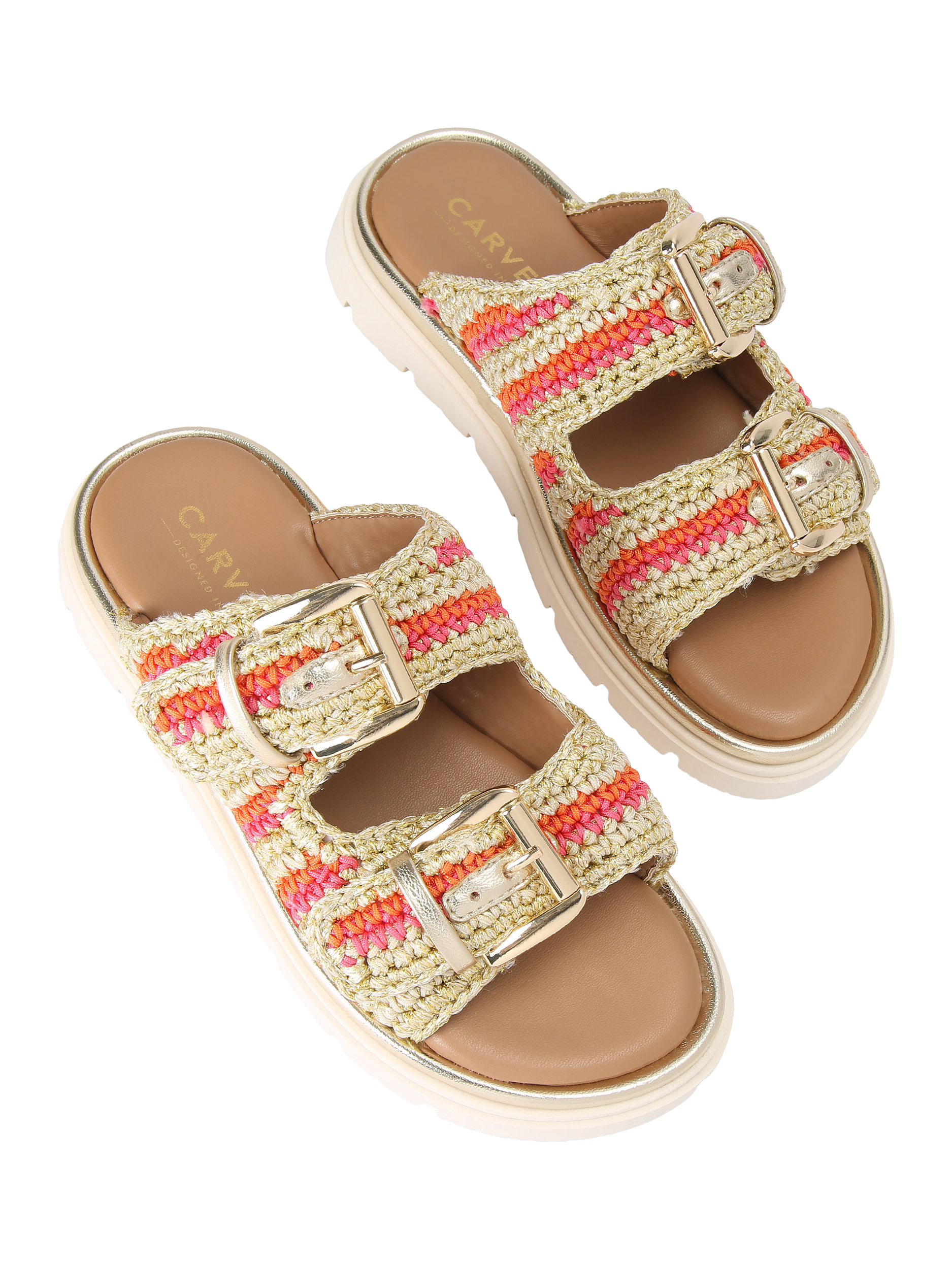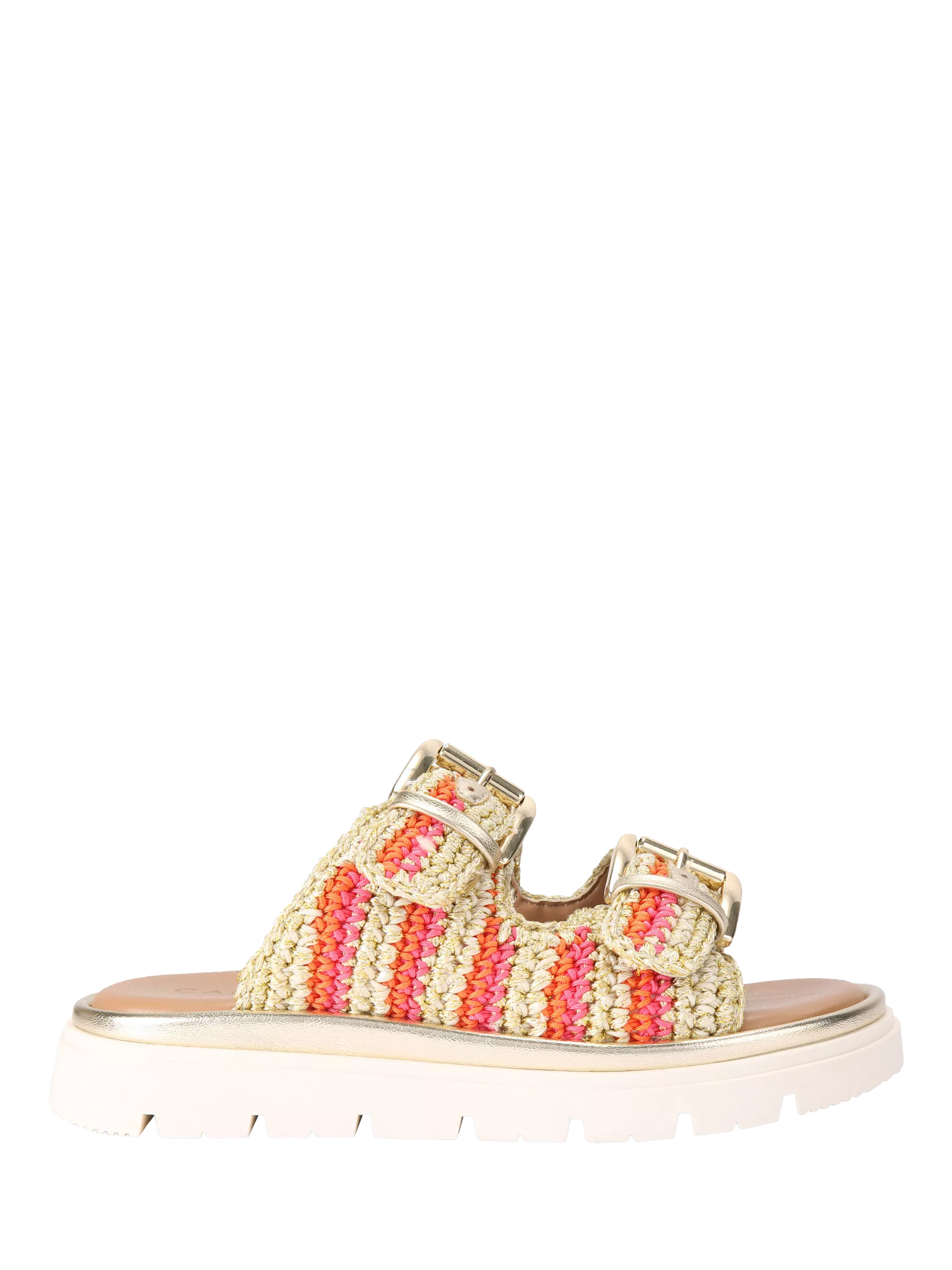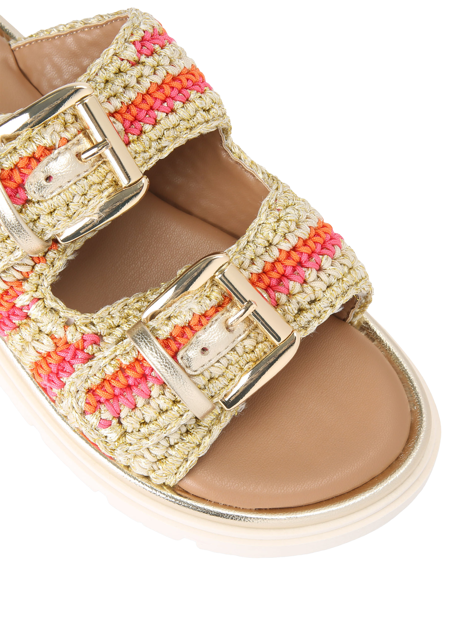 This pair of Pavilion sandals is crafted with a colourful crochet upper and secures with two gold buckles.