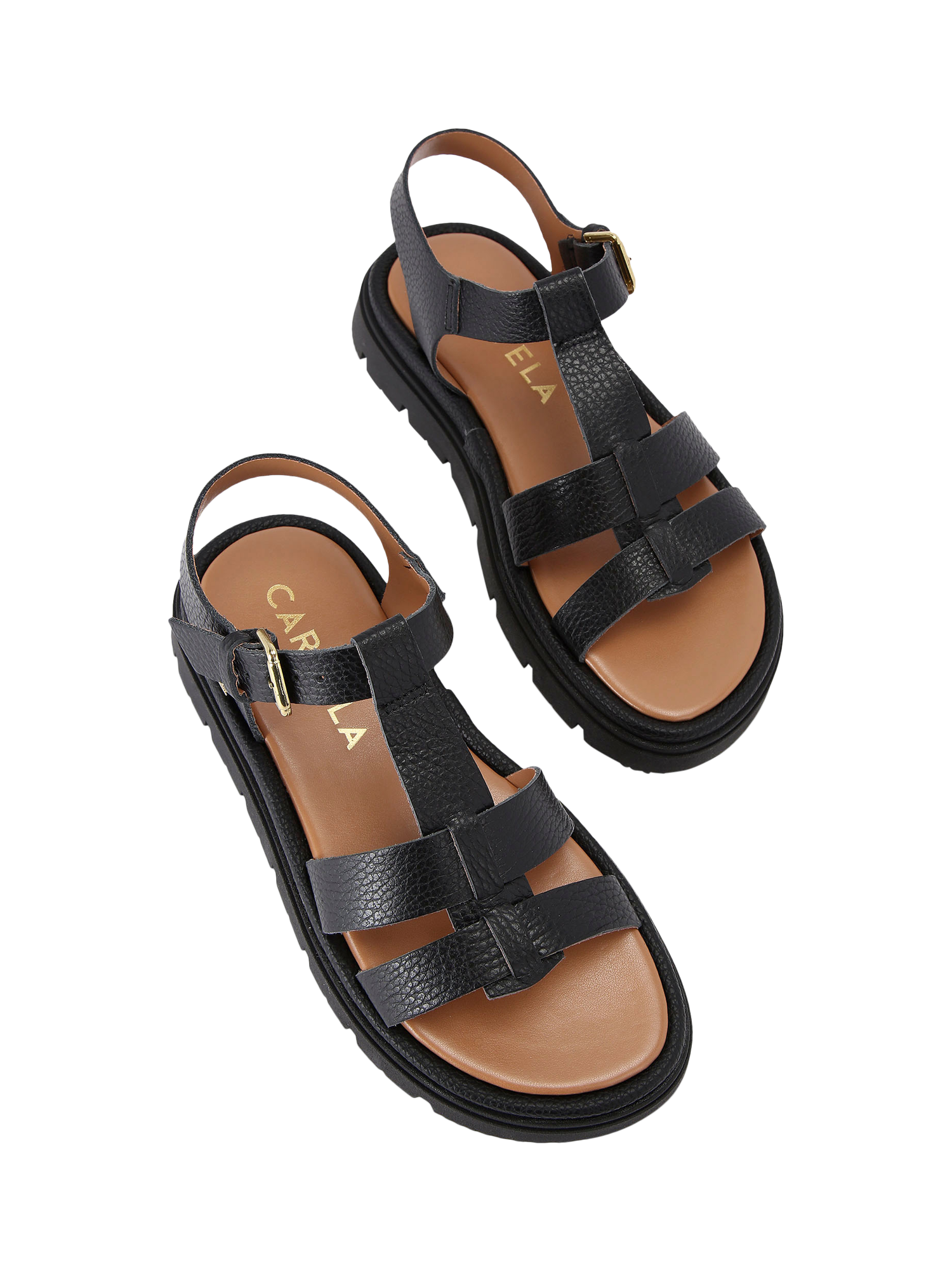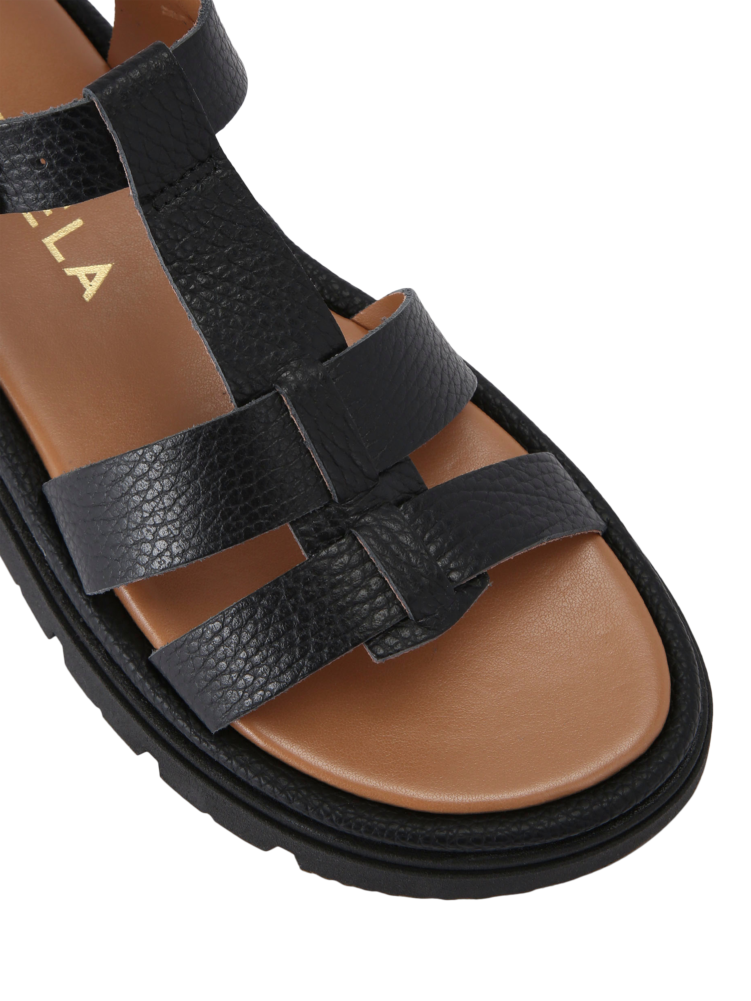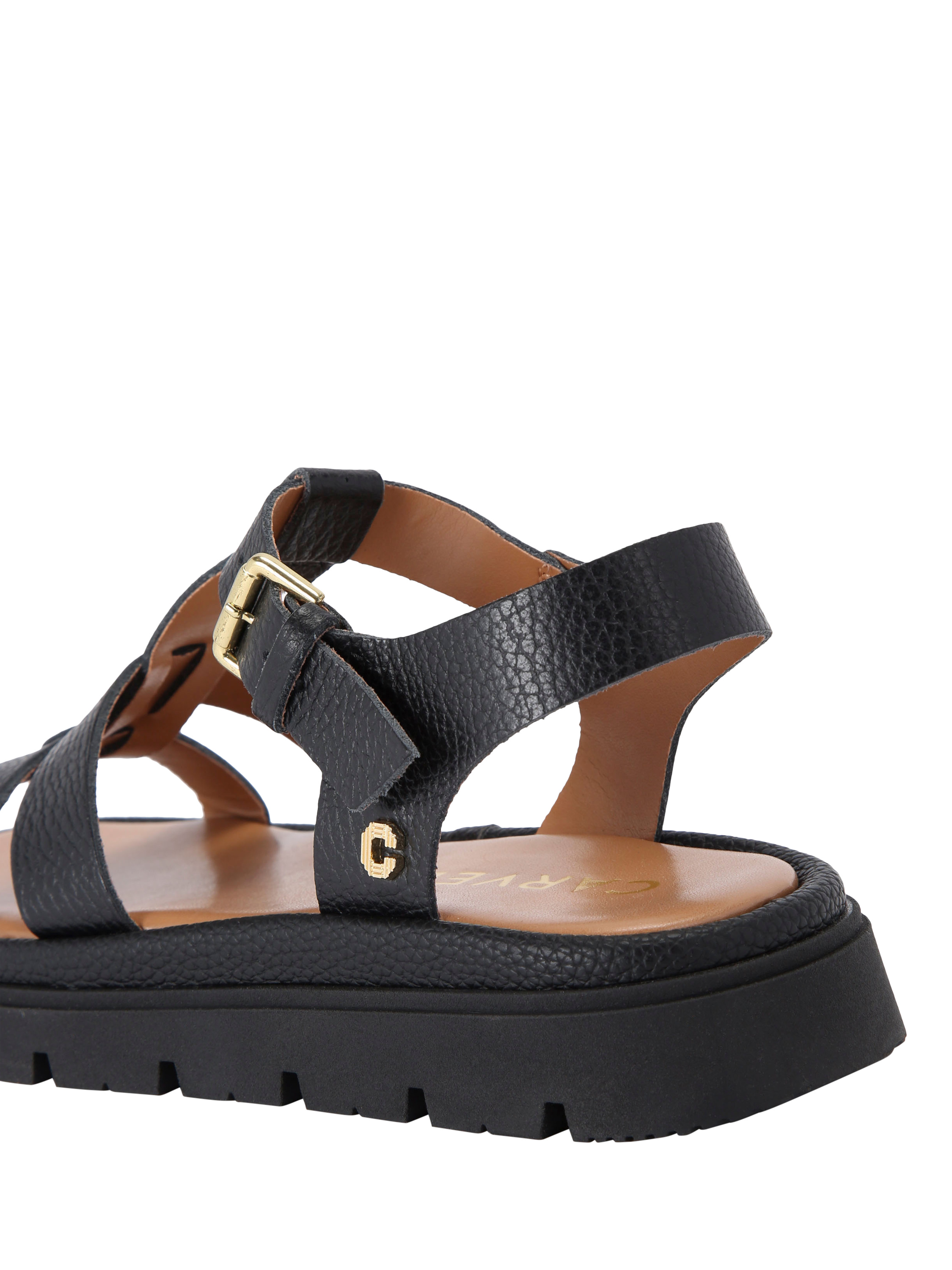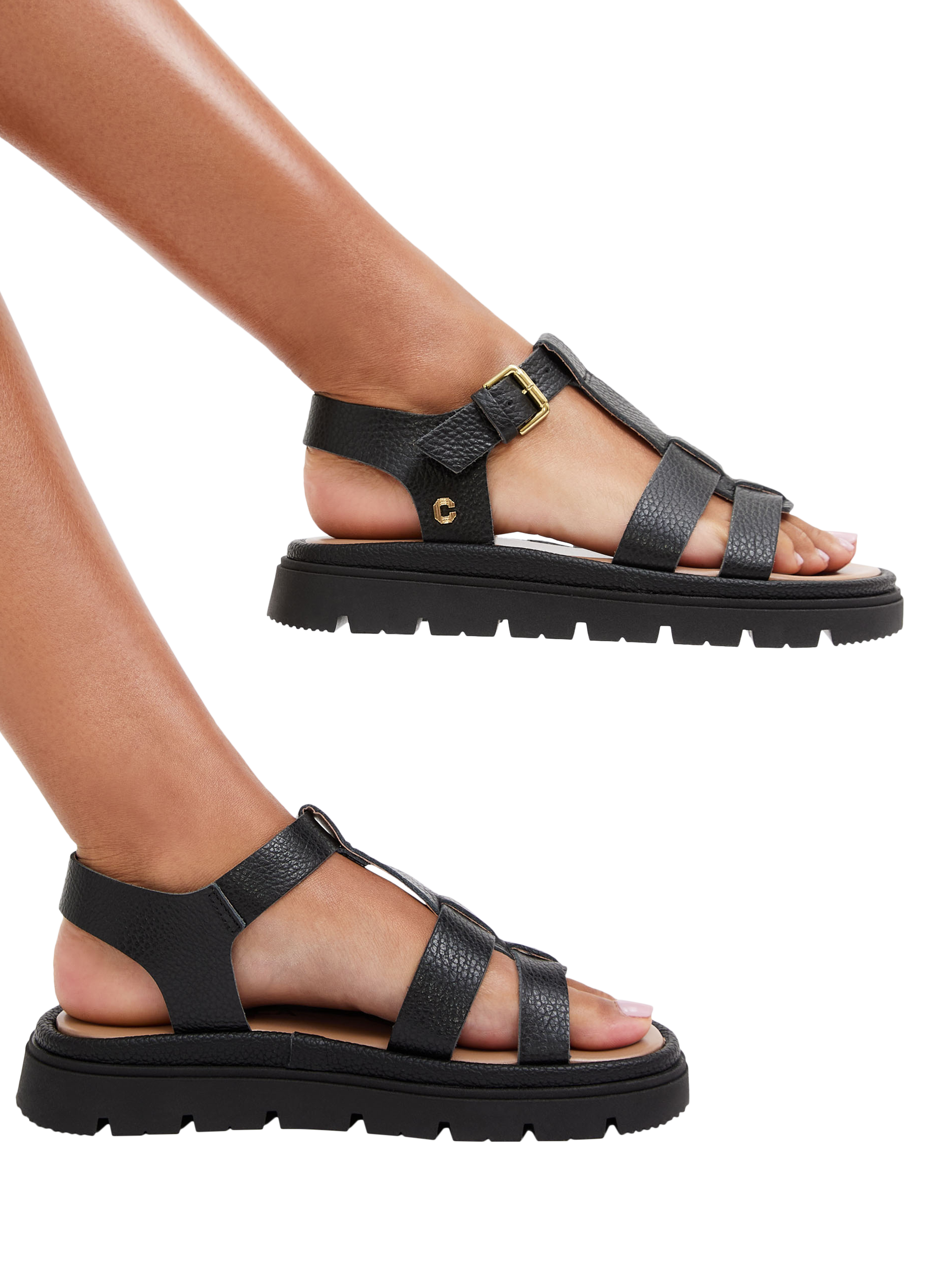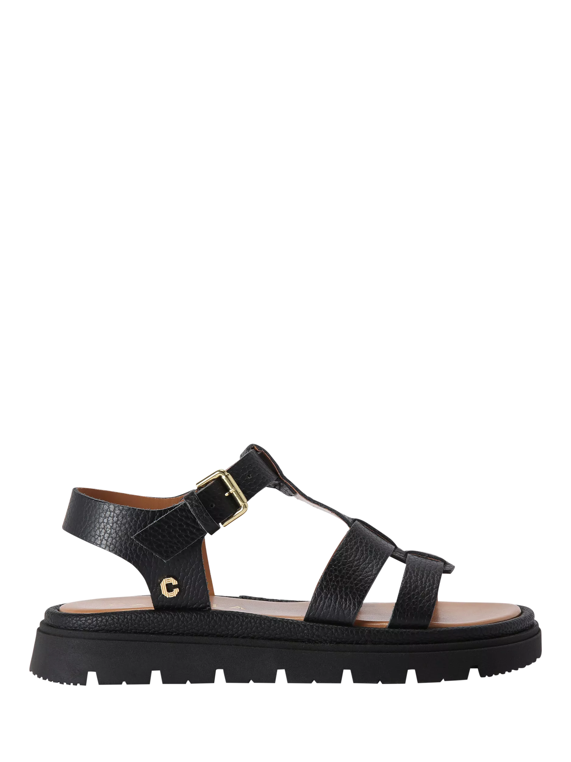 This Pavilion T-Bar sandal is crafted from a pebble grain leather with a caged style upper. There is a gold Icon C pin stud on the outer side and a matching gold buckle fastens the strap.