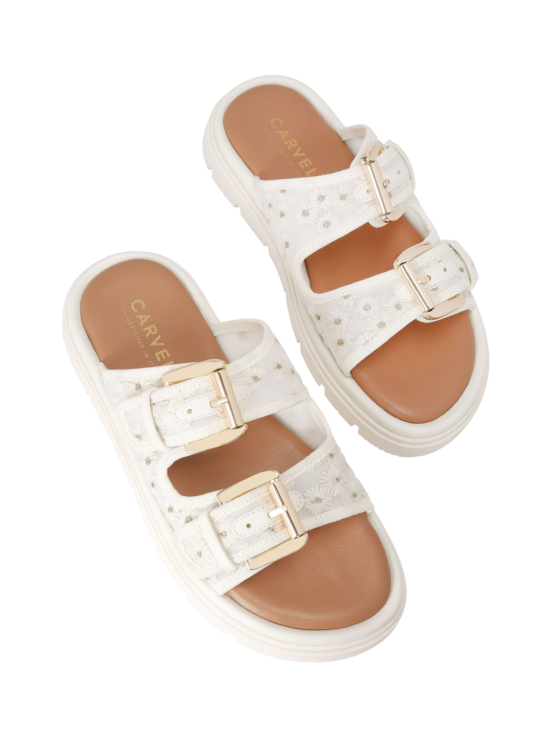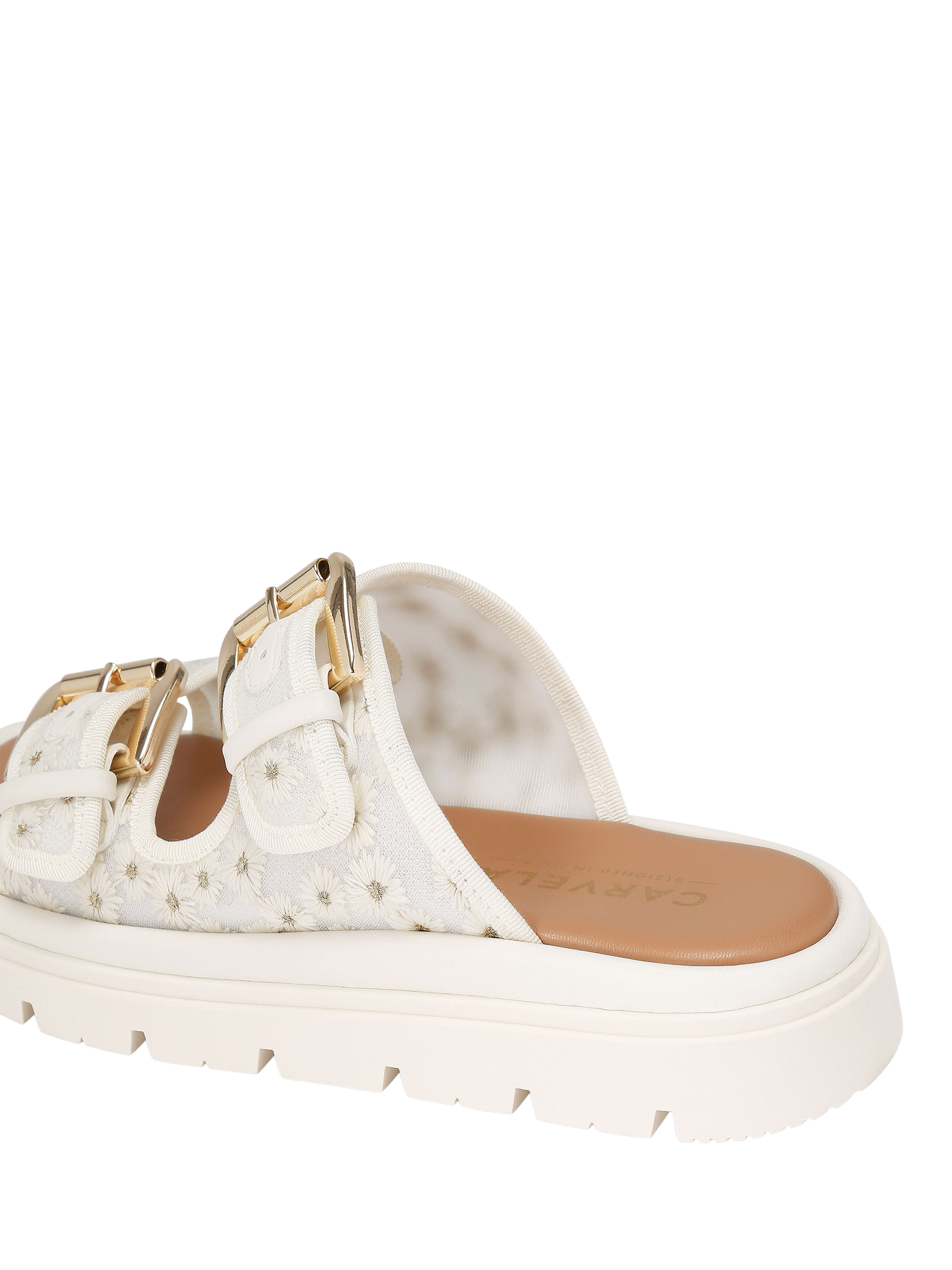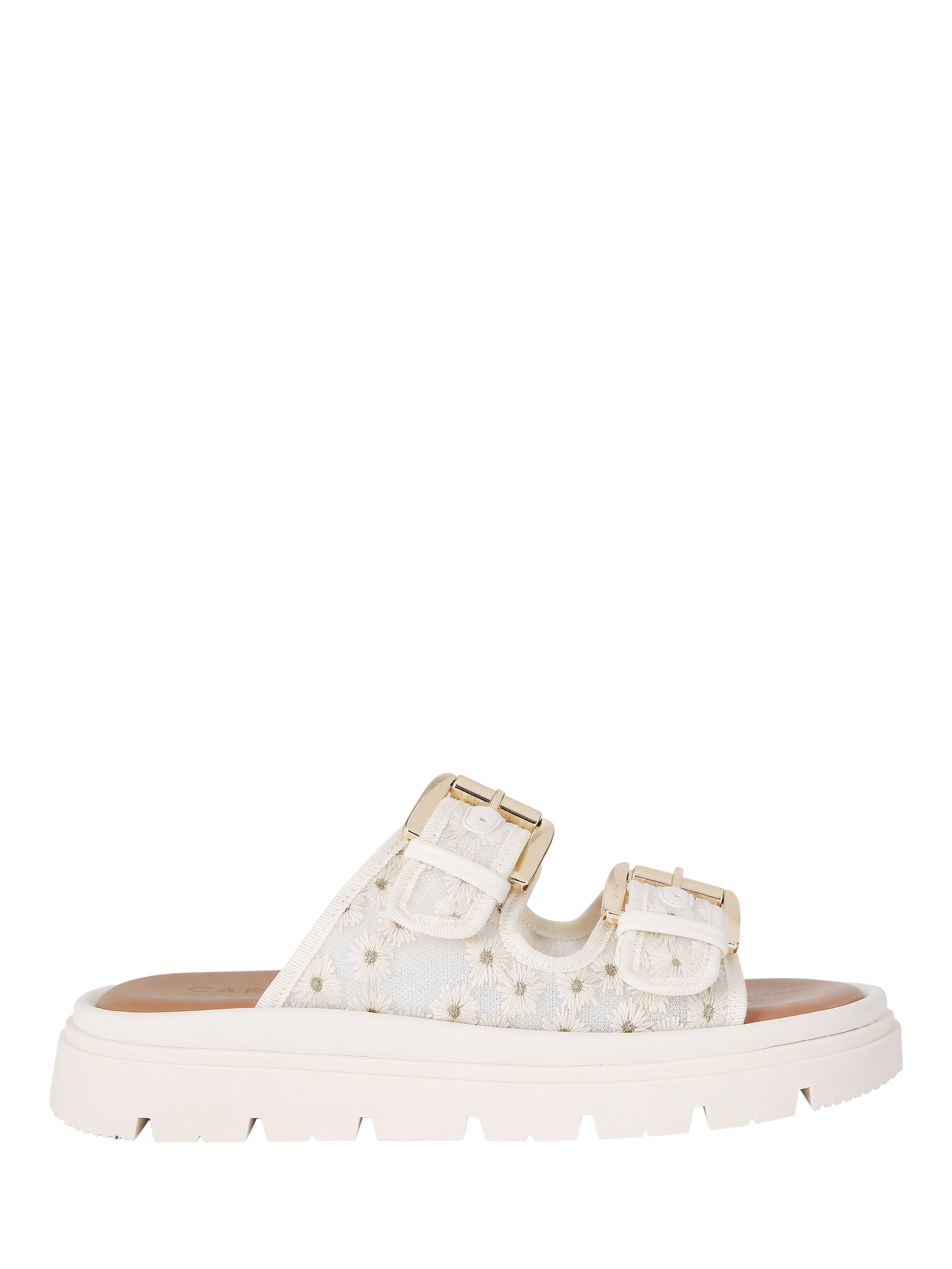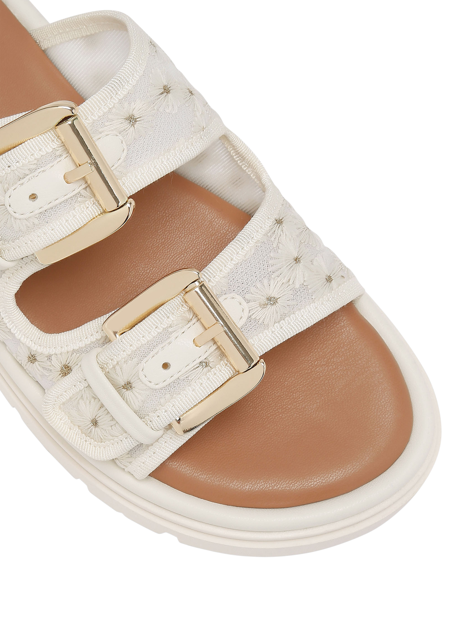 This Pavilion sandal is crafted from white mesh fabric that is embroidered with daisy flowers. Each strap is fastened with a gold-tone buckle, while the sole has a large tread.