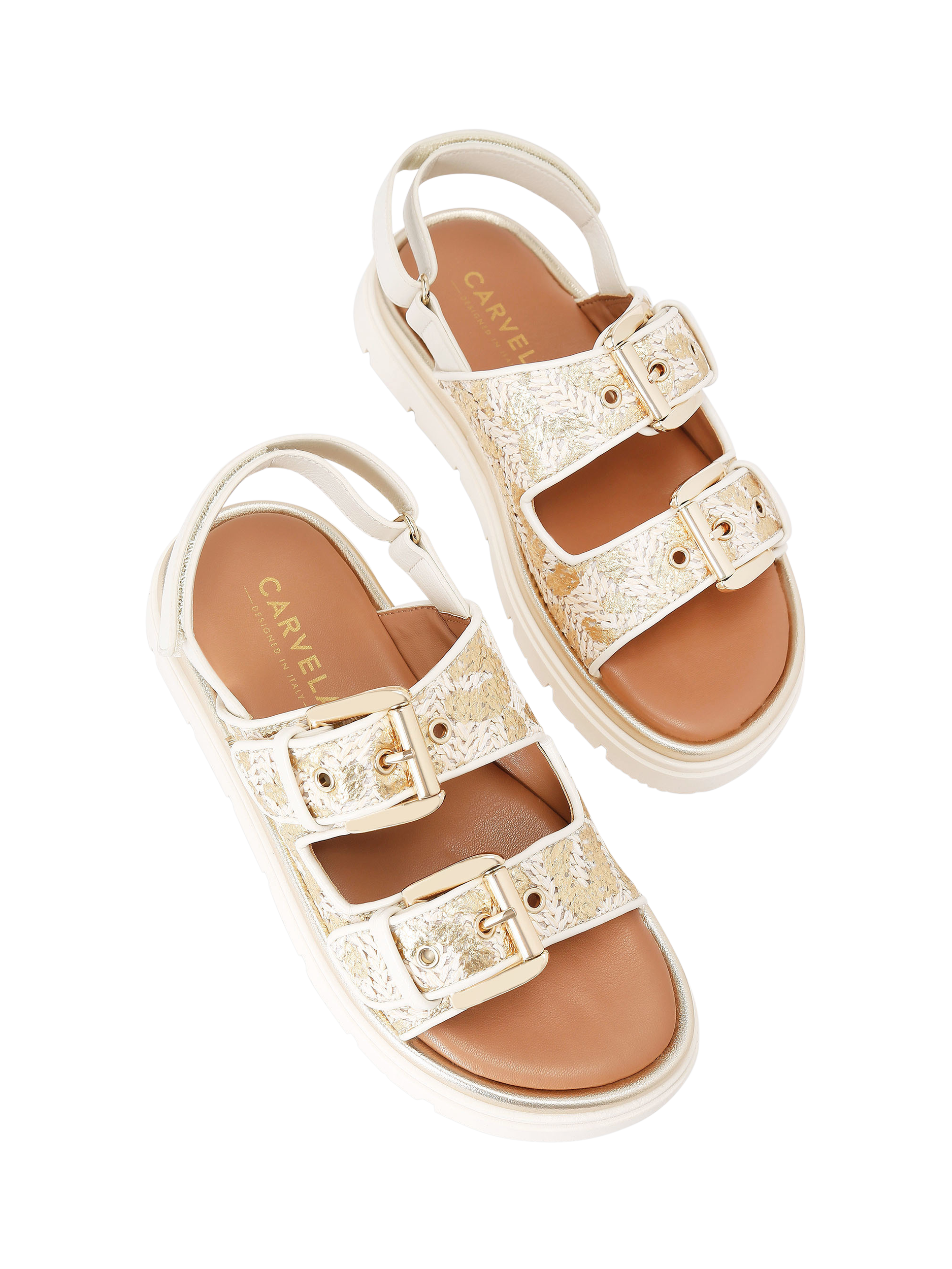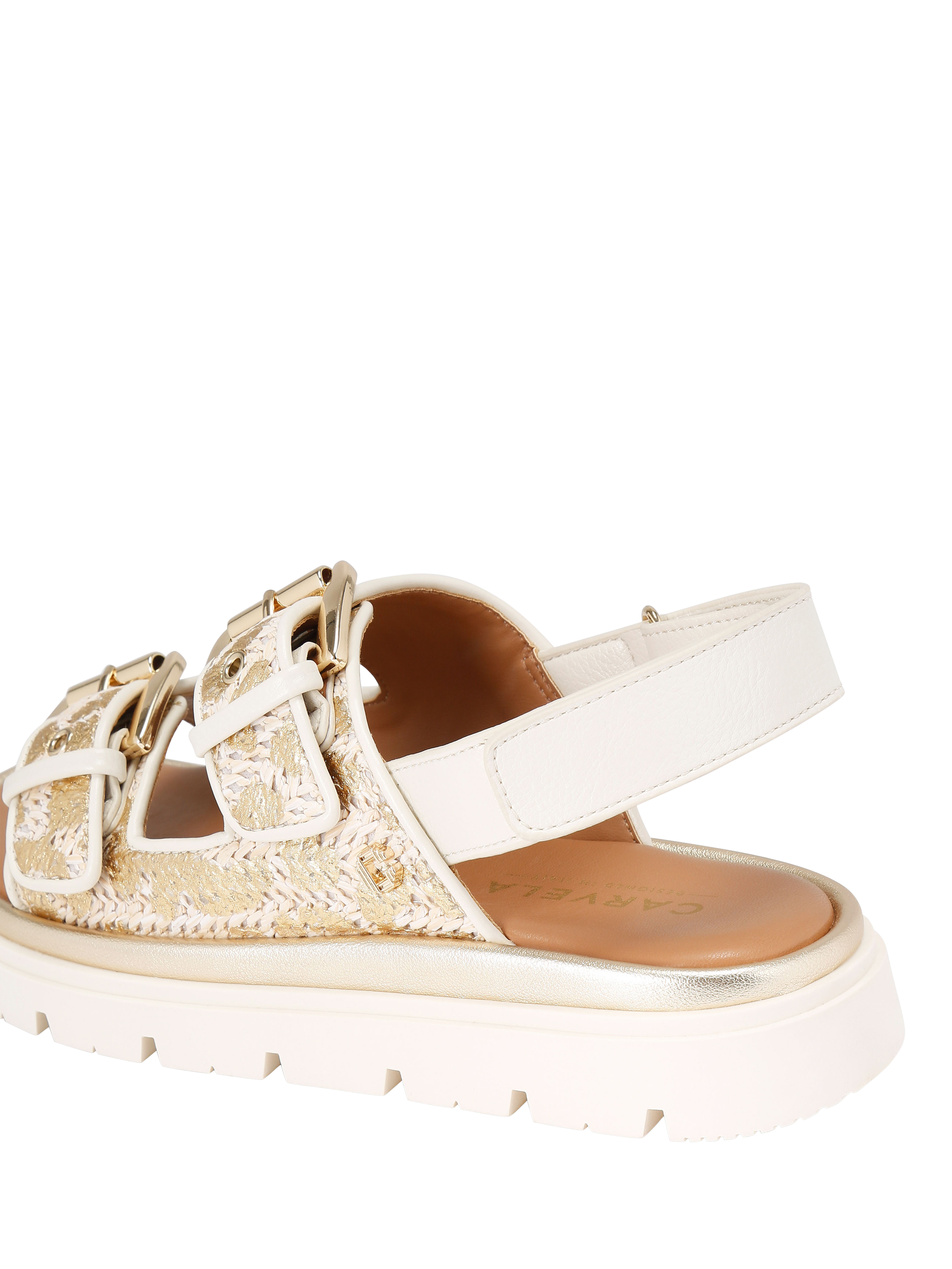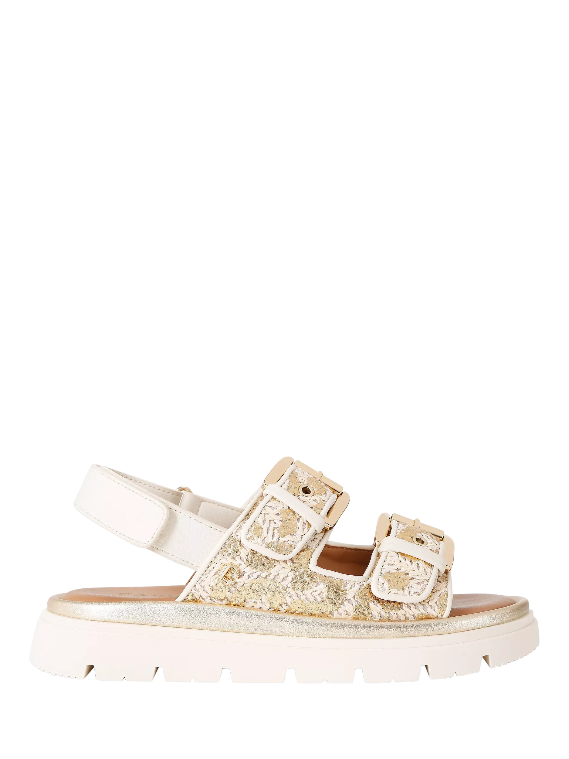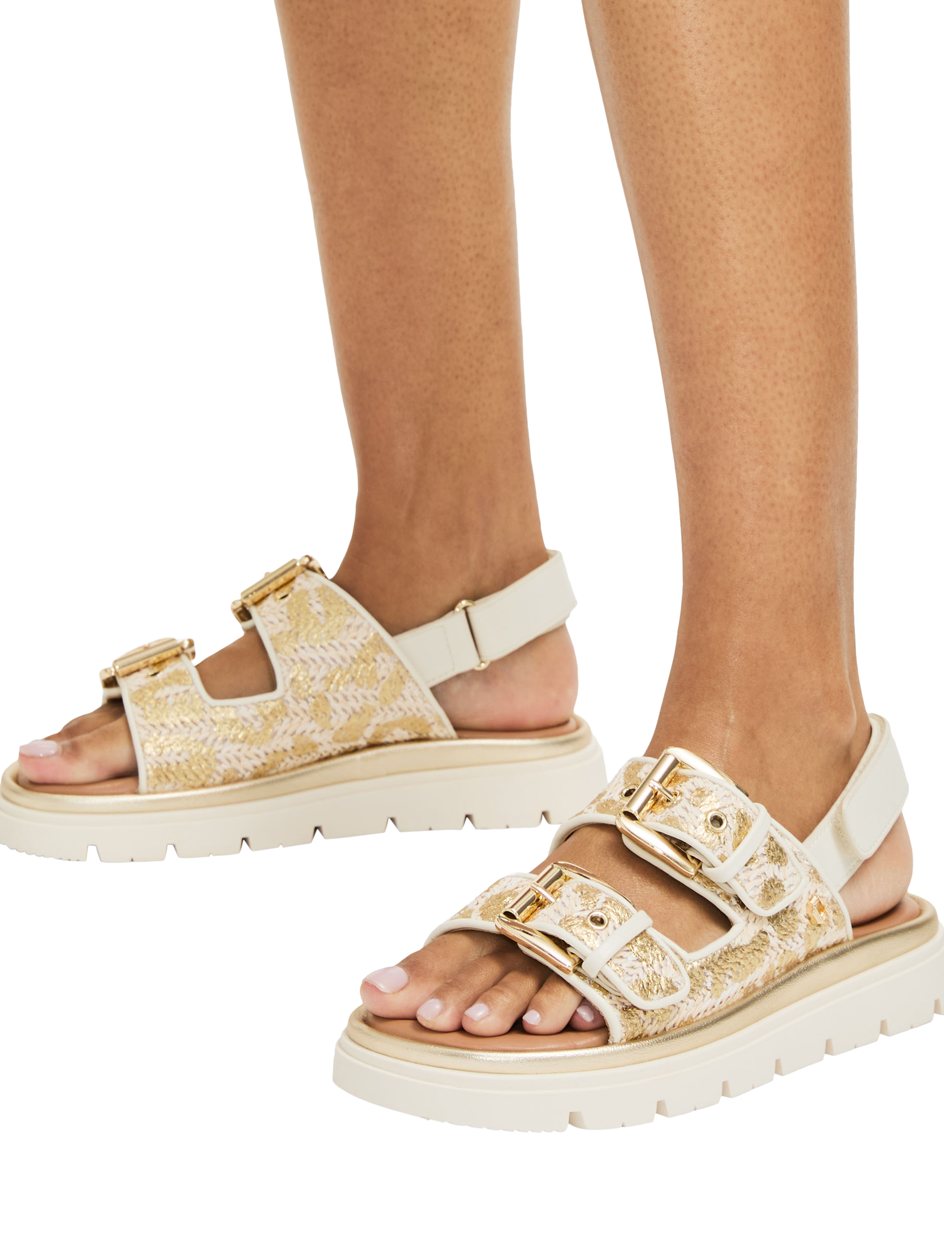 This Pavilion slingback sandal is crafted from raffia with metallic gold thread woven through and a slingback style strap on the back. Each strap is fastened with a gold-tone buckle, while the sole has a large tread.