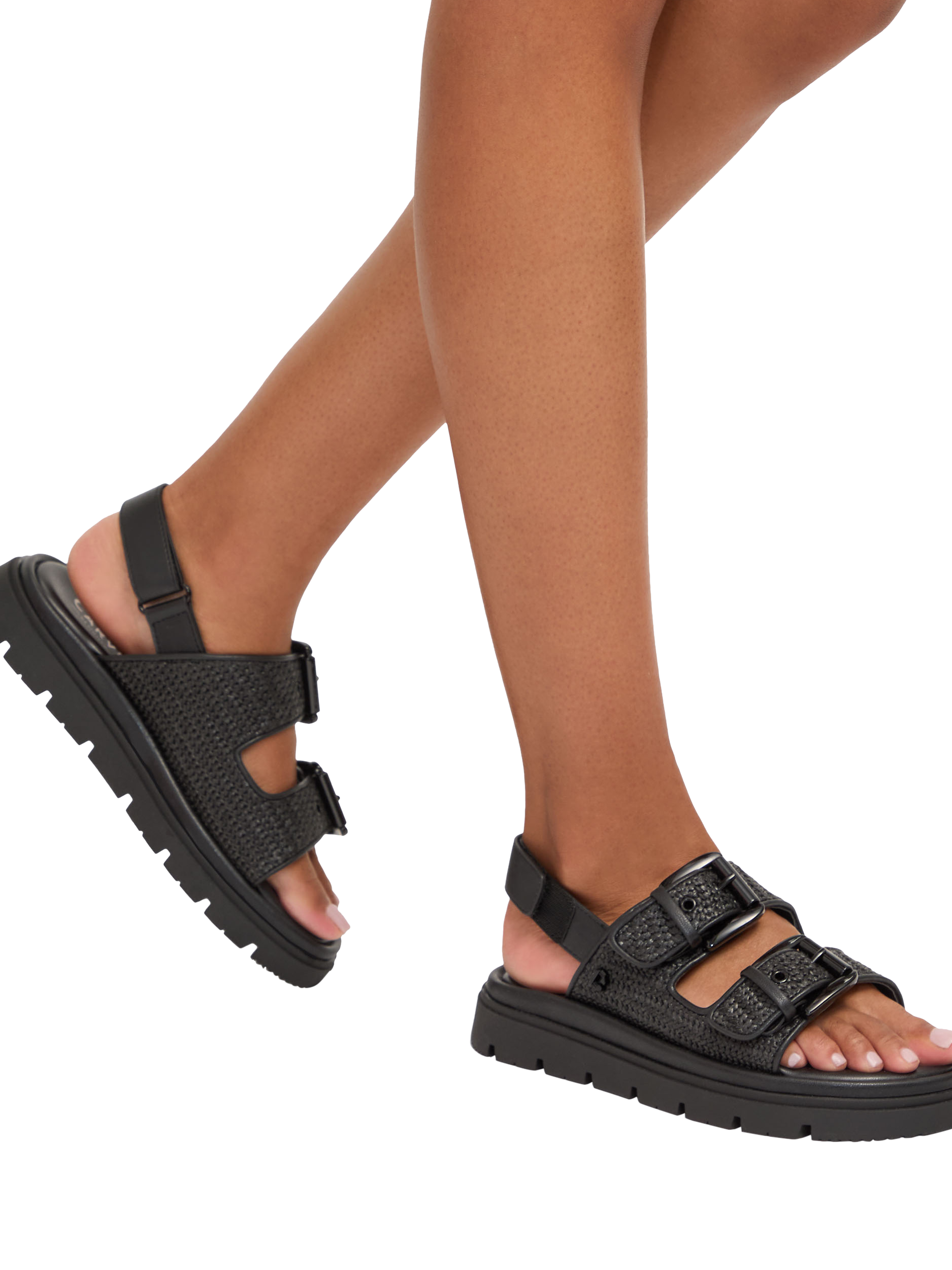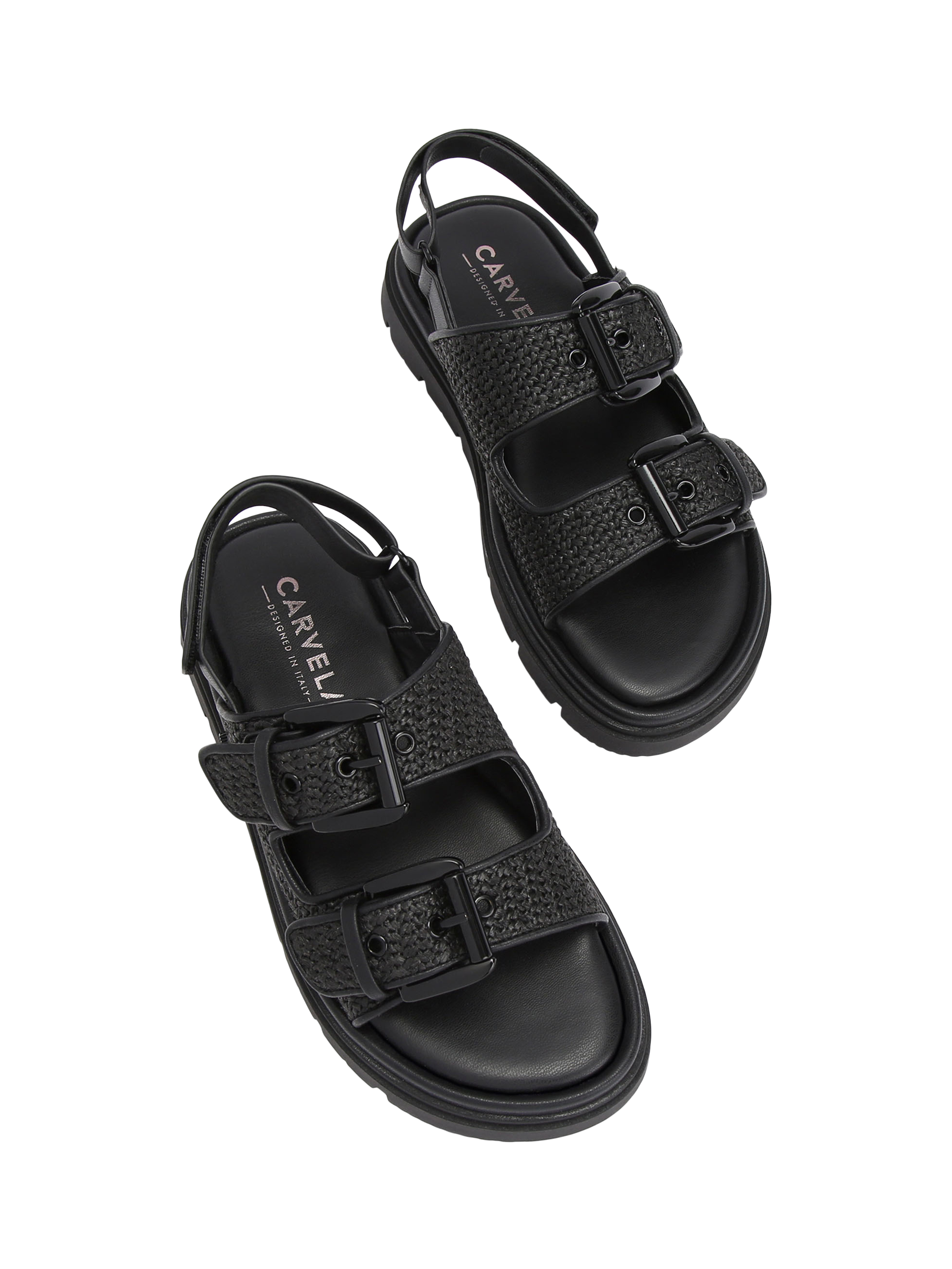 A favourite for warmer months, this pair of slingback sandals from Carvela is designed with double buckle straw uppers. Sitting on a flat heel, they are designed with a comfortable footbed for everyday appeal.