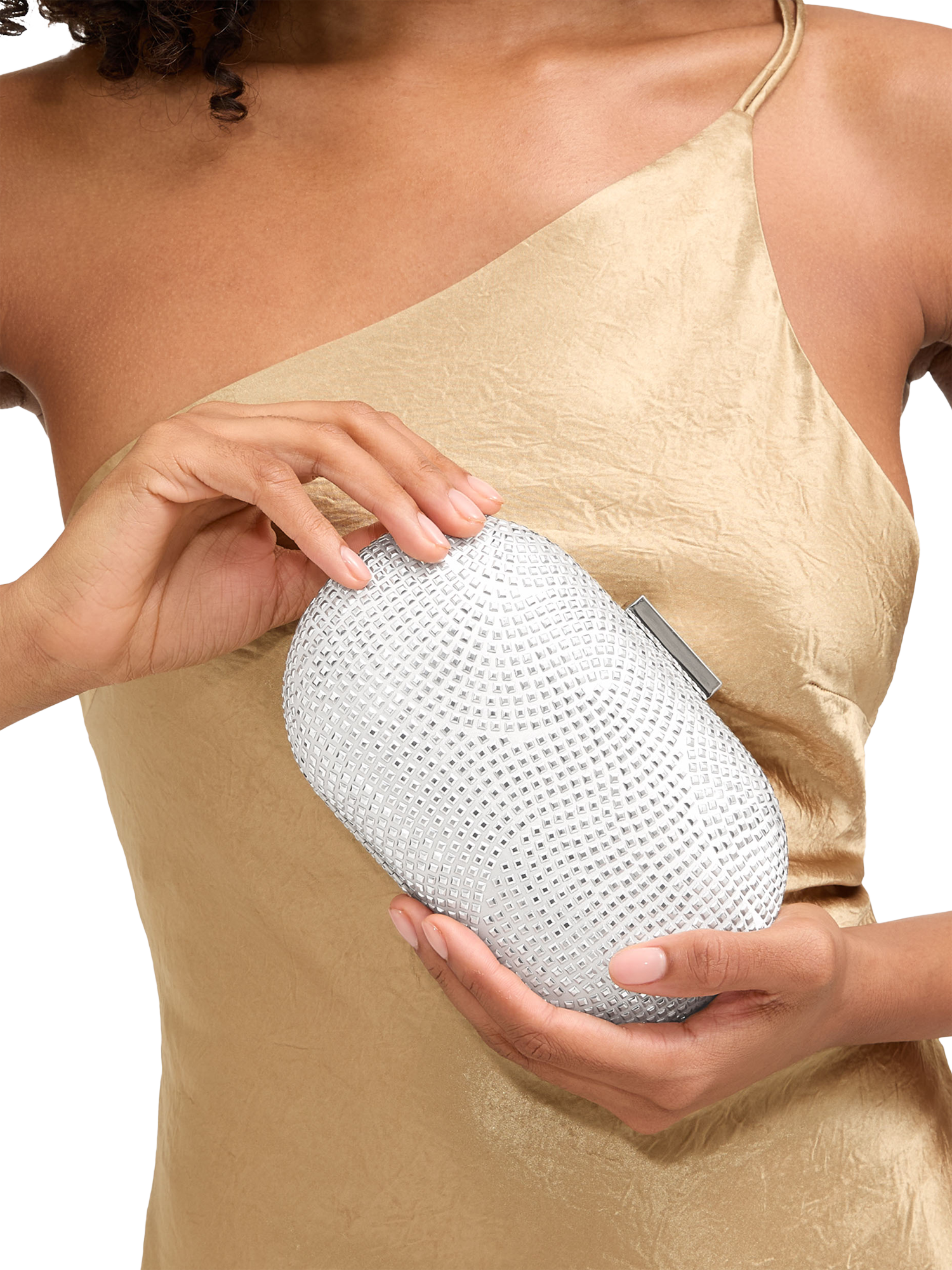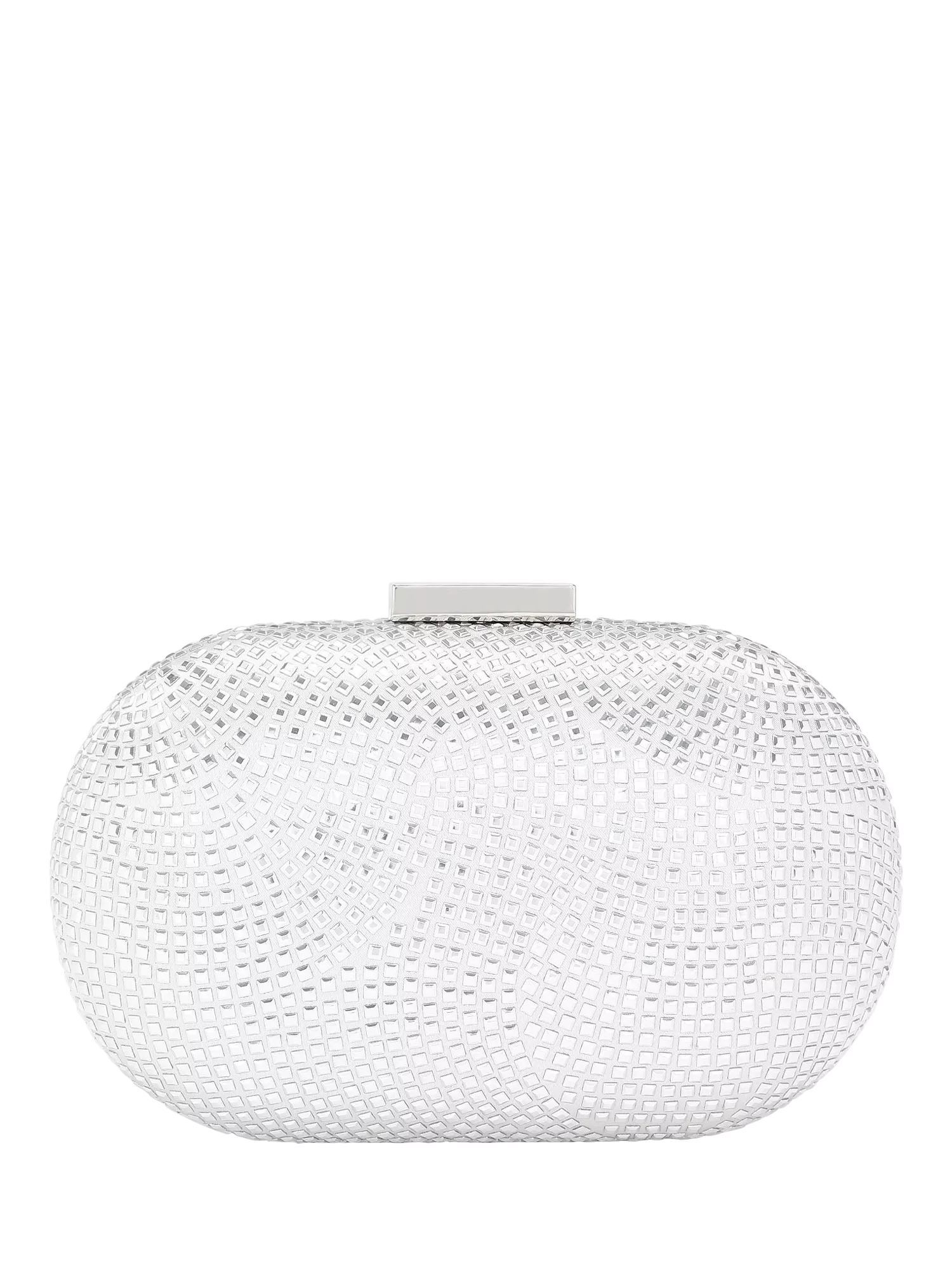This Pietra hard clutch bag is a structured pill shape in satin fabric with studded embellishment across the exterior. Fastens with a clasp closure.