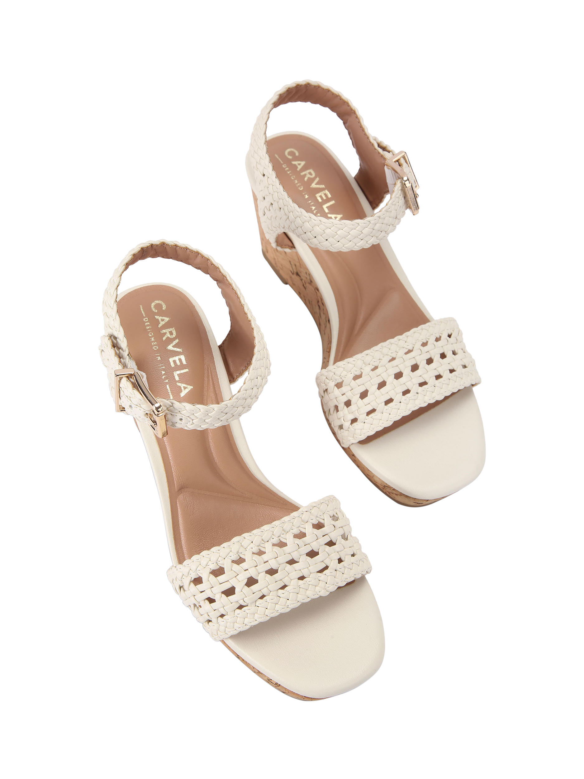 A pair of woven heeled sandals by Carvela. The mid wedge gives you lift without losing comfort, while the adjustable strap ensures a perfect fit.