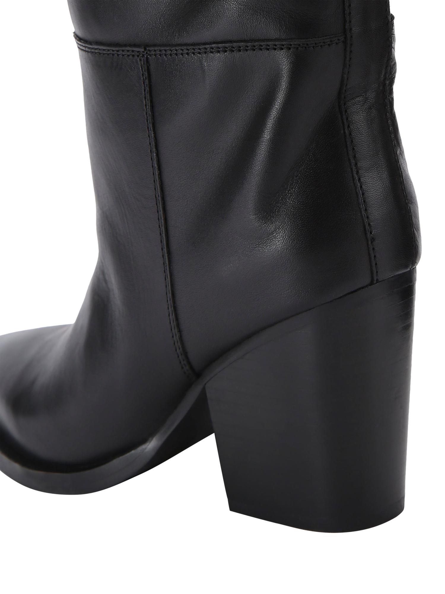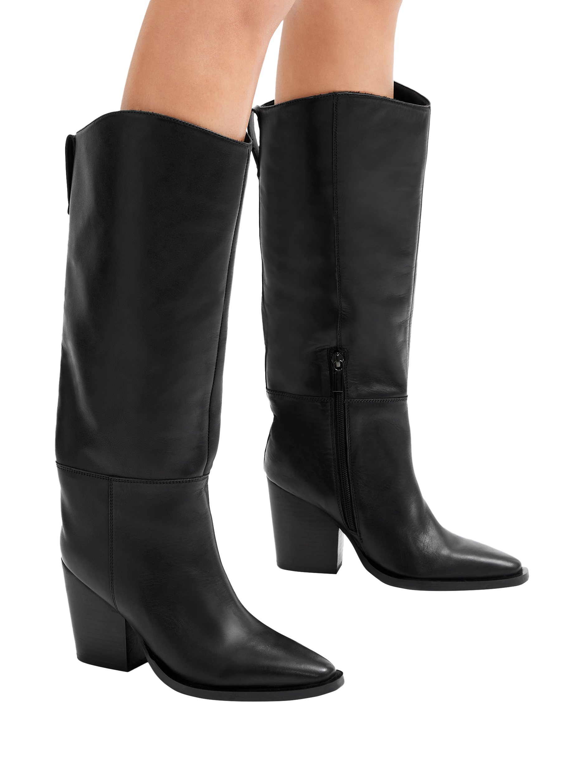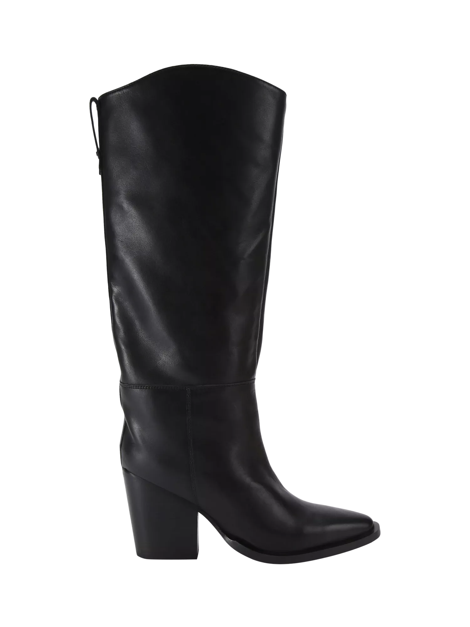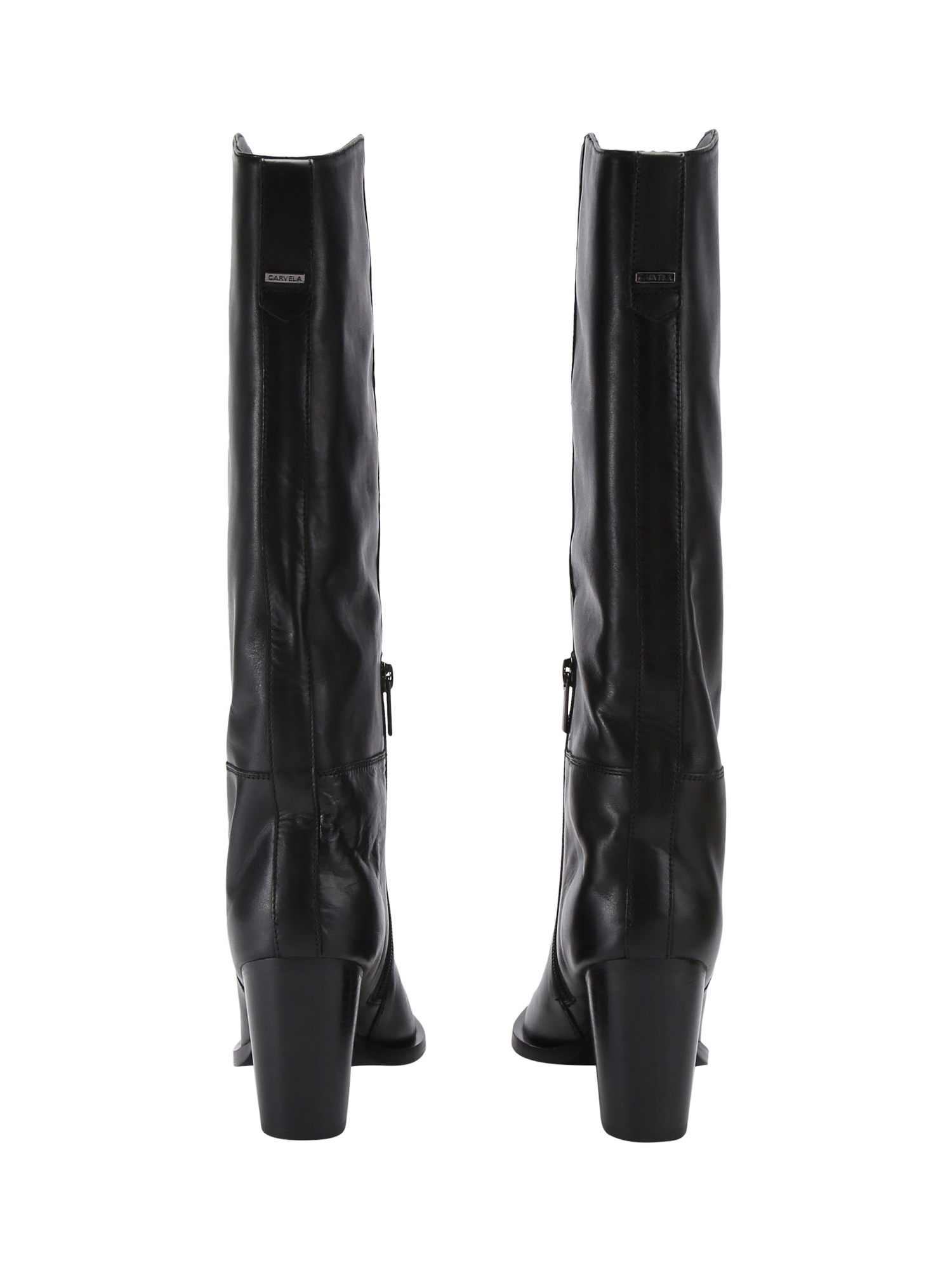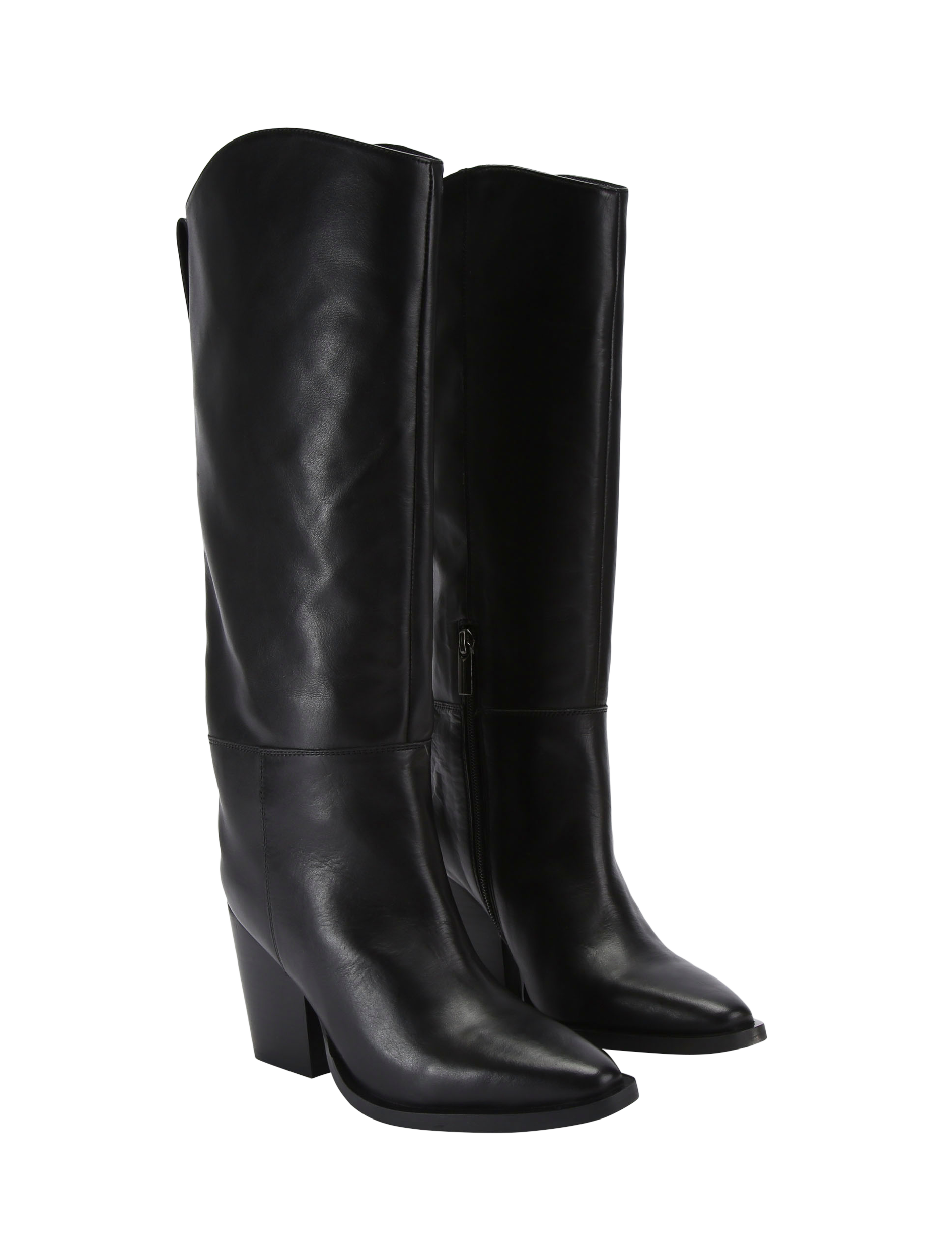 From Carvela, these Reign calf boots feature a black leather upper with a Western silhouette and a Cuban-style heel. An interior ankle zipper offers easy access.