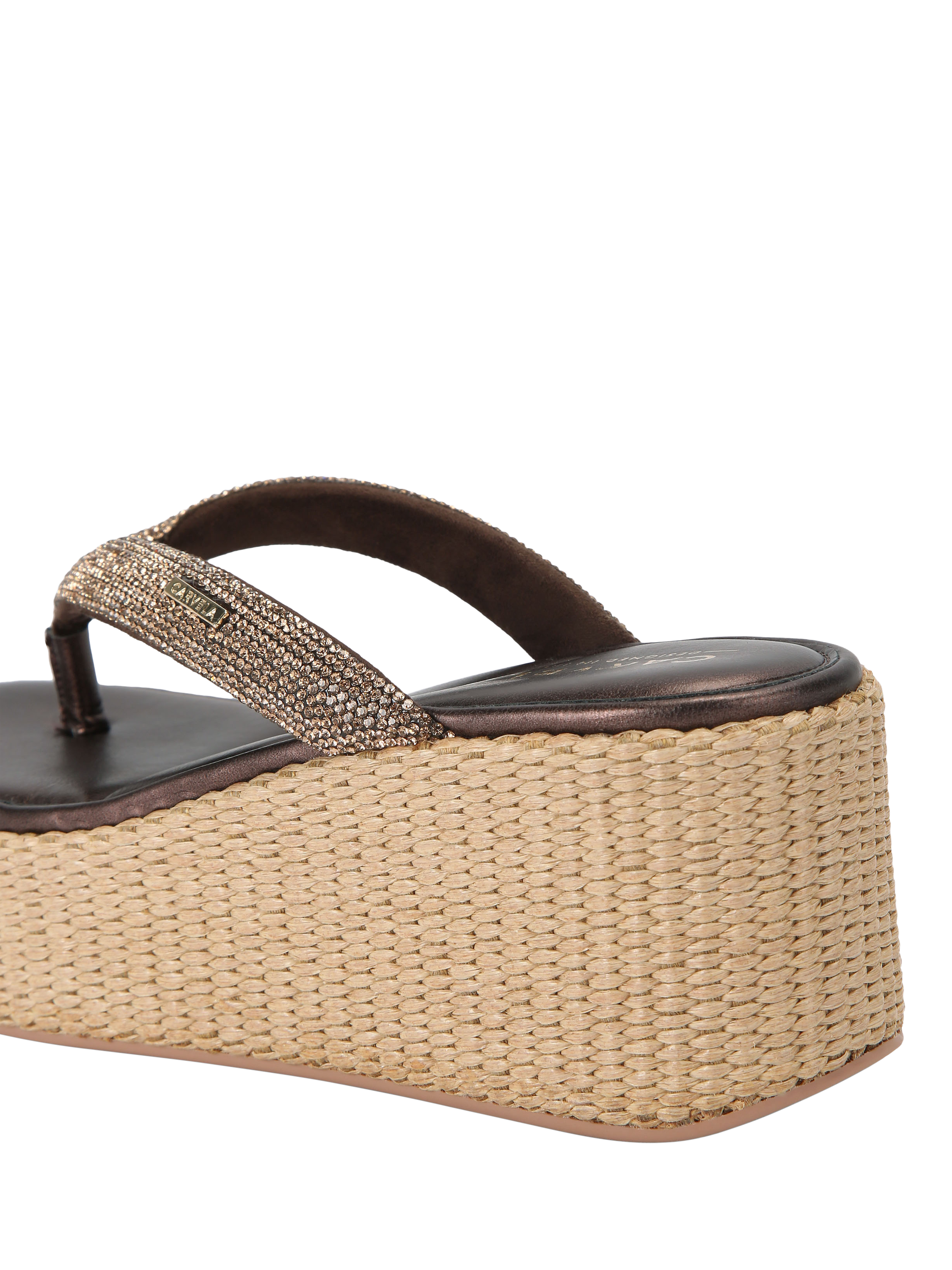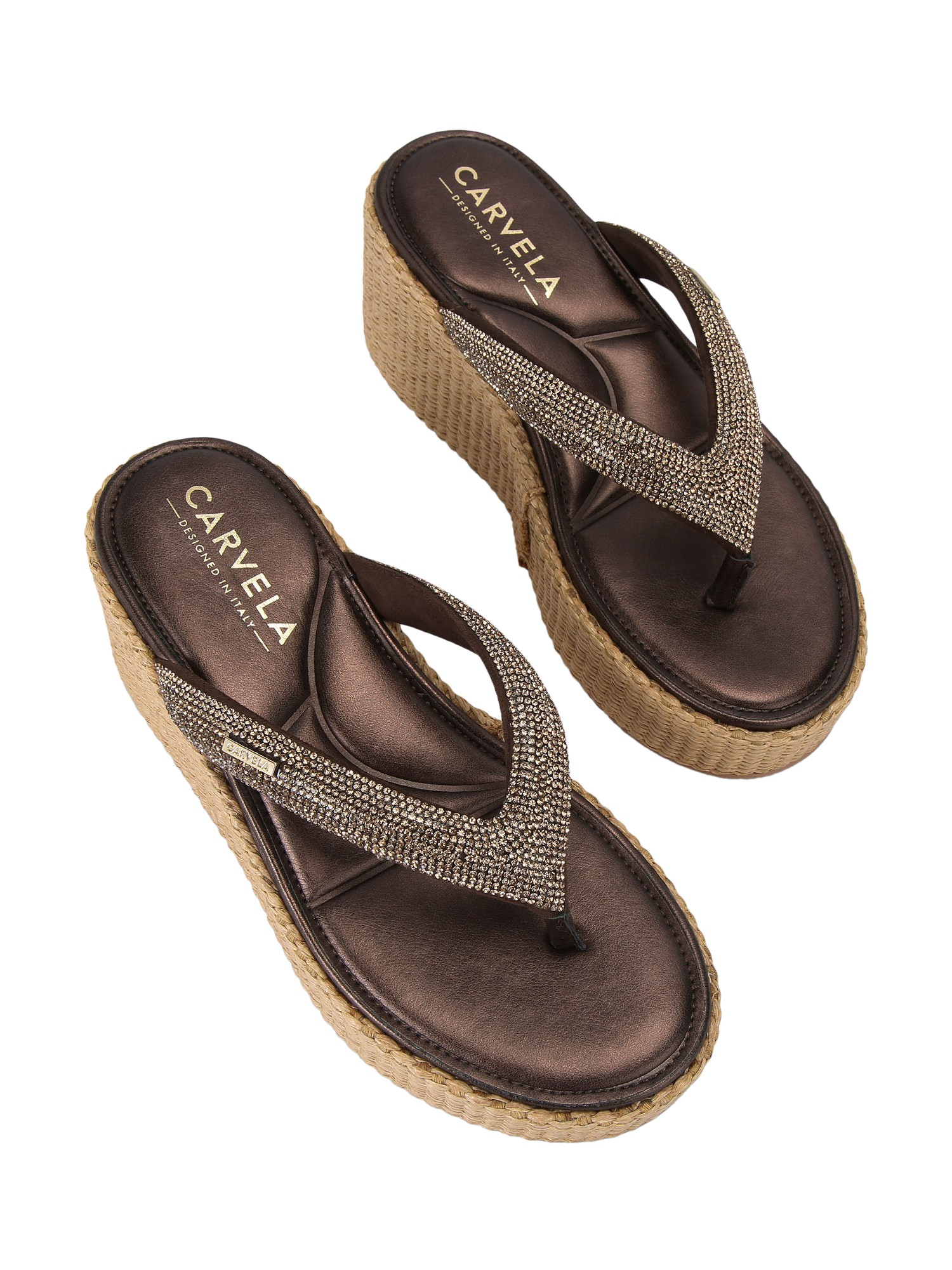 Carvela footbed sandals, designed for all-day comfort. Enjoy the height boost of an 8cm flatform heel, open toe design, and striking embellished finish with easy slip-on wear.