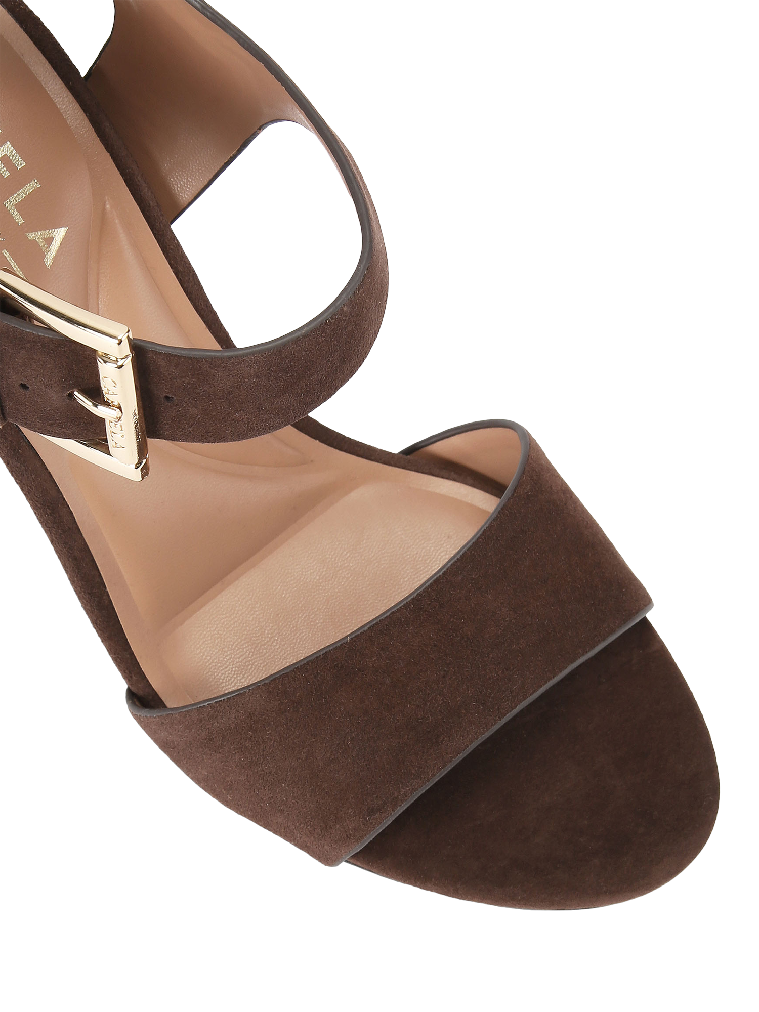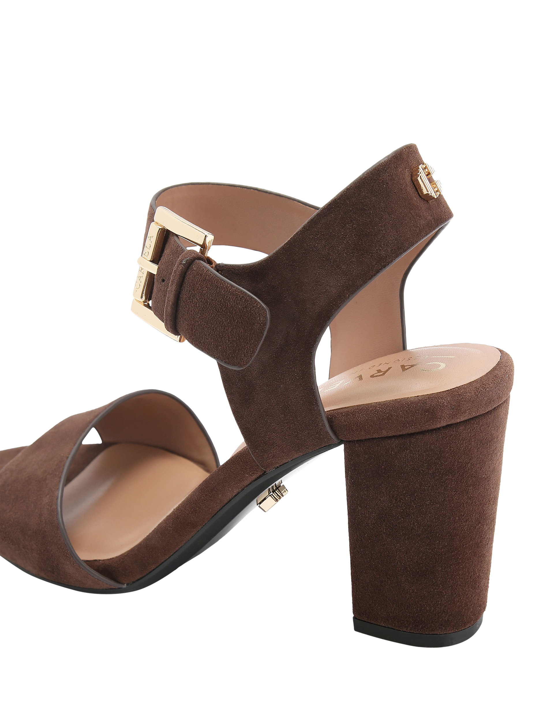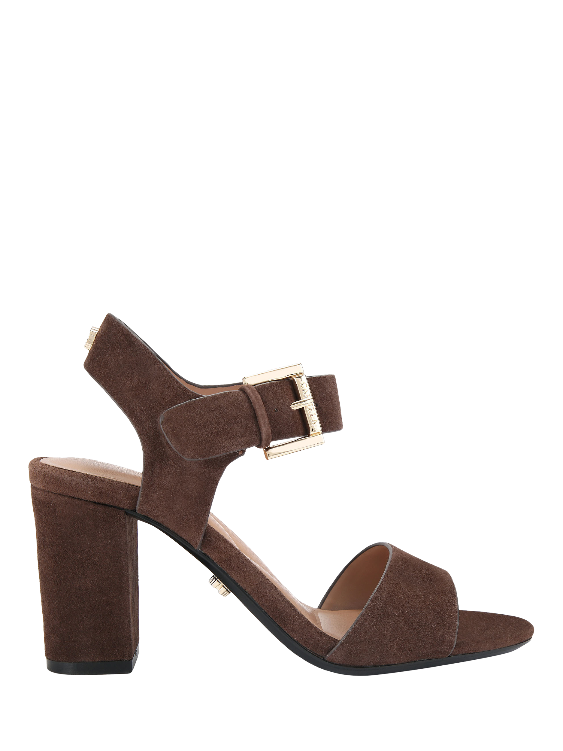 These Sadie sandals are made from soft suede. Featuring a block heel, there is a strap across the toe as well as a strap across the ankle, which is fastened with a small gold buckle.