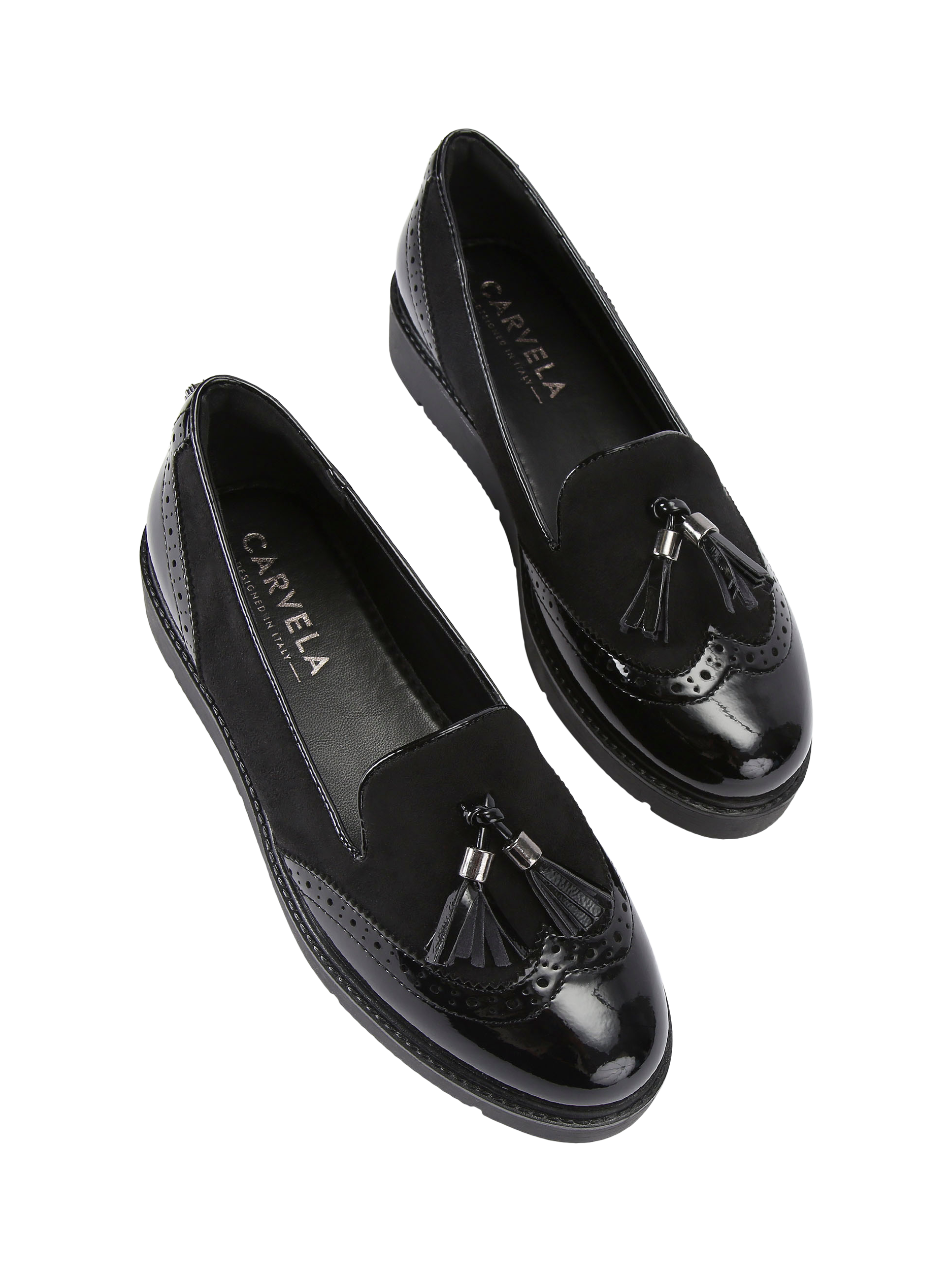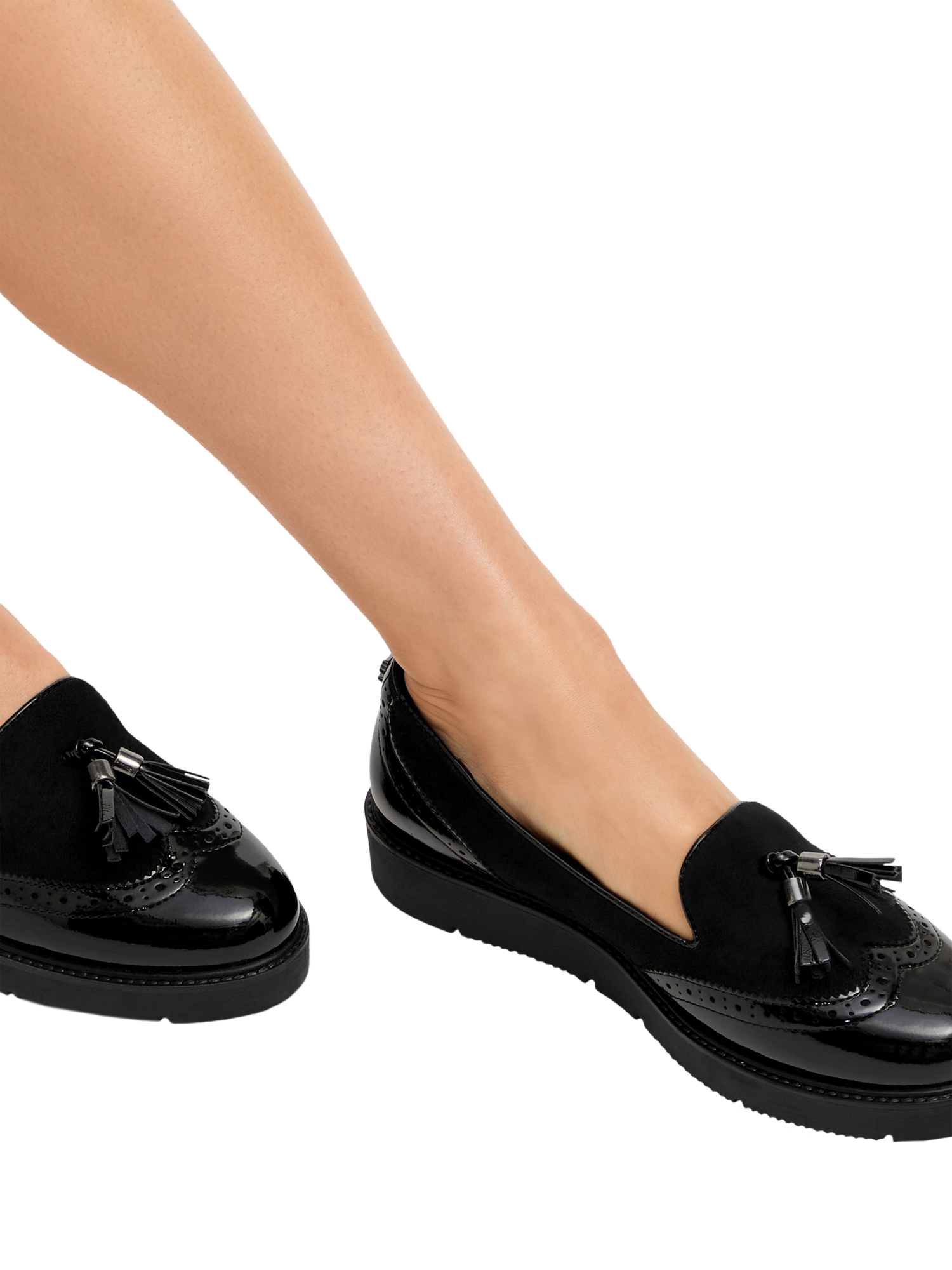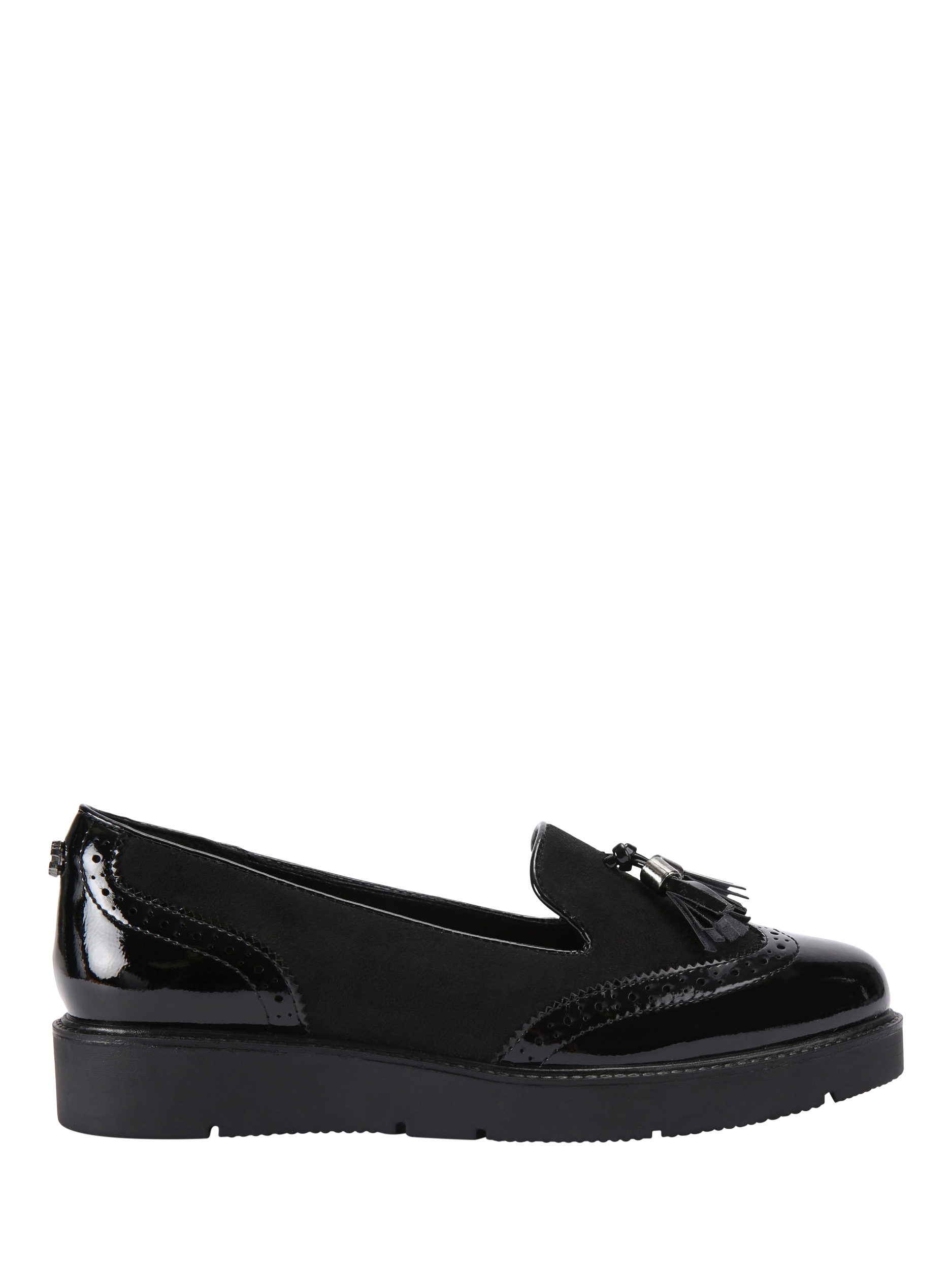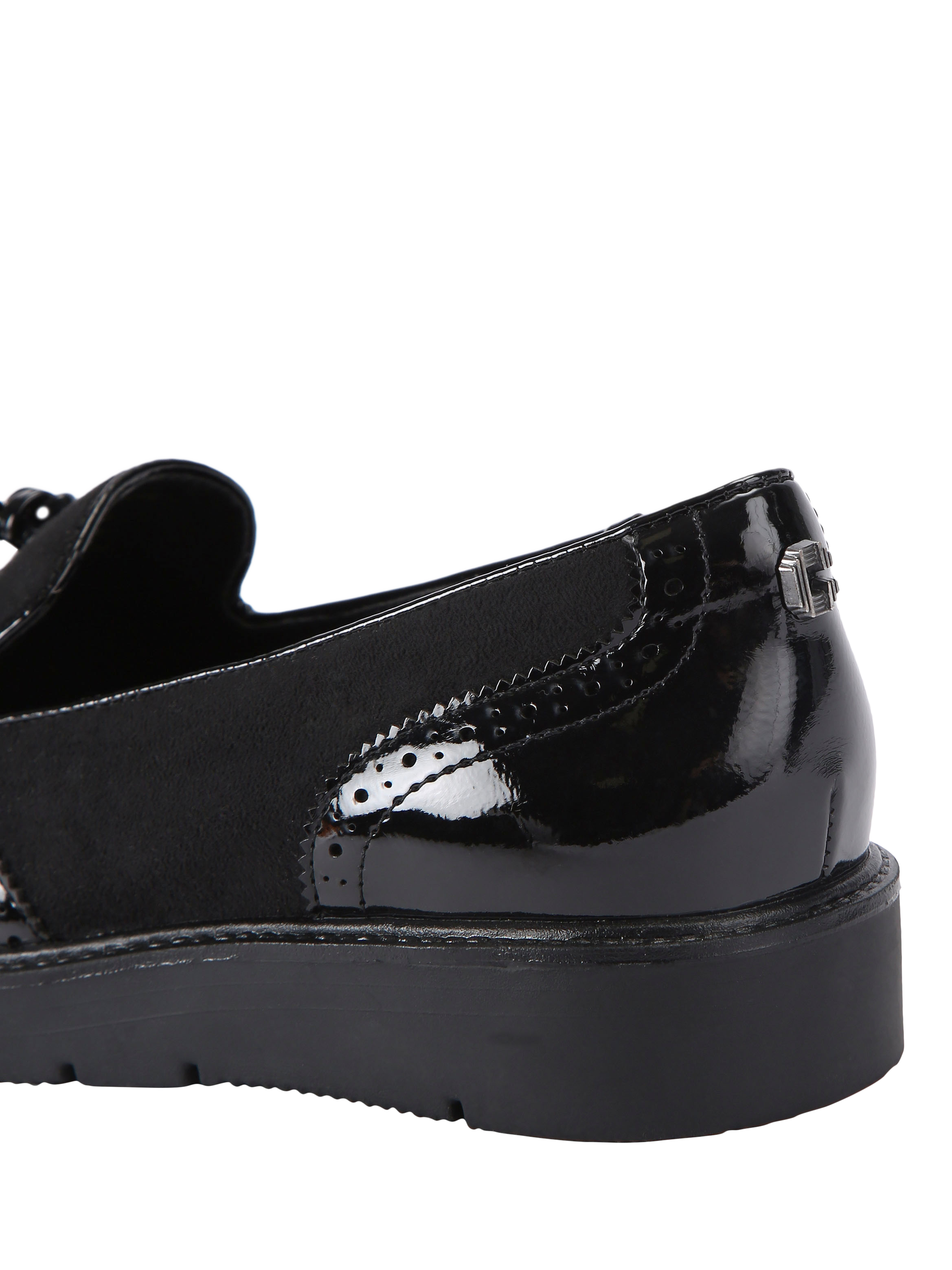 The Sky Brogue has a faux patent leather upper with brogue detailing and faux suede accents. A statement tassel detail and wingtip stitching across the rounded toe complete this slip-on loafer.