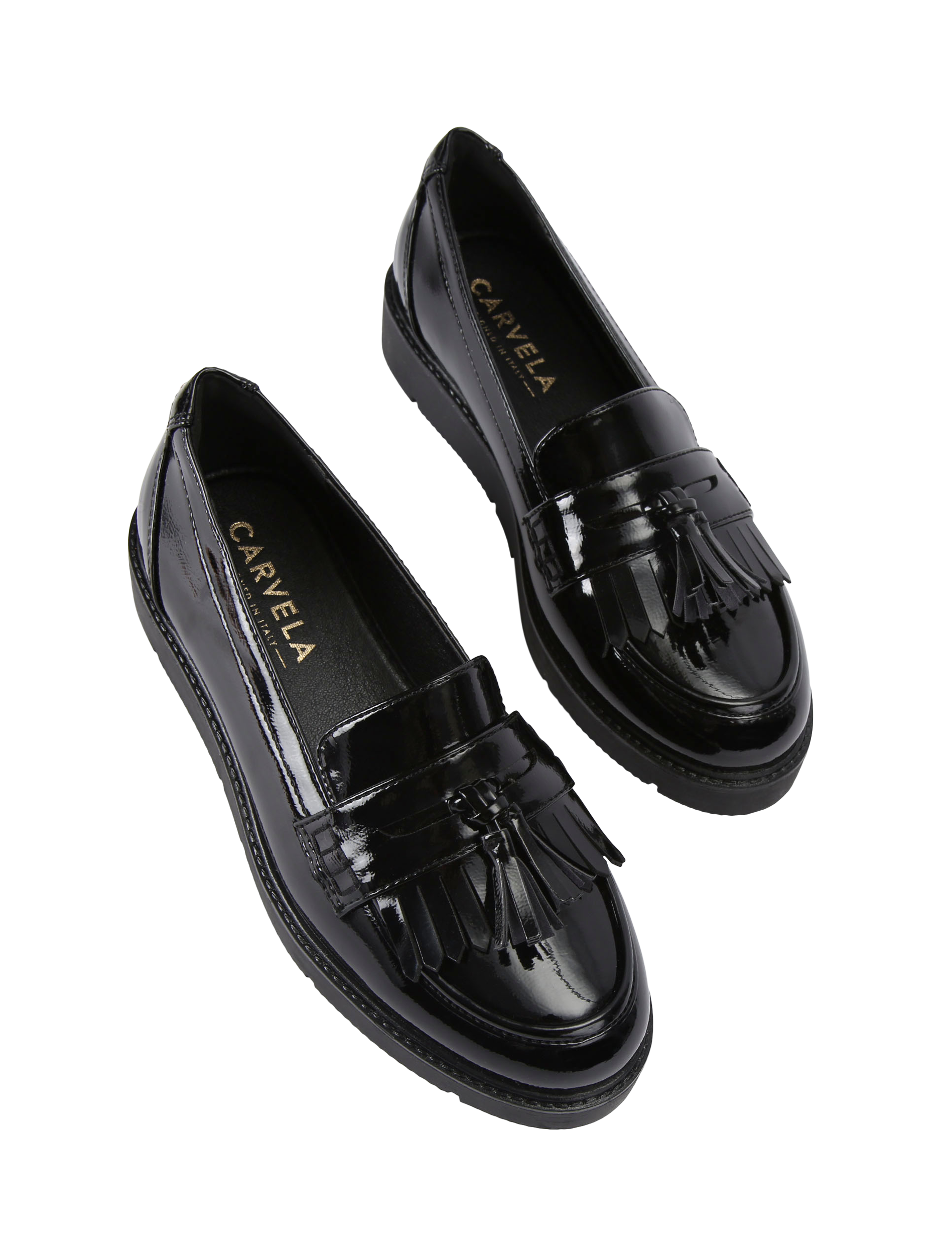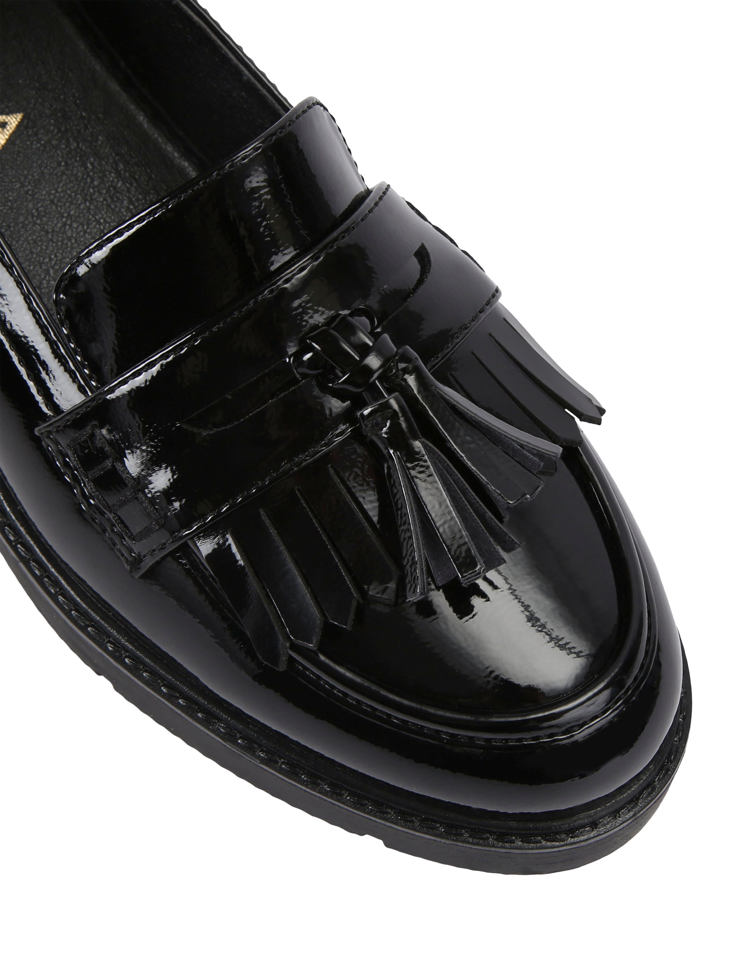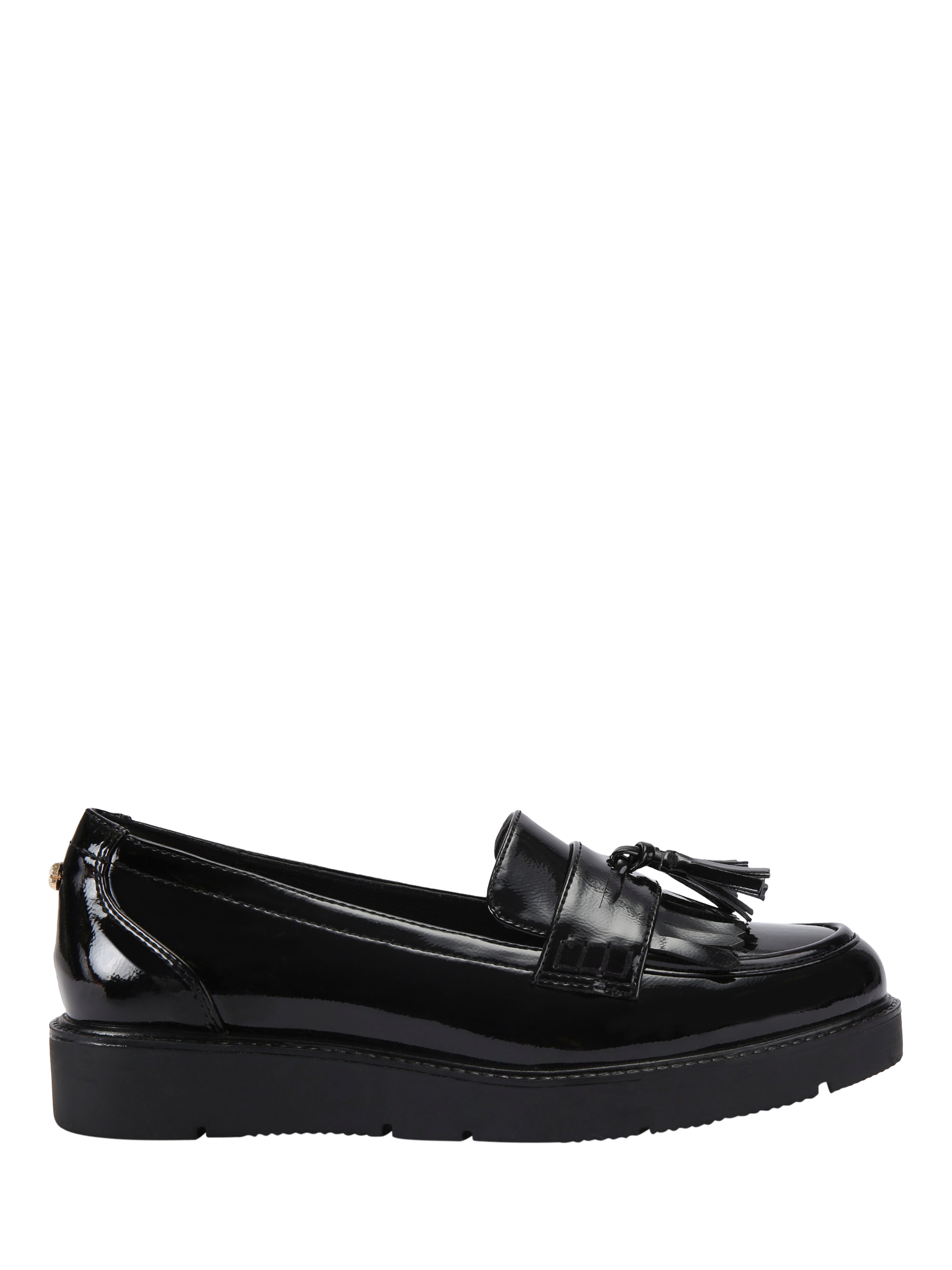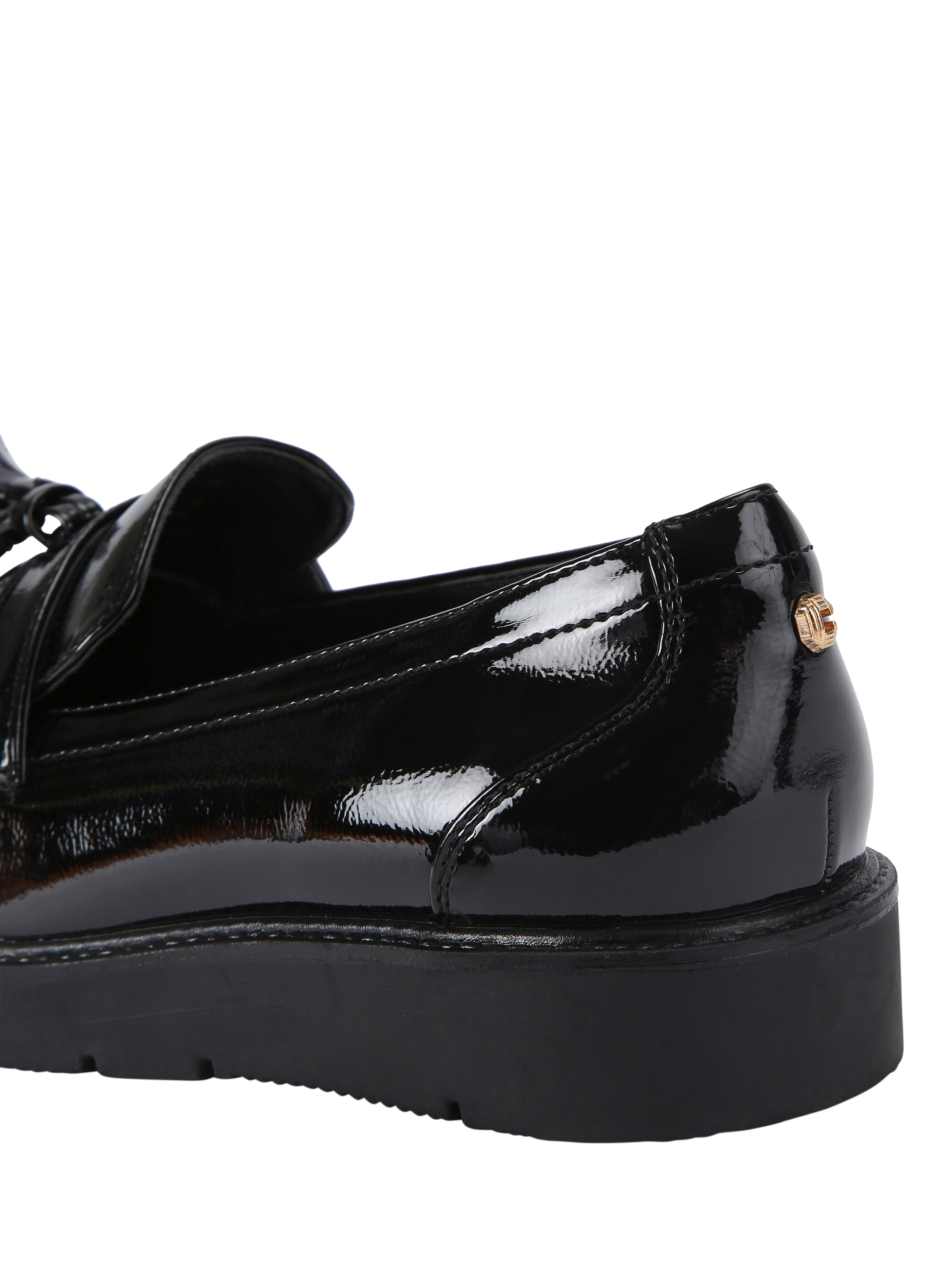 The Sky Tassel slip-on loafer has a faux patent leather upper with a statement tassel detail across the rounded toe.