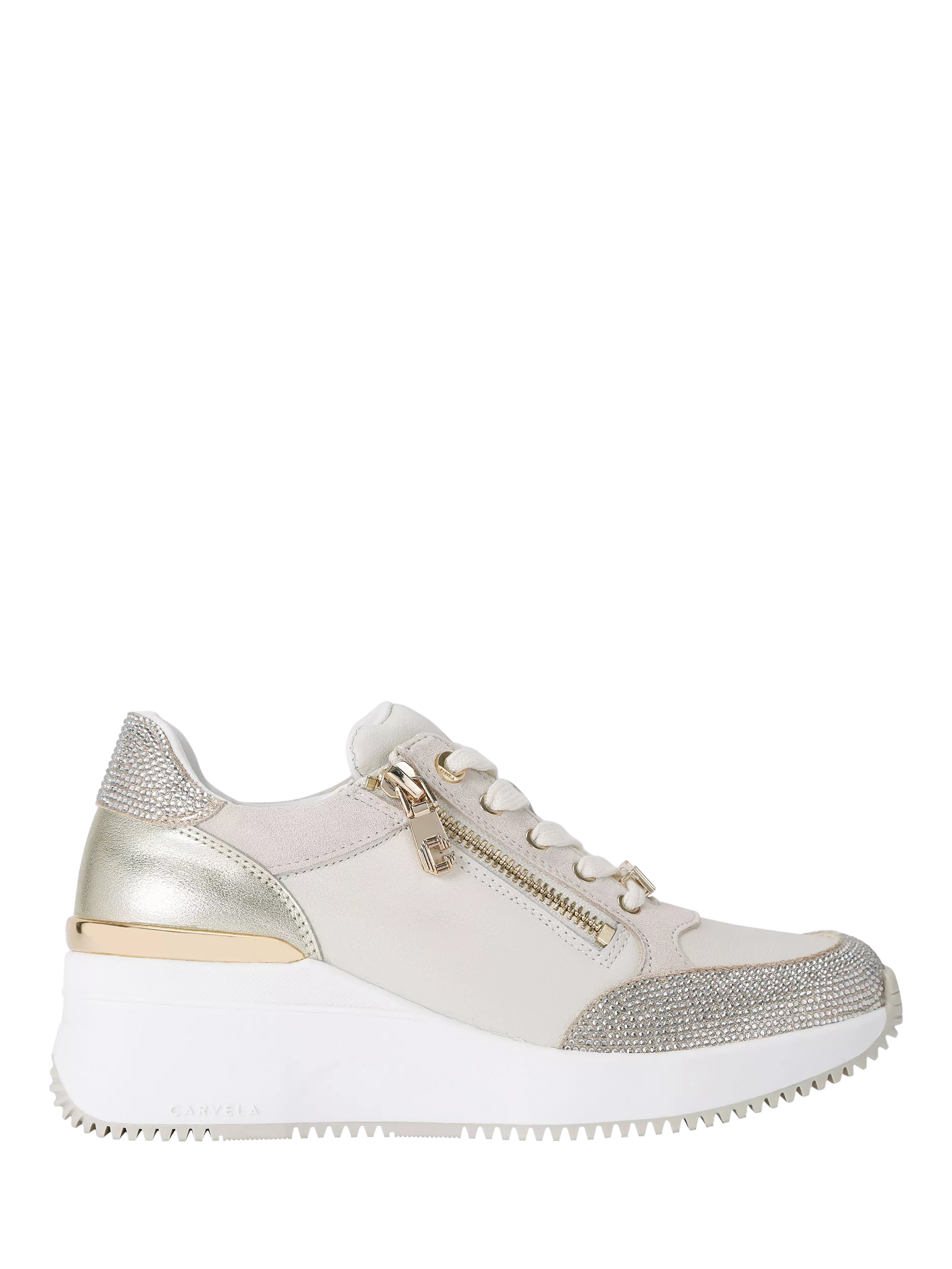 This Carvela Skyline trainer features a hidden wedge heel within the footbed. There are gold eyelets and hardware across the shoe, whilst the toe and heel are embellished with crystals.