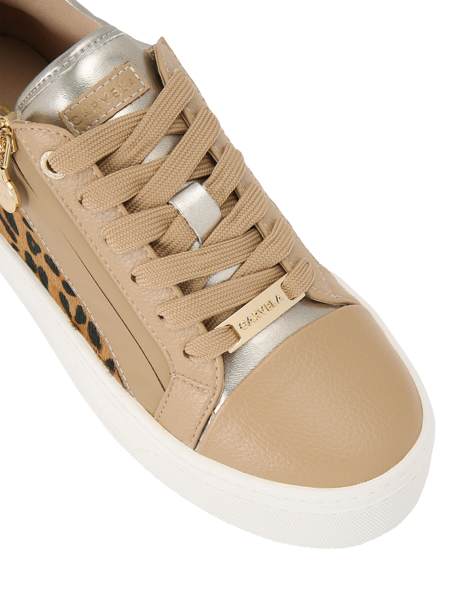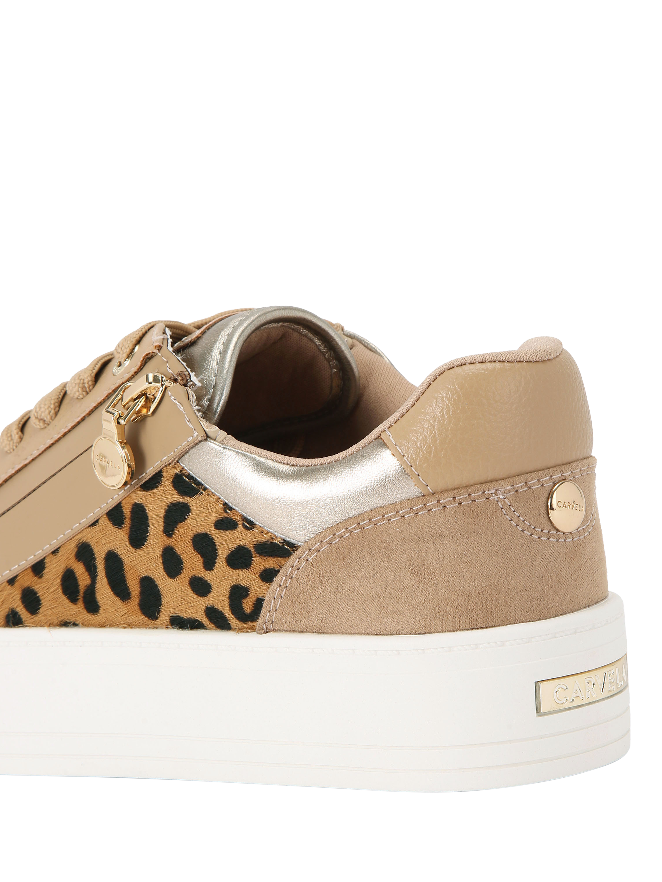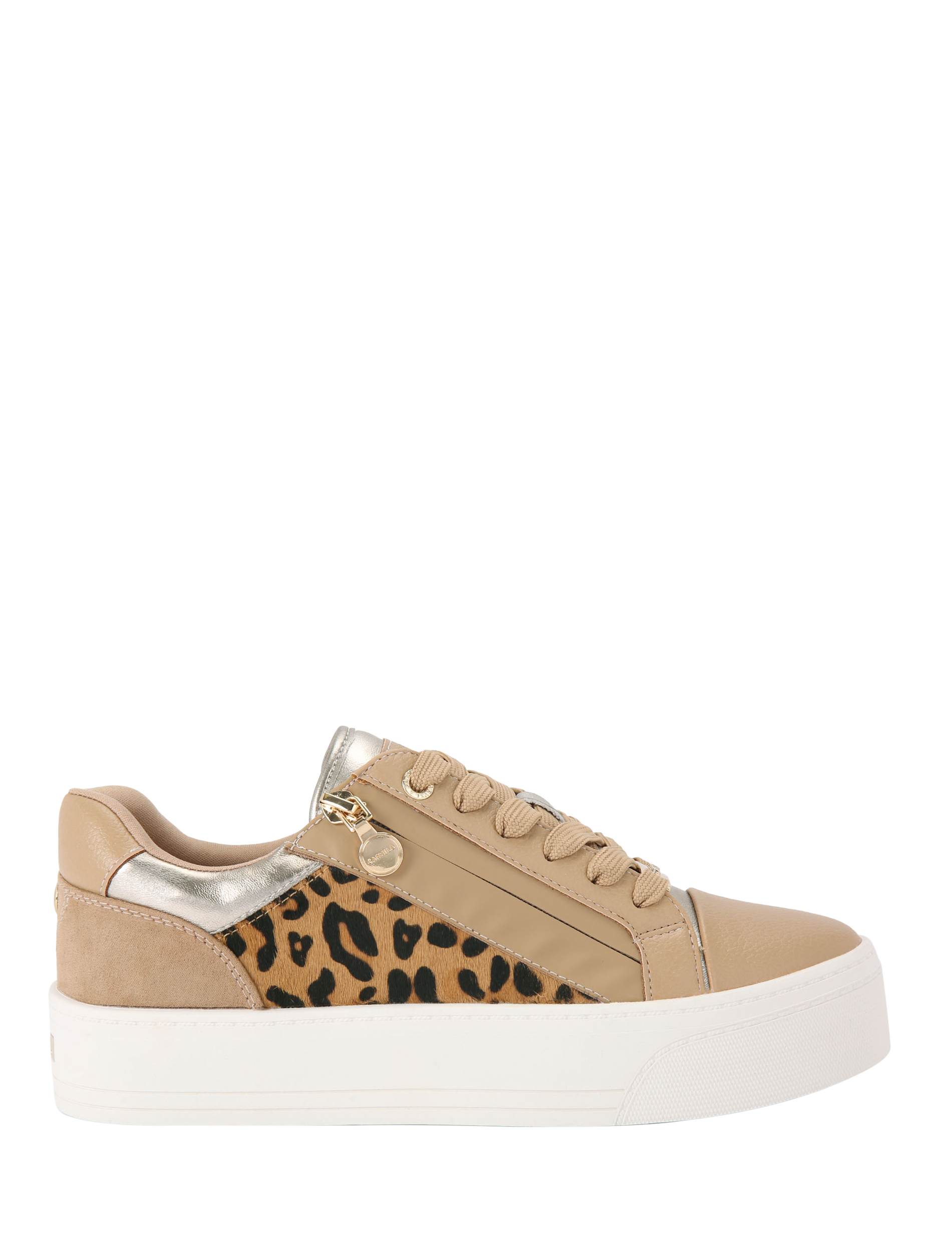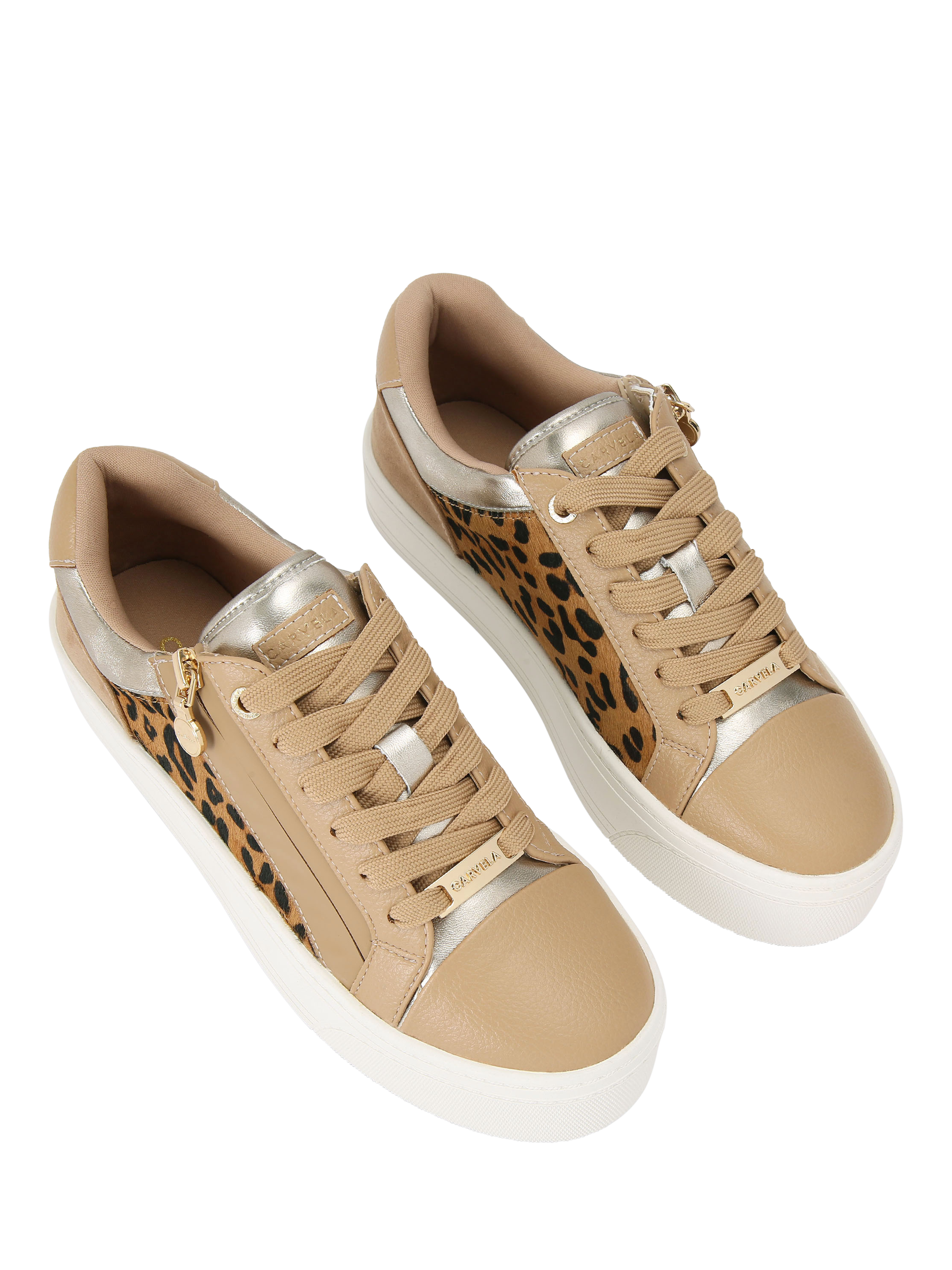 Carvela statement lace-up trainers, featuring a leopard pattern and a comfortable flatform. Practical zips ensure easy wear for busy days, keeping you confident and ready for whatever comes your way.