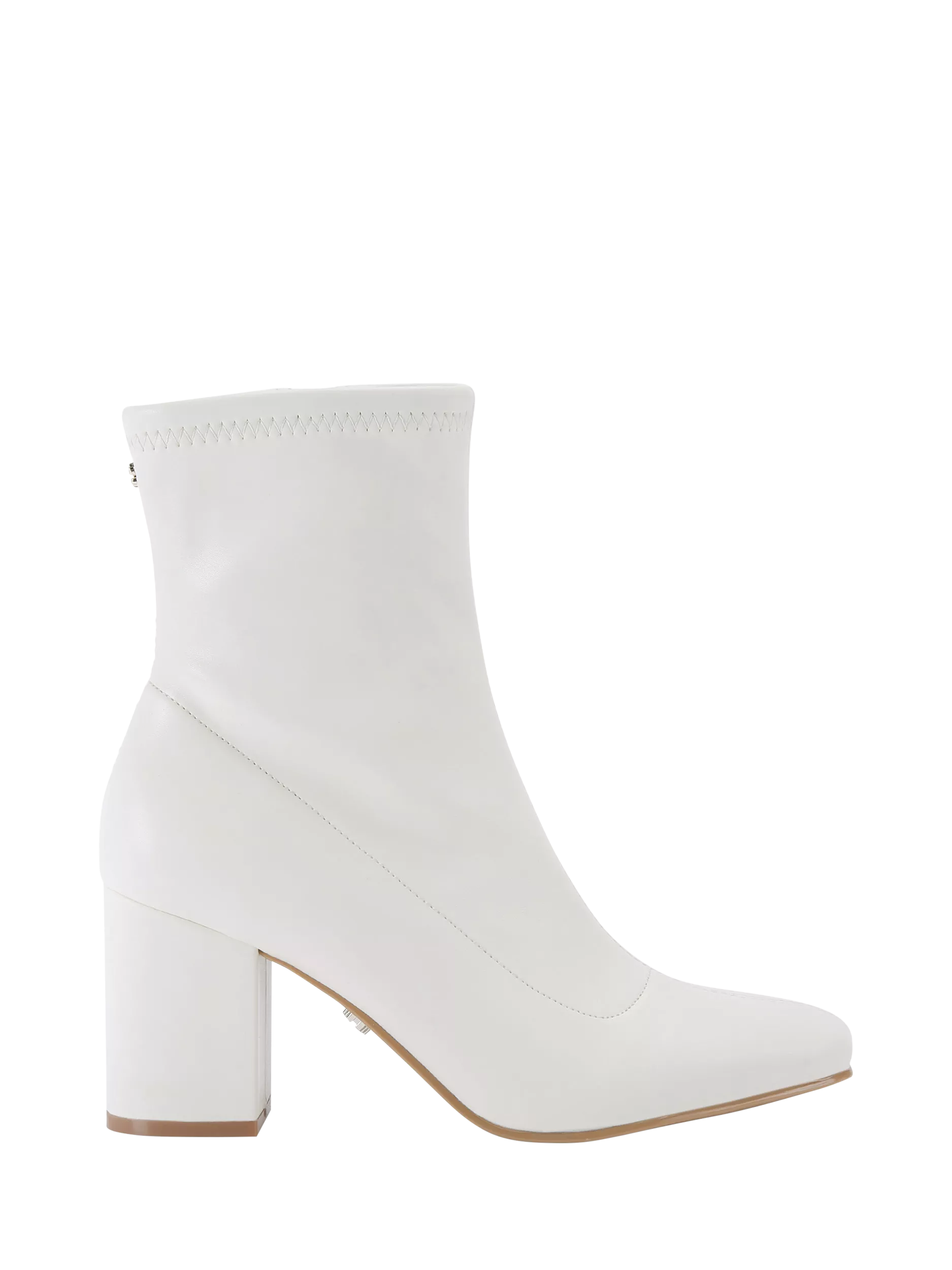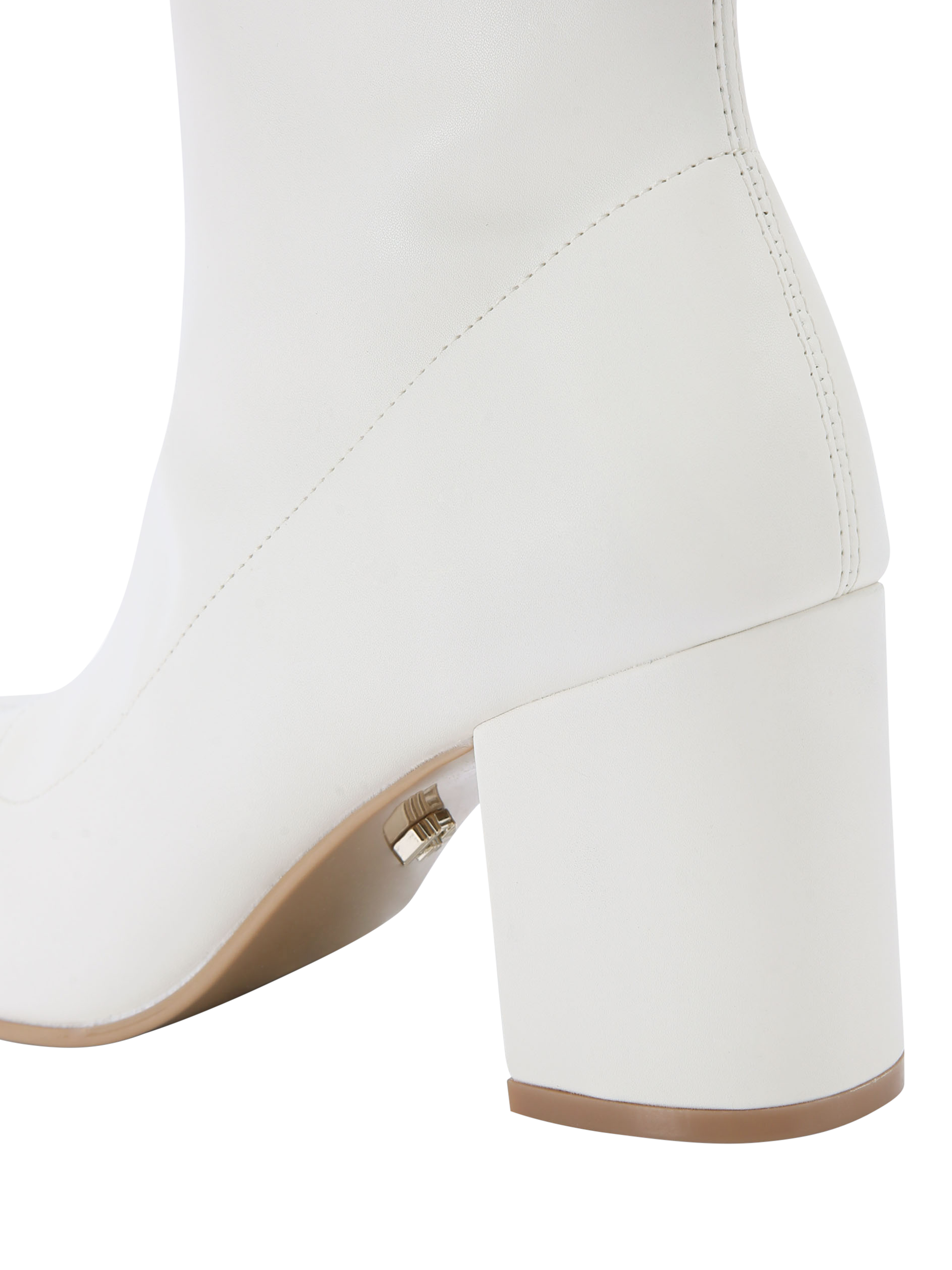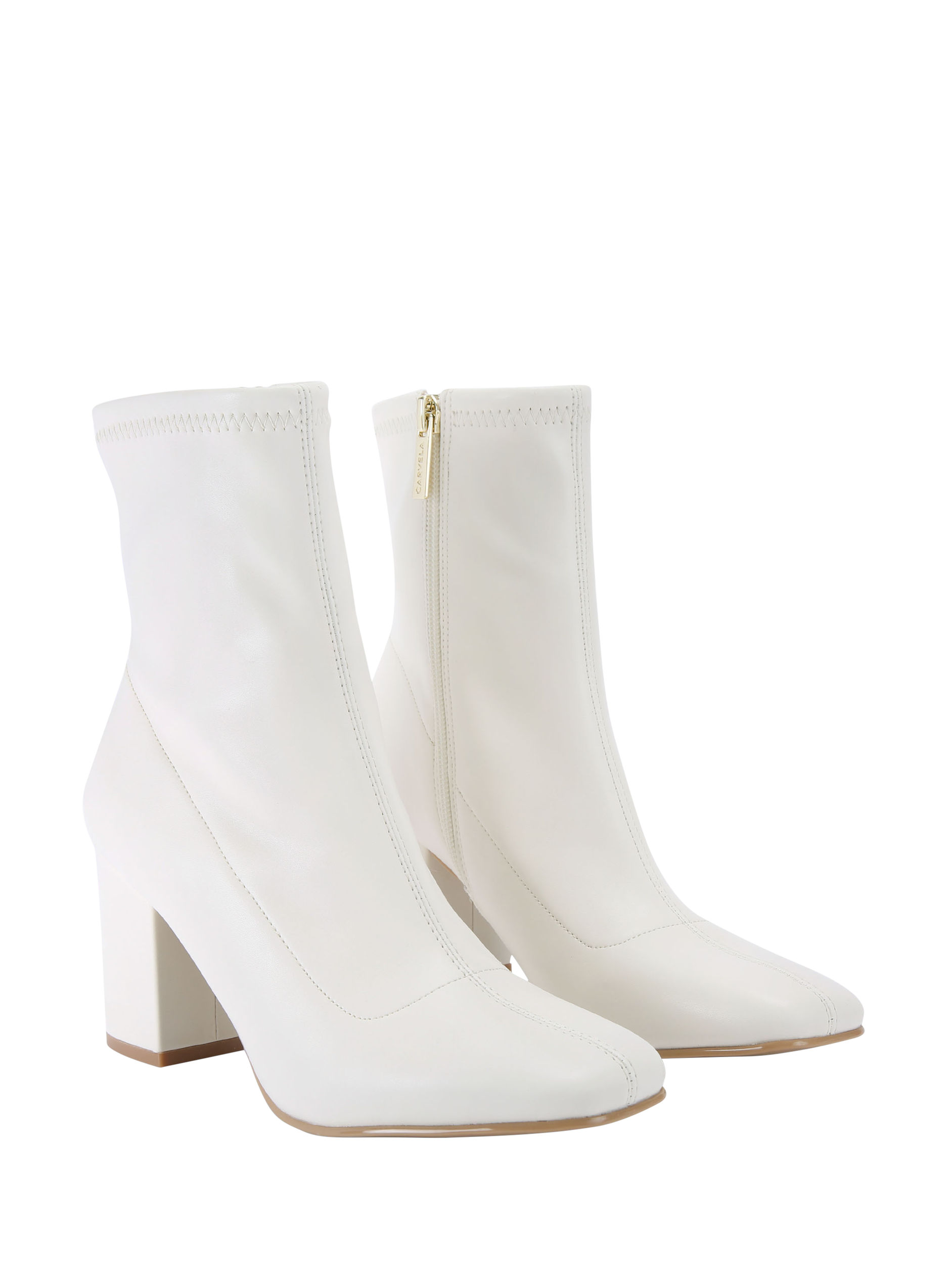 This Strut Ankle boot from Carvela features a white upper with a soft ankle and a softly squared toe. A gunmetal micro Icon C stud is at the back of the ankle.