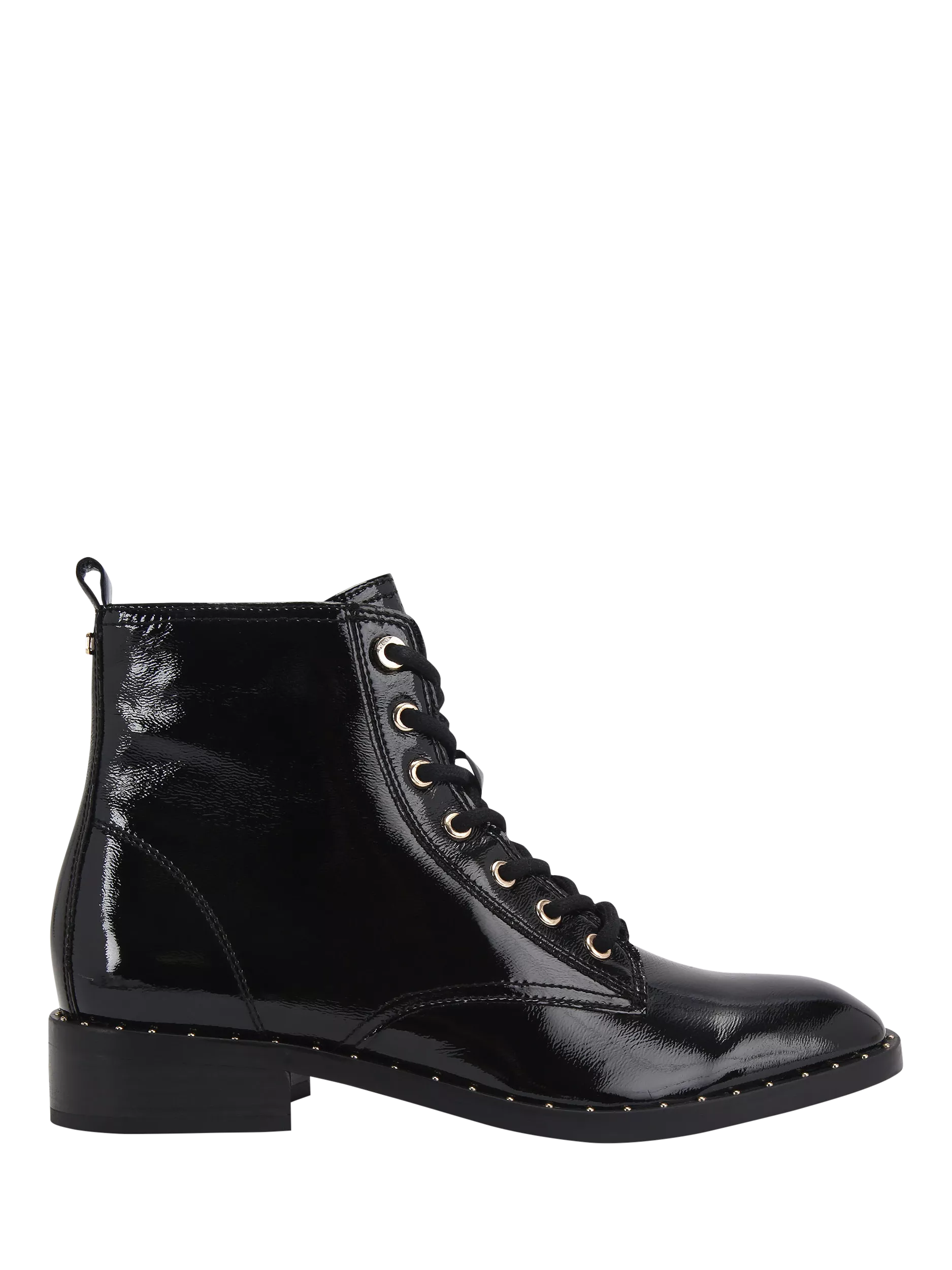 A pair of patent leather ankle boots, featuring a round toe, stud embellished trim and lace-up detailing. The low flat heel offers support, while the side zip fastening makes slipping them on easy for every outing.