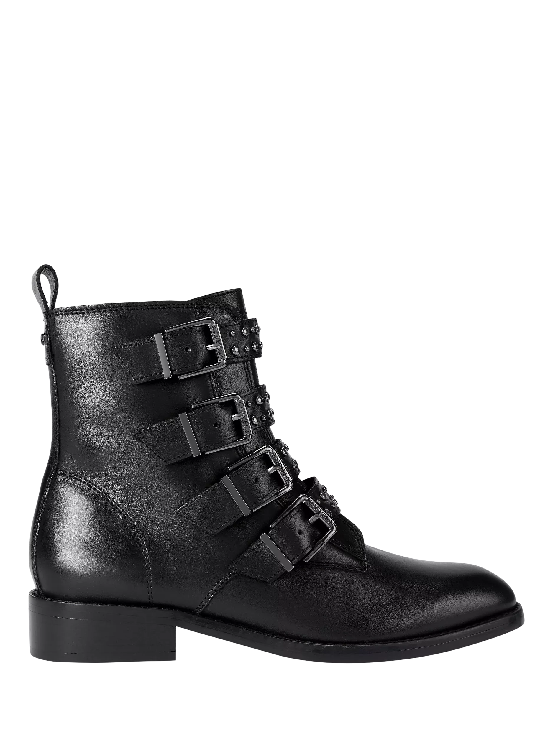 A pair of Carvela ankle boots, crafted from smooth leather and finished with embellished buckles through the front. The low flat heel and round toe give you comfort, making getting ready effortless.