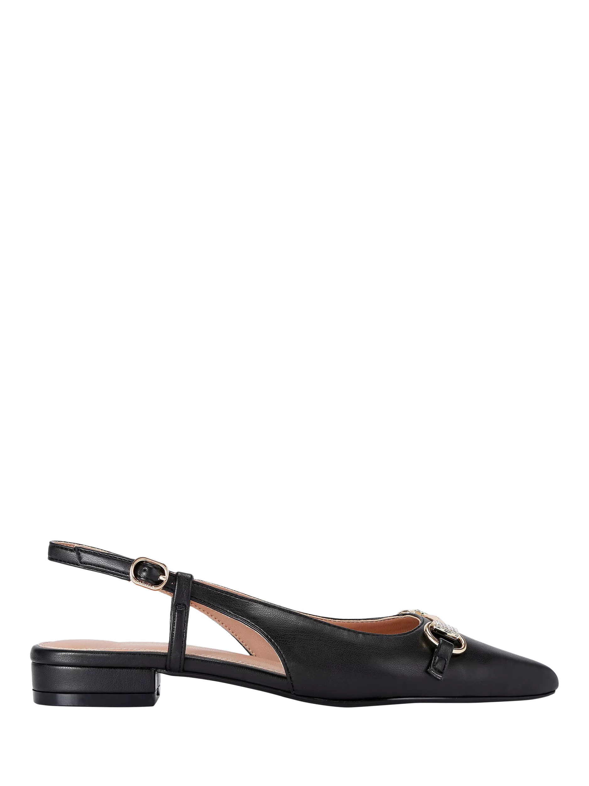Loafers reimagined for comfort and confidence, with a pointed closed toe and a low block heel perfect for day-long wear. In a comfortable adjustable slingback design with an embellished snaffle detail.