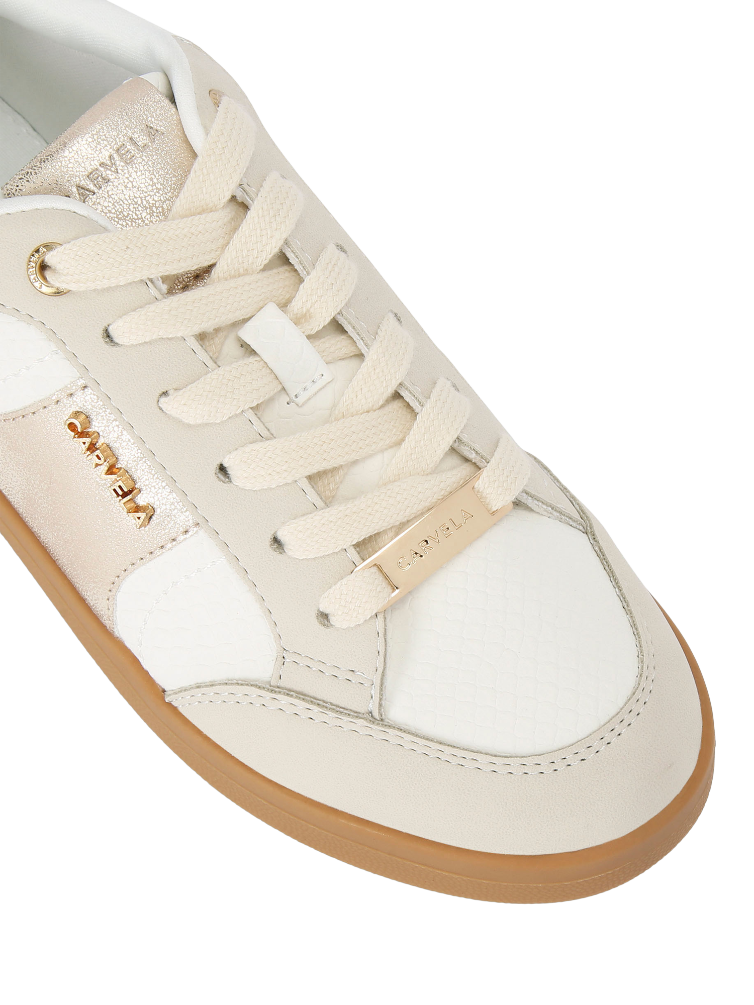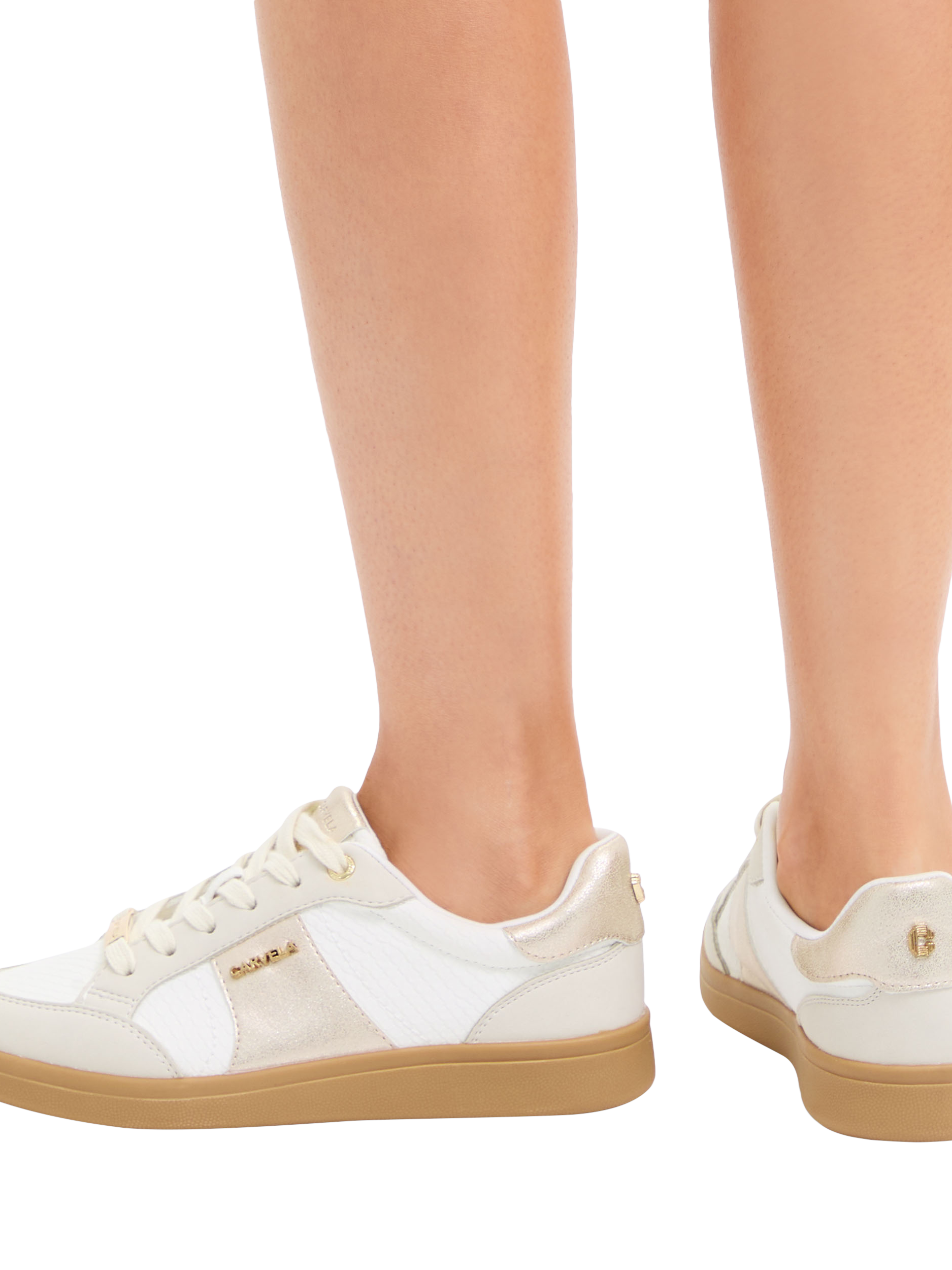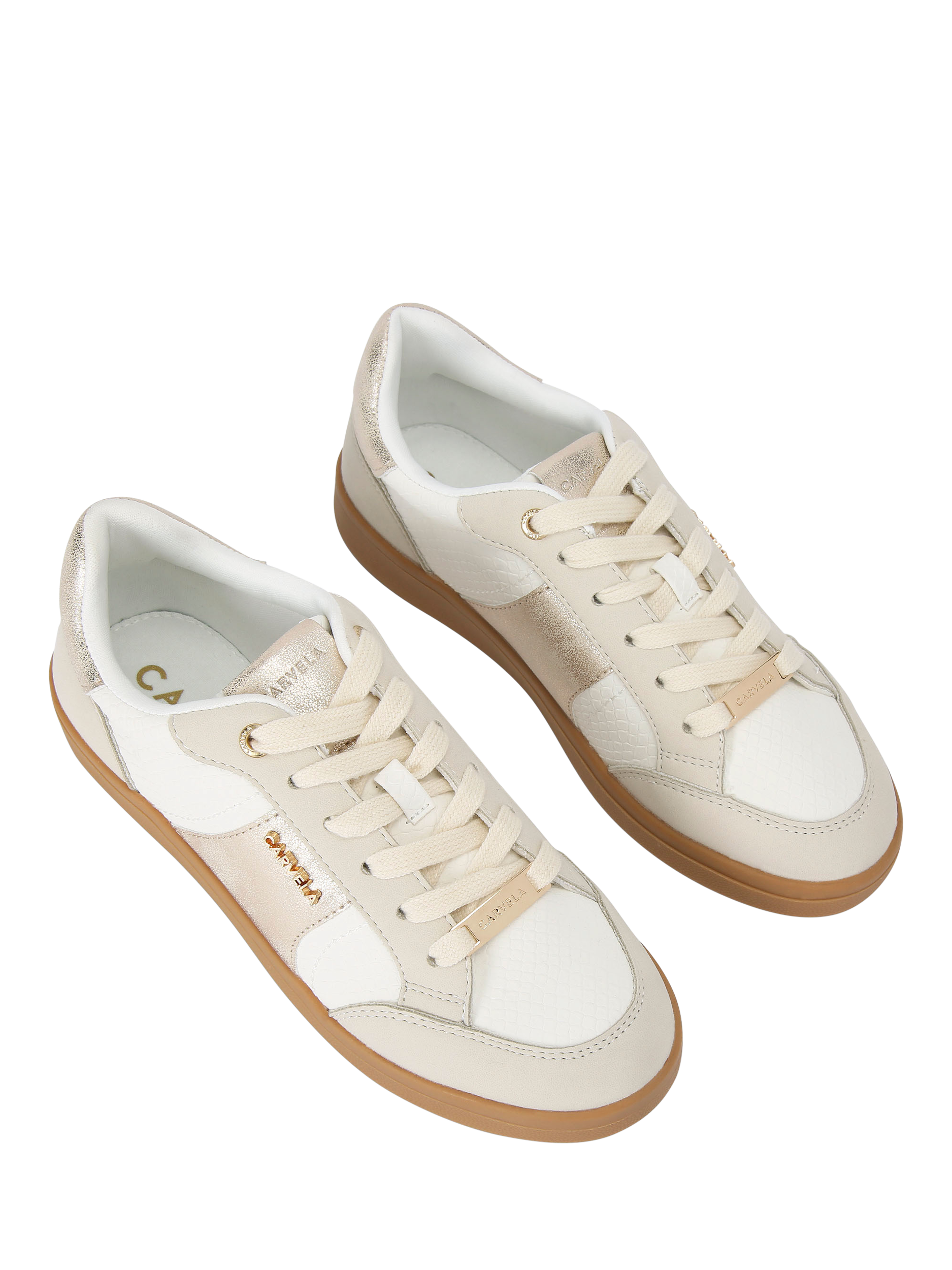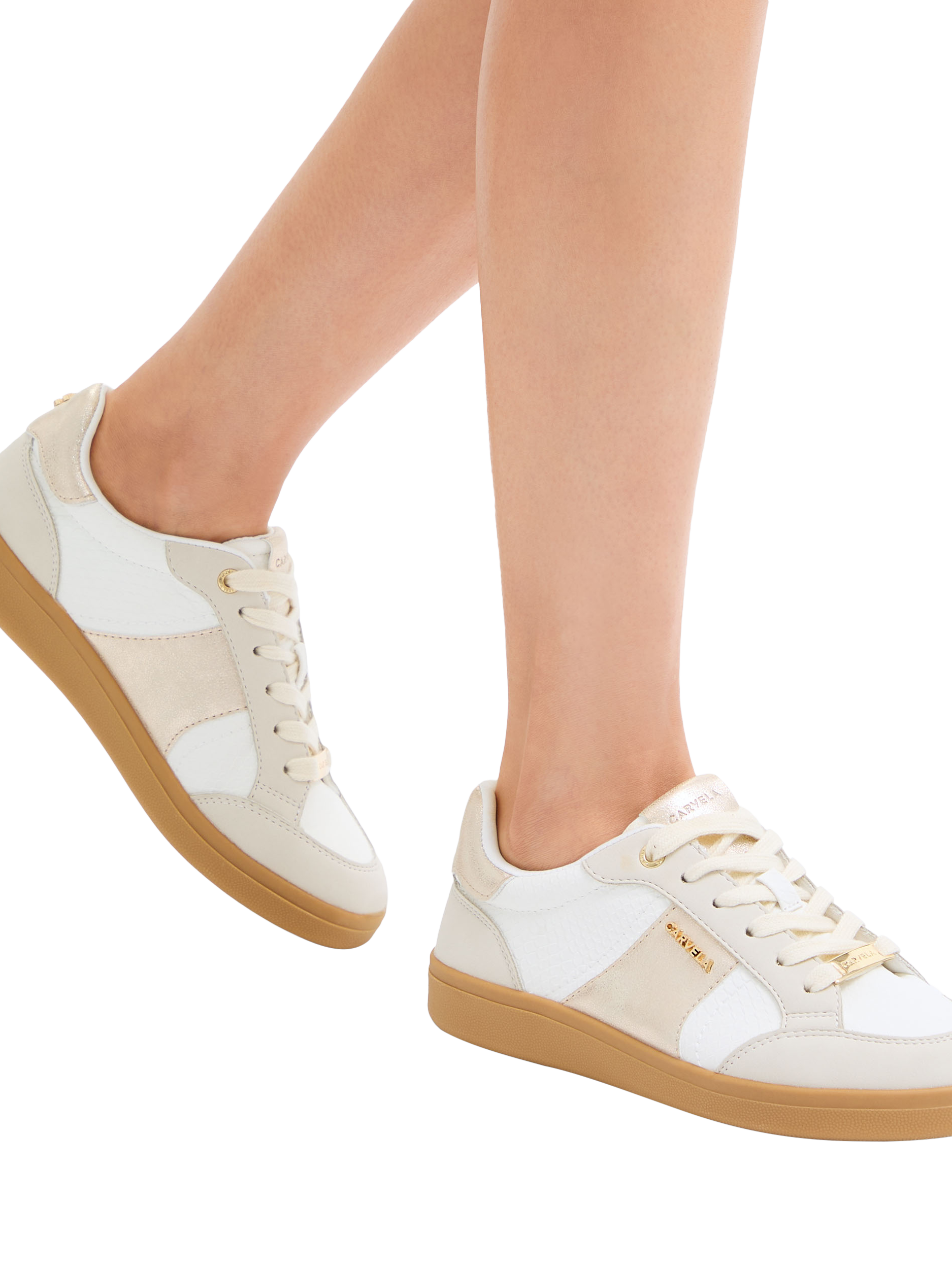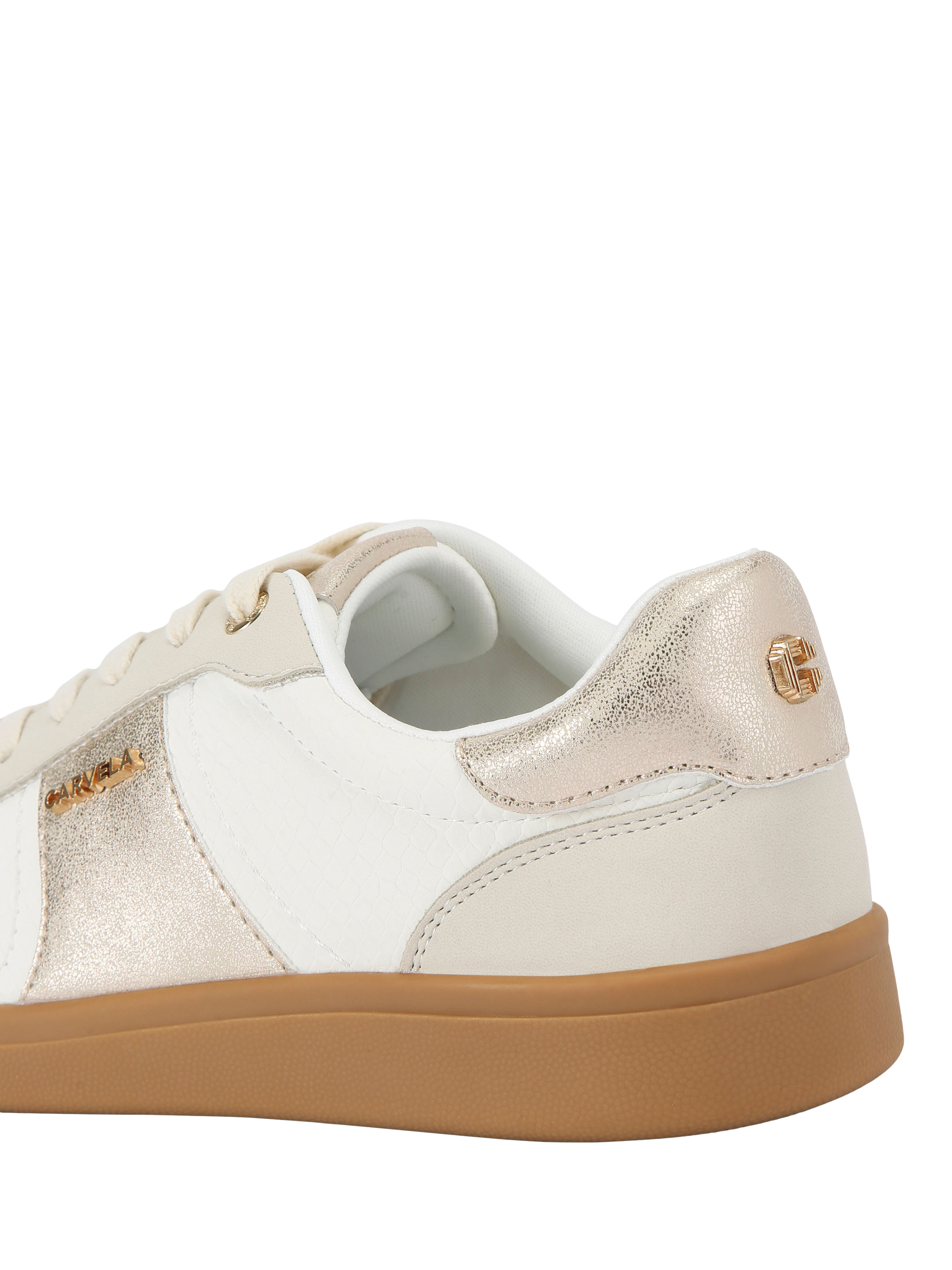 This Veneto Trainer features an upper with white lizard, grey and metallic panels. The front is laced up with a gold branded tab at the bottom. The sole is in a gum style.