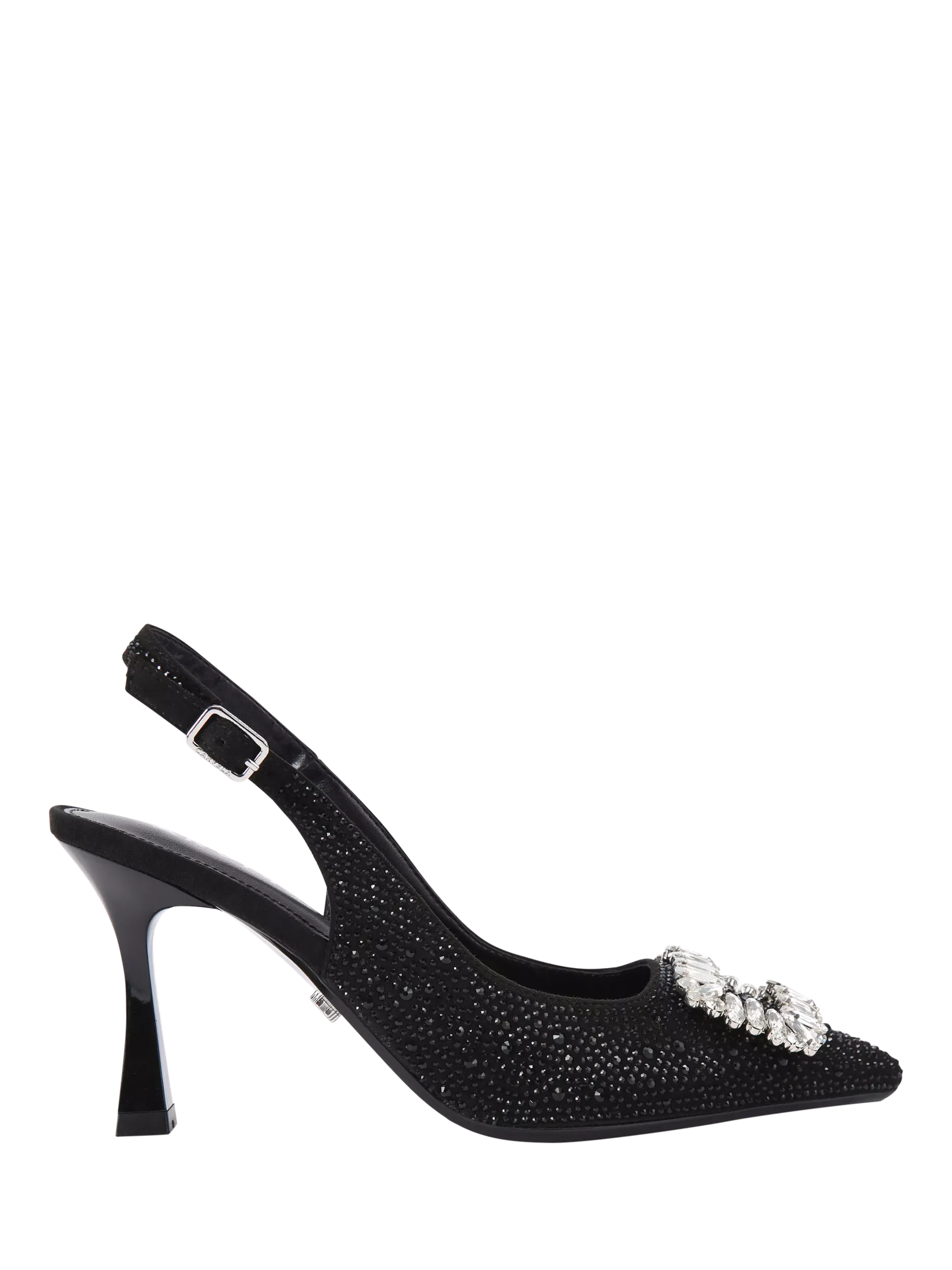 These Virtue slingback courts from Carvela feature a crystal upper and a pointed toe topped with a silver crystal buckle detail. The ankle strap is fastened with a gunmetal buckle.